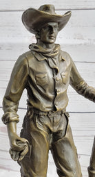 The cowboy looks into the distance as if he has just heard something, a reminder of the constant vigilance required in the untamed wilderness. A knife sits securely on his hip, always ready for whatever challenges the day brings. Every detail in the sculpture beautifully reflects the cowboy's life, from the rough texture of his clothes to the calm, alert posture of a man in tune with the land.