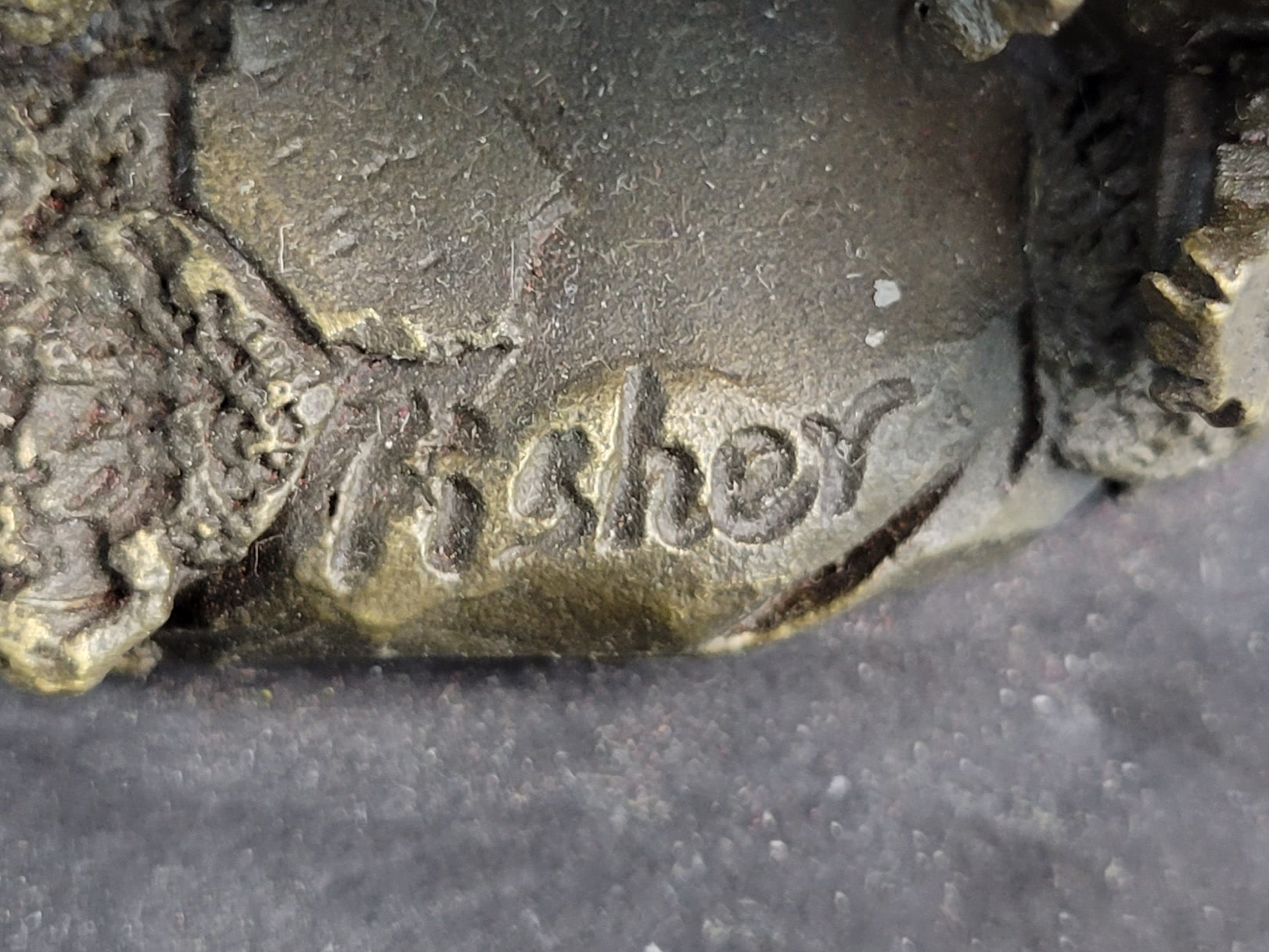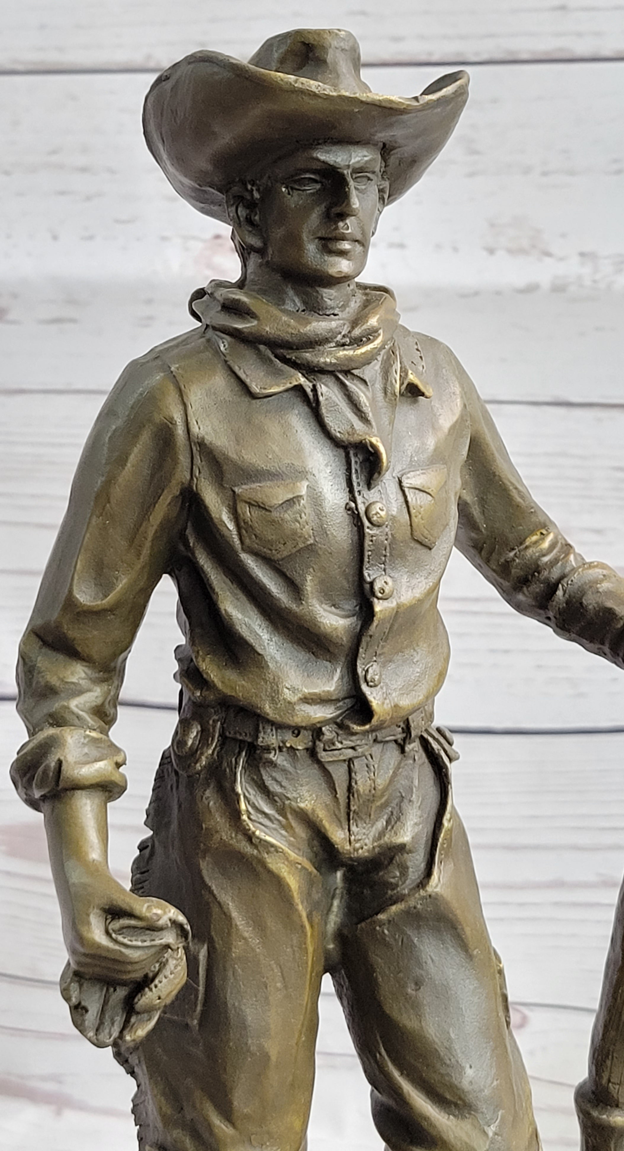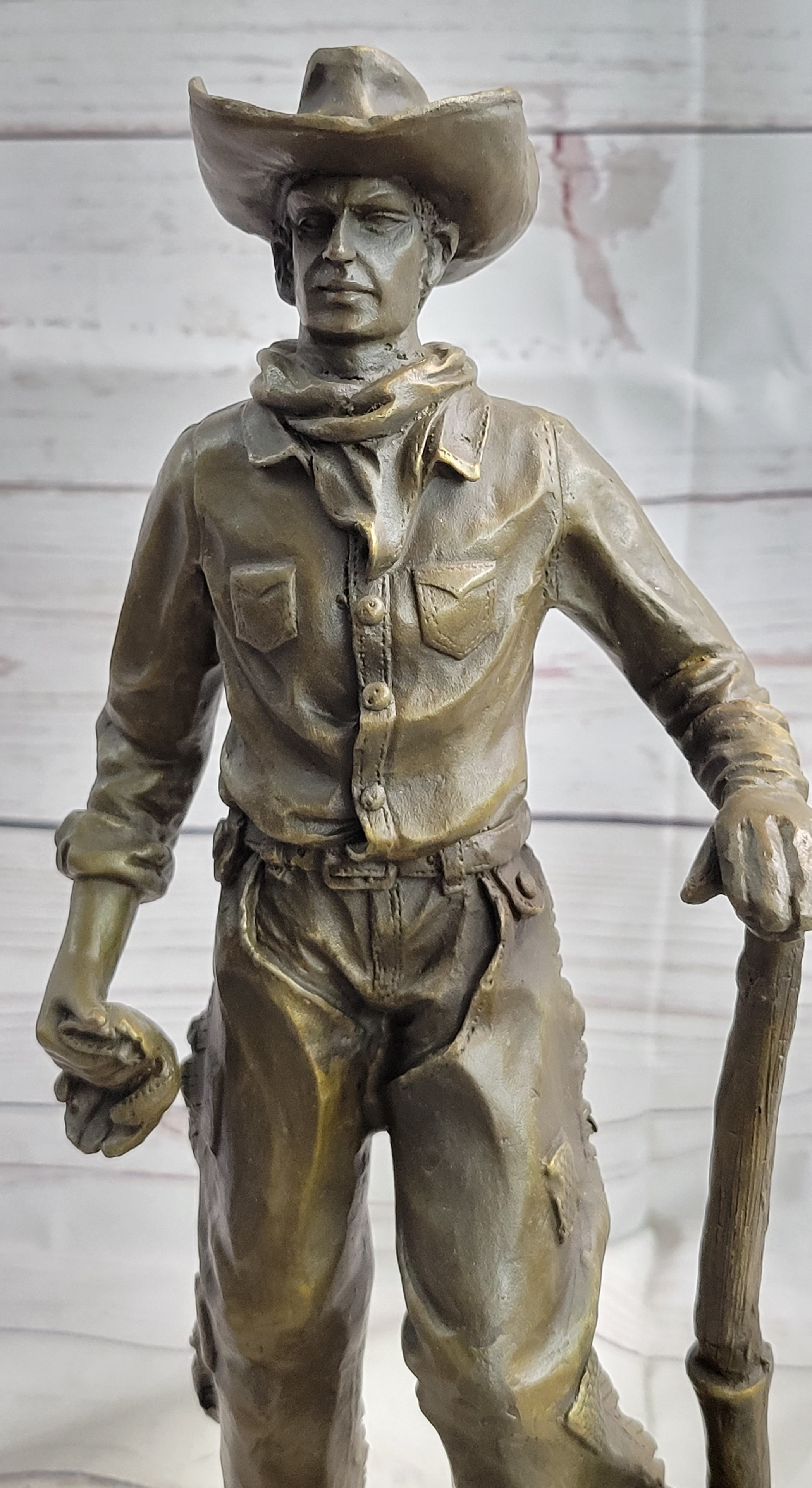 Handcrafted using the "Lost Wax Method", this bronze sculpture boasts a rich brown patina, enhancing its lifelike detail. The piece is mounted on a solid marble base and bears the signature of the artist Fisher, making it a wonderful tribute to the enduring legacy of the American cowboy.Bronze Dimensions with Marble Base: Height 12" X Width 5"