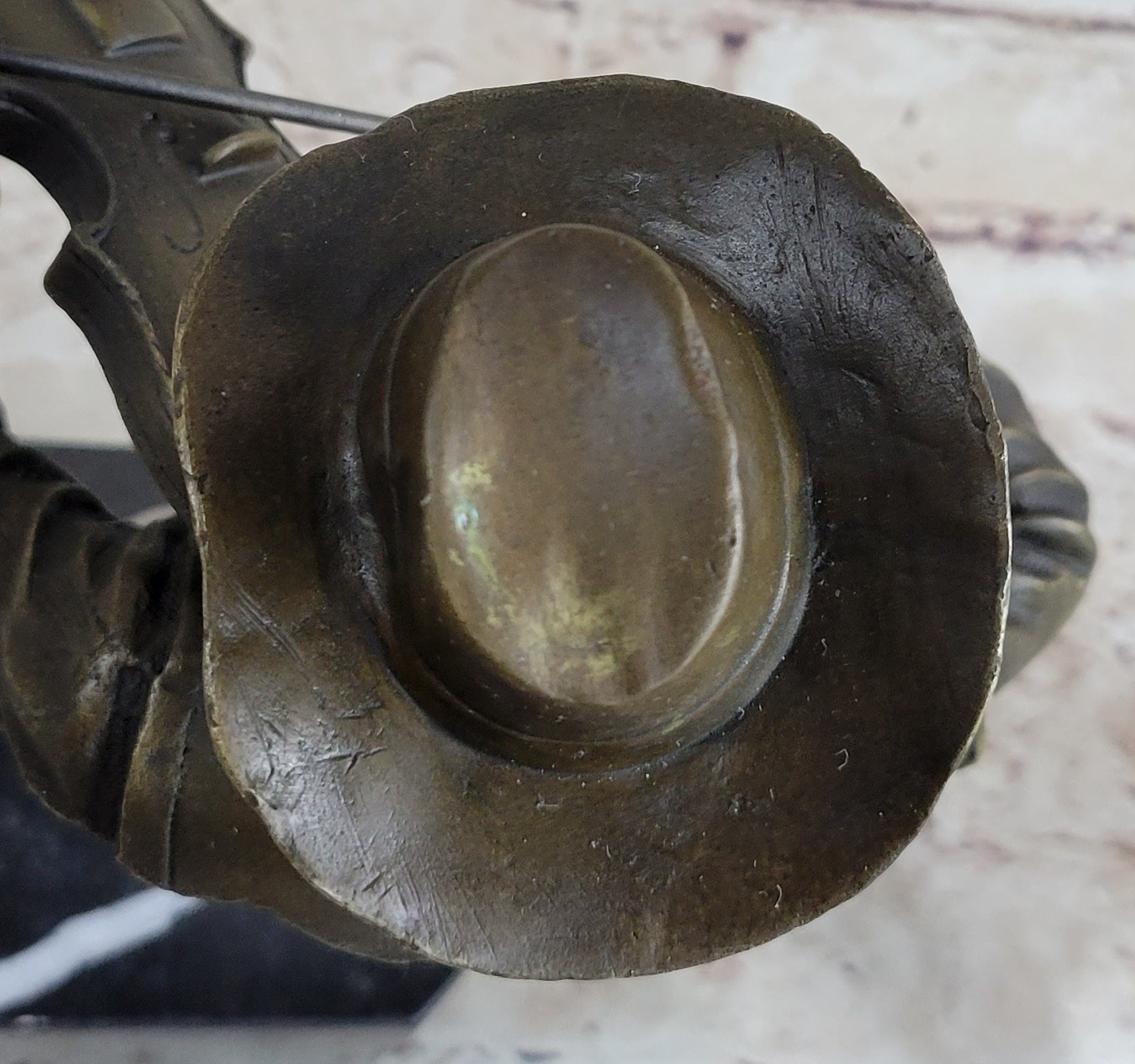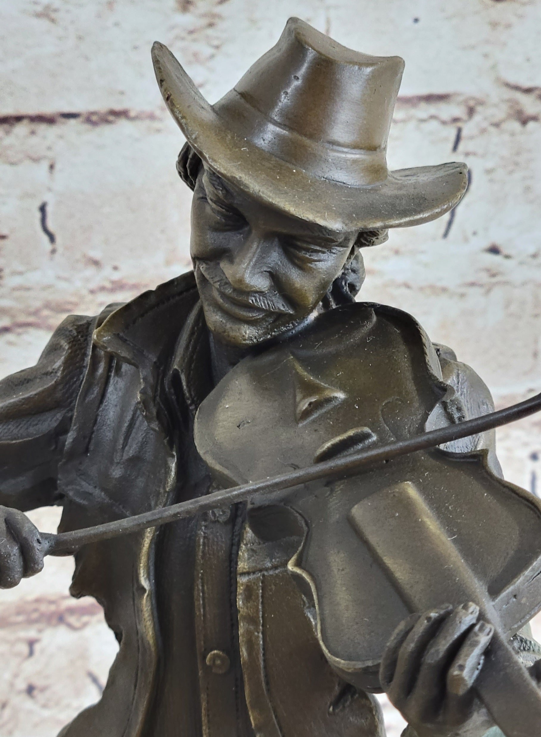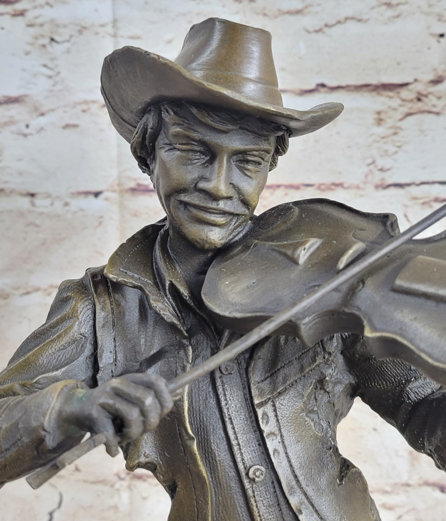 Dressed in a button-down shirt and a classic cowboy hat, the violinist embodies a blend of rustic charm and timeless elegance. The sculpture was meticulously handcrafted using the ancient "Lost Wax Method," ensuring exceptional detail and quality. A rich brown patina finish enhances its depth and character, preserving its beauty for generations.