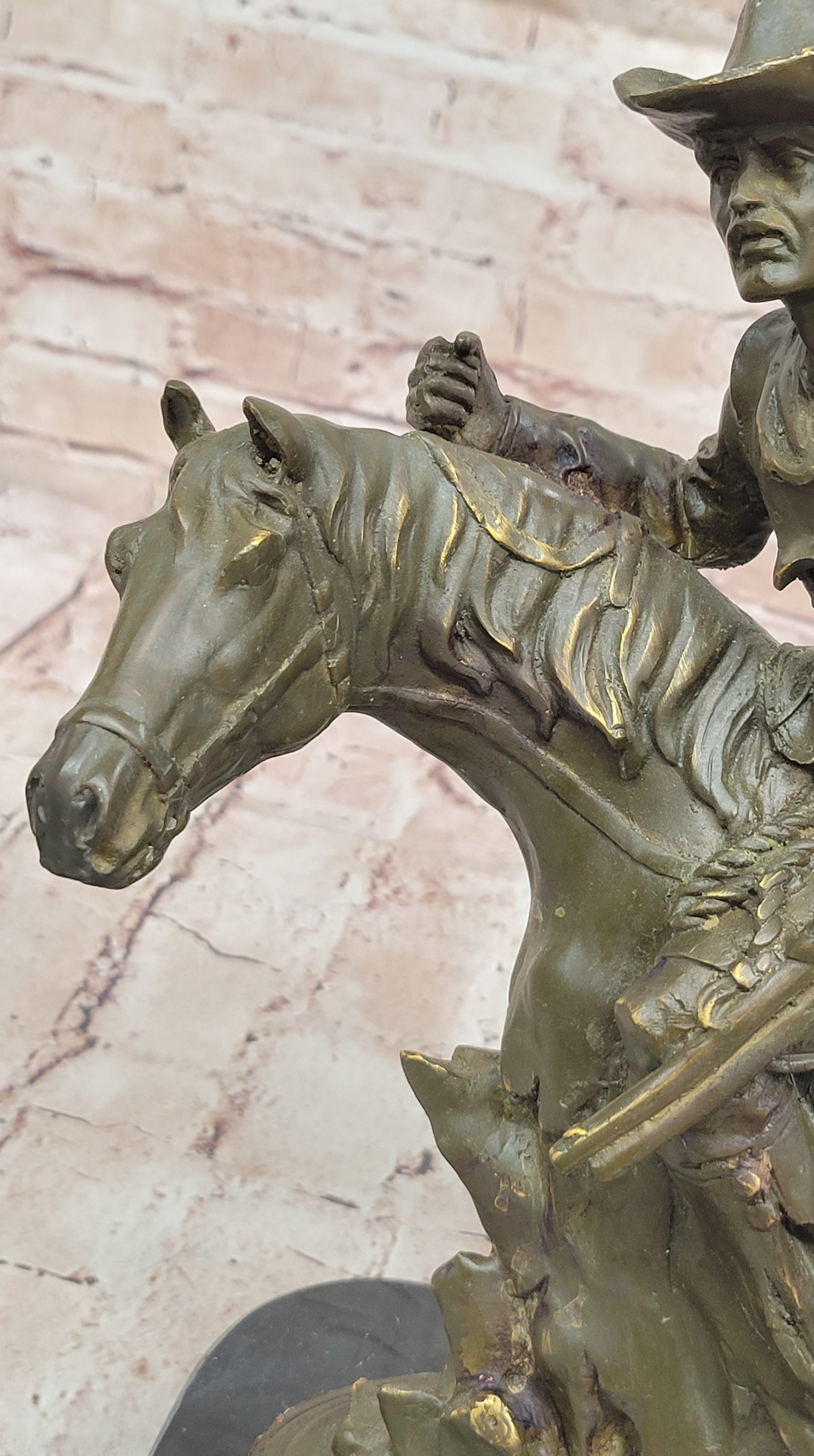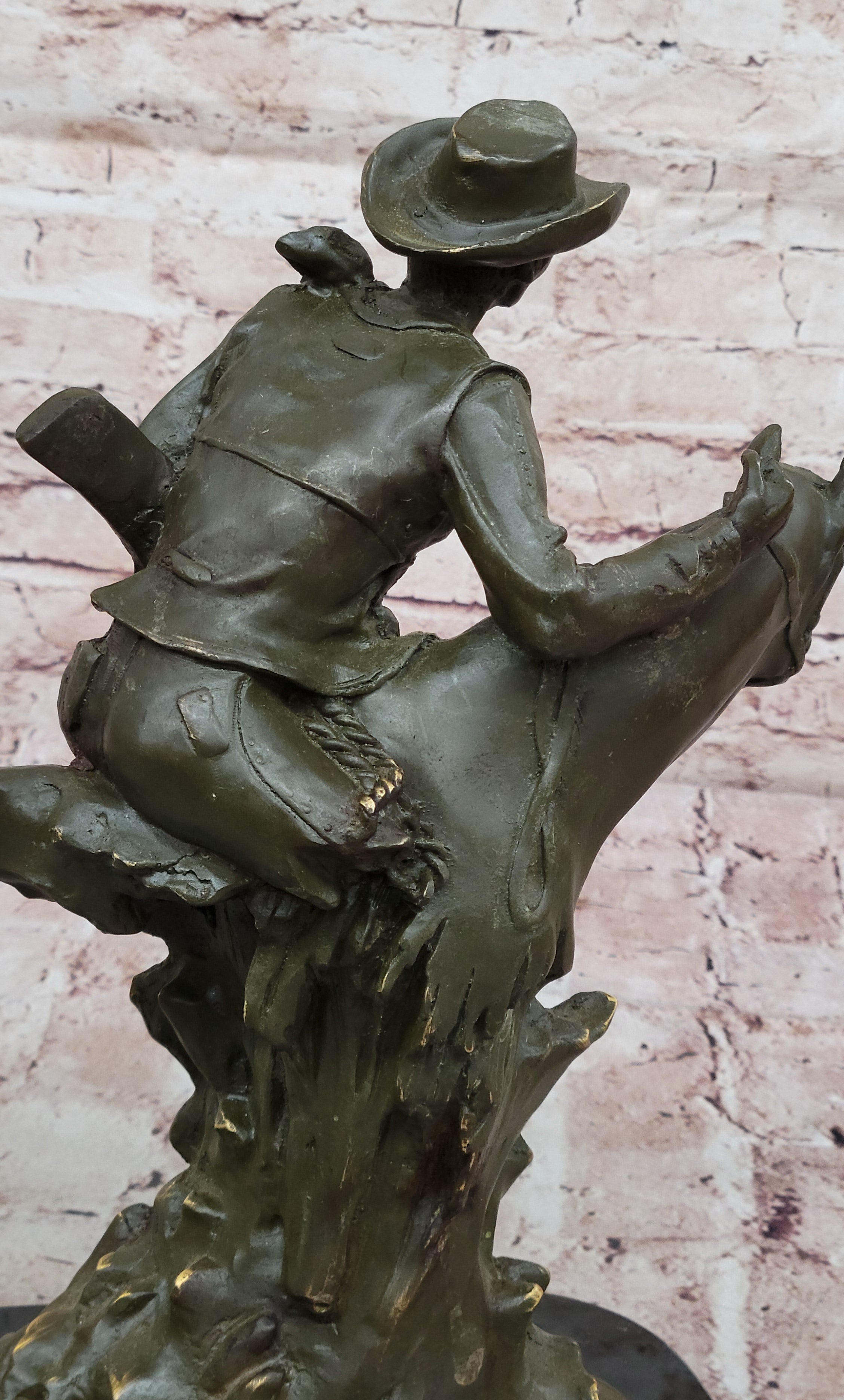Crafted entirely from 100% bronze using the time-honored lost wax method, this piece features a rich brown patina that brings warmth and realism to the surface texture. From the folds in the cowboy's clothing to the fine musculature of the horse, every detail is finely sculpted and highlighted by the patina’s natural tonal variations.