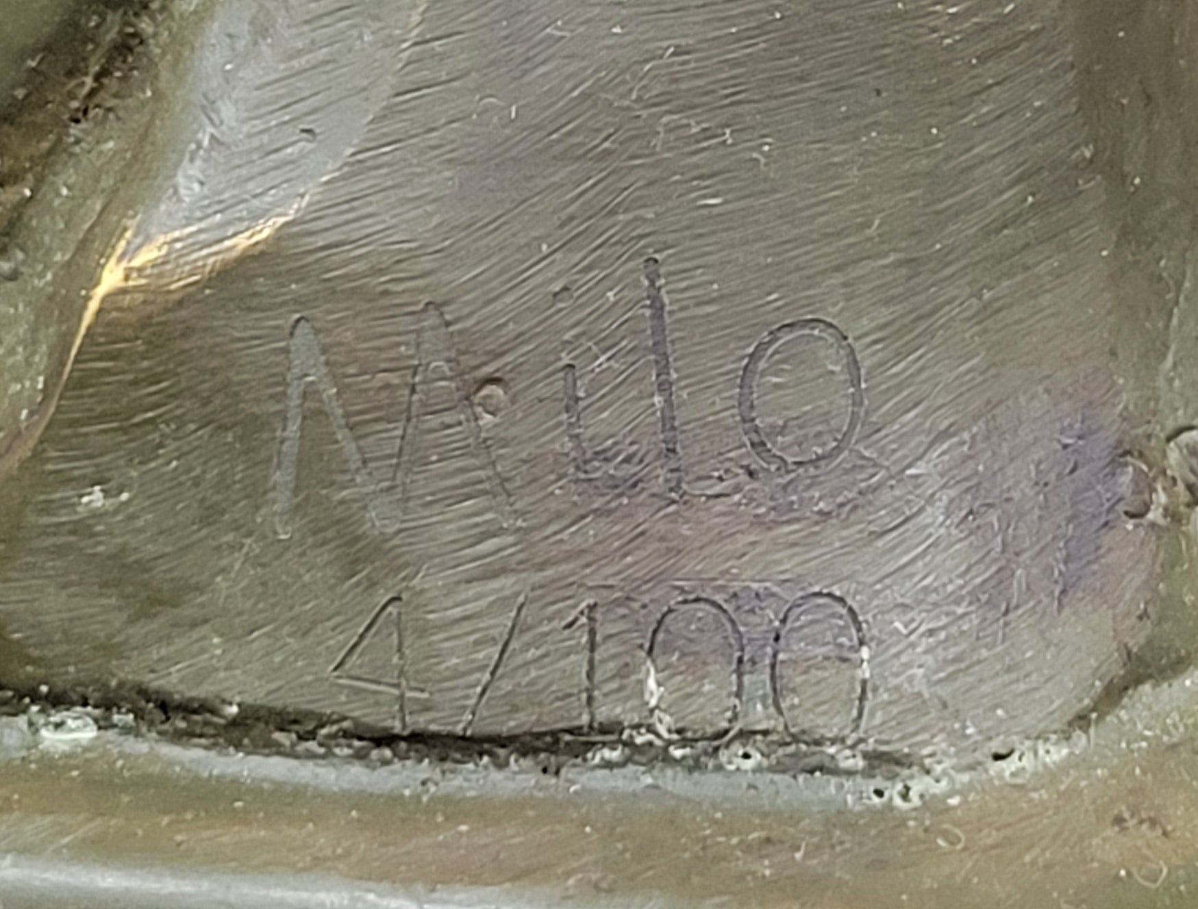 Signed and numbered by the artist Milo, this limited edition statue rests securely on a polished black marble base, enhancing its presentation and making it a striking focal point for any Western art collection, home, or office display.Bronze Dimensions with Marble Base: Height 13.5" X Width 9"