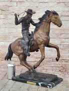 Crafted with unwavering attention to detail, this exceptional sculpture is meticulously handmade from 100% bronze, ensuring its lasting quality and durability. The renowned "Lost Wax Method" was employed in the casting process, capturing the intricate textures and nuances of the cowboy's attire and the horse's majestic form. Enhanced with a rich brown patina finish, the sculpture radiates warmth and authenticity. It proudly rests on a sleek black marble base, providing a sturdy foundation that complements the artwork's dynamic composition. The sculpture bears the signature of the esteemed artist, Fredrick Remington, further attesting to its artistic value and pedigree.