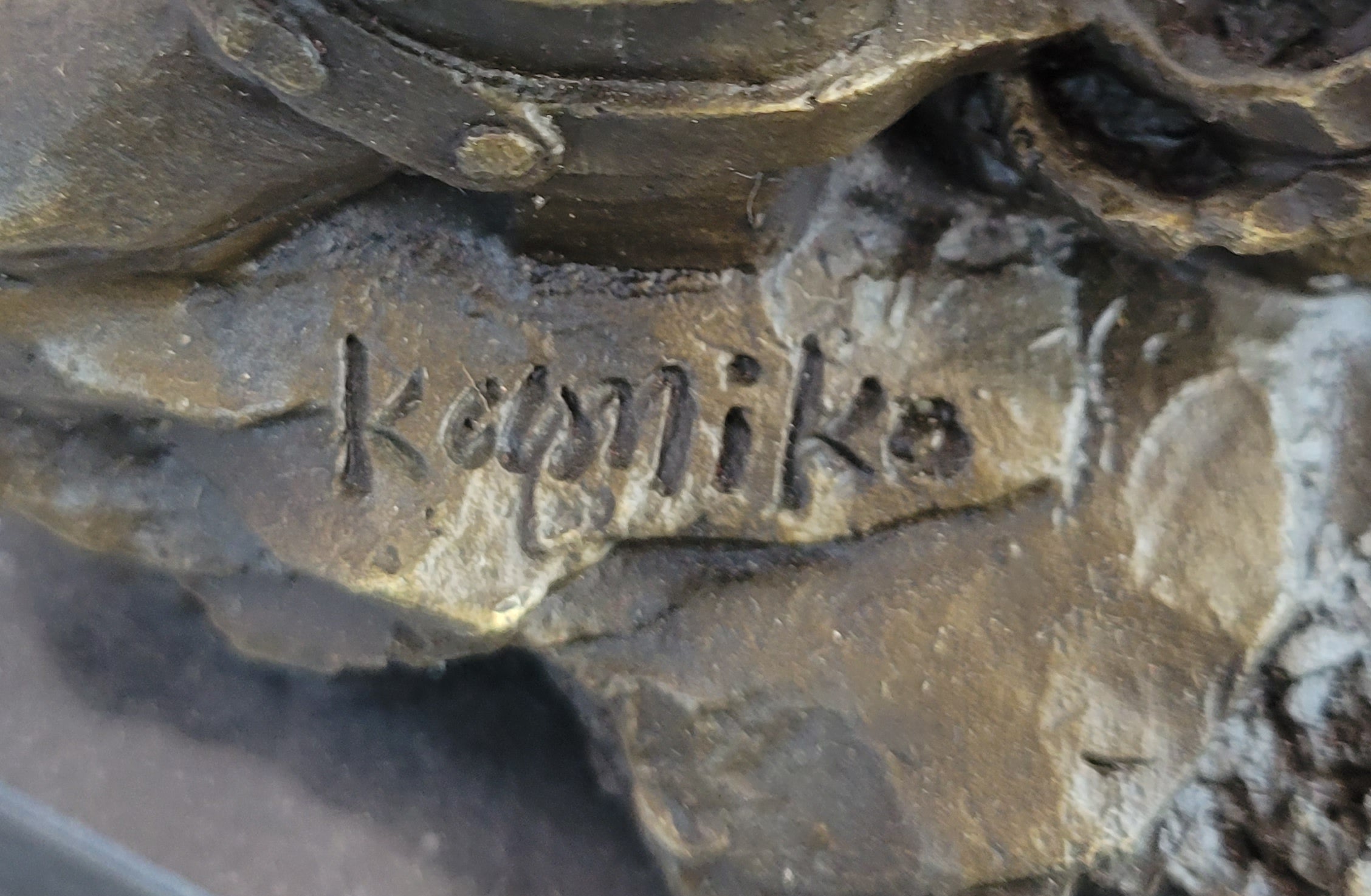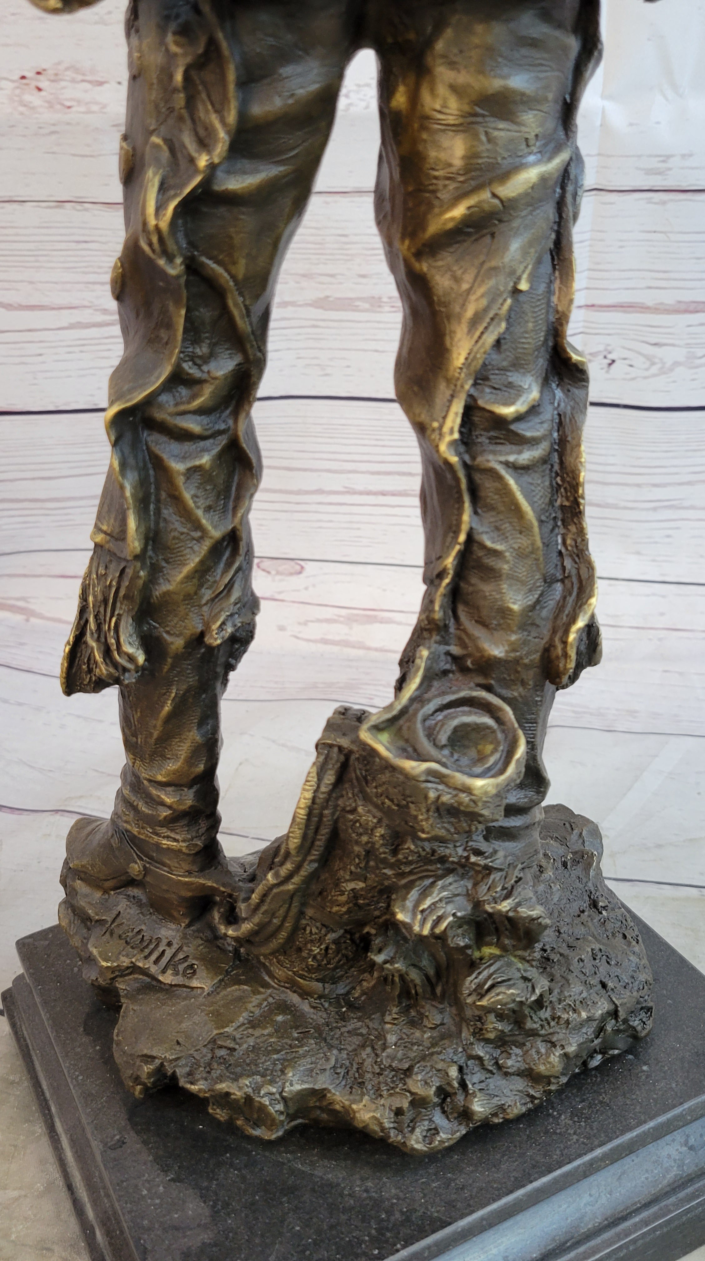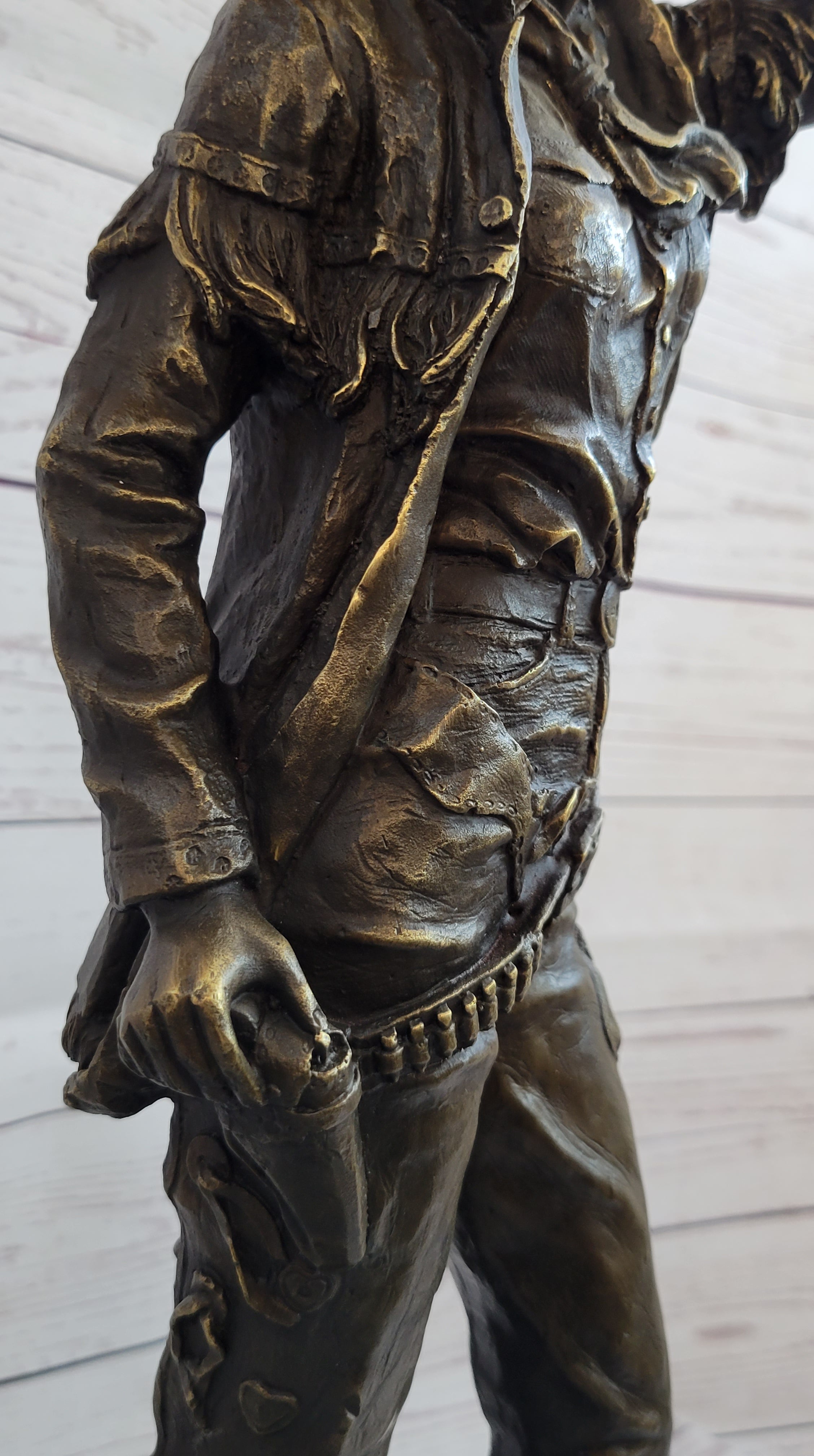 With a firm grip, she holds her gun, her gaze fixed in the distance, capturing a moment of heightened alertness. This exquisitely crafted sculpture encapsulates the essence of the Cowgirl lifestyle with intricate details that captivate the viewer's imagination. Crafted using the renowned "Lost Wax Method," the sculpture showcases the mastery of the artist, Kamiko, and features a rich brown patina.Bronze Dimensions with Marble Base: Height 21.5" X Width 7"