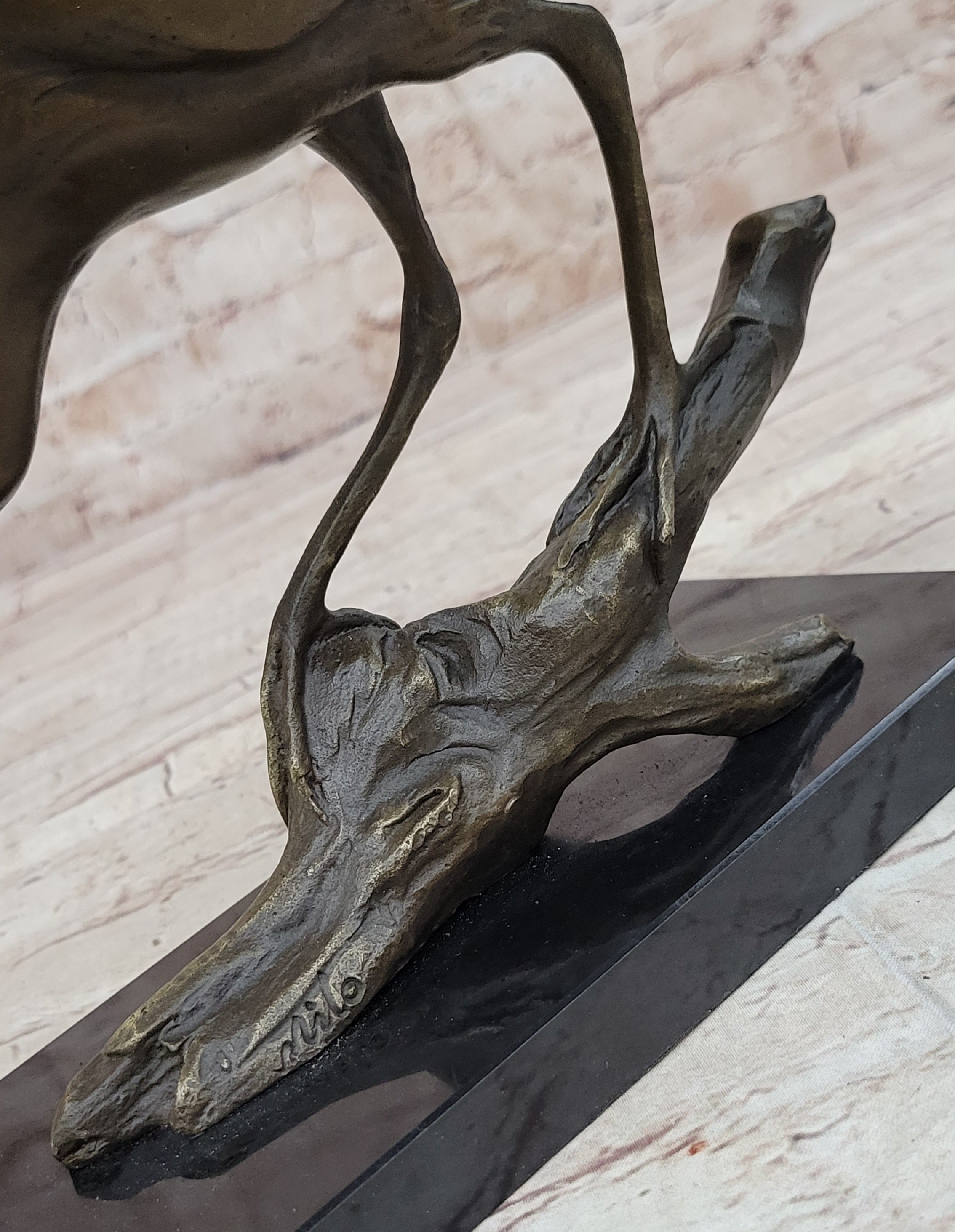 Resting atop a sleek black marble base, this sculpture is not only a stunning decorative piece but also a tribute to the artist's mastery. The base provides a stable foundation, allowing the sculpture to take center stage in any environment. Adorned with the signature of the acclaimed artist Milo, this piece stands as a testament to his creative brilliance. Whether displayed in your home, office, or as a thoughtful gift, "Wading Bird in Flight" is a timeless embodiment of the wetlands' allure, inviting a sense of tranquility and appreciation for the natural world into your space.Bronze Dimensions with Marble Base: Height 9" X Width 8"