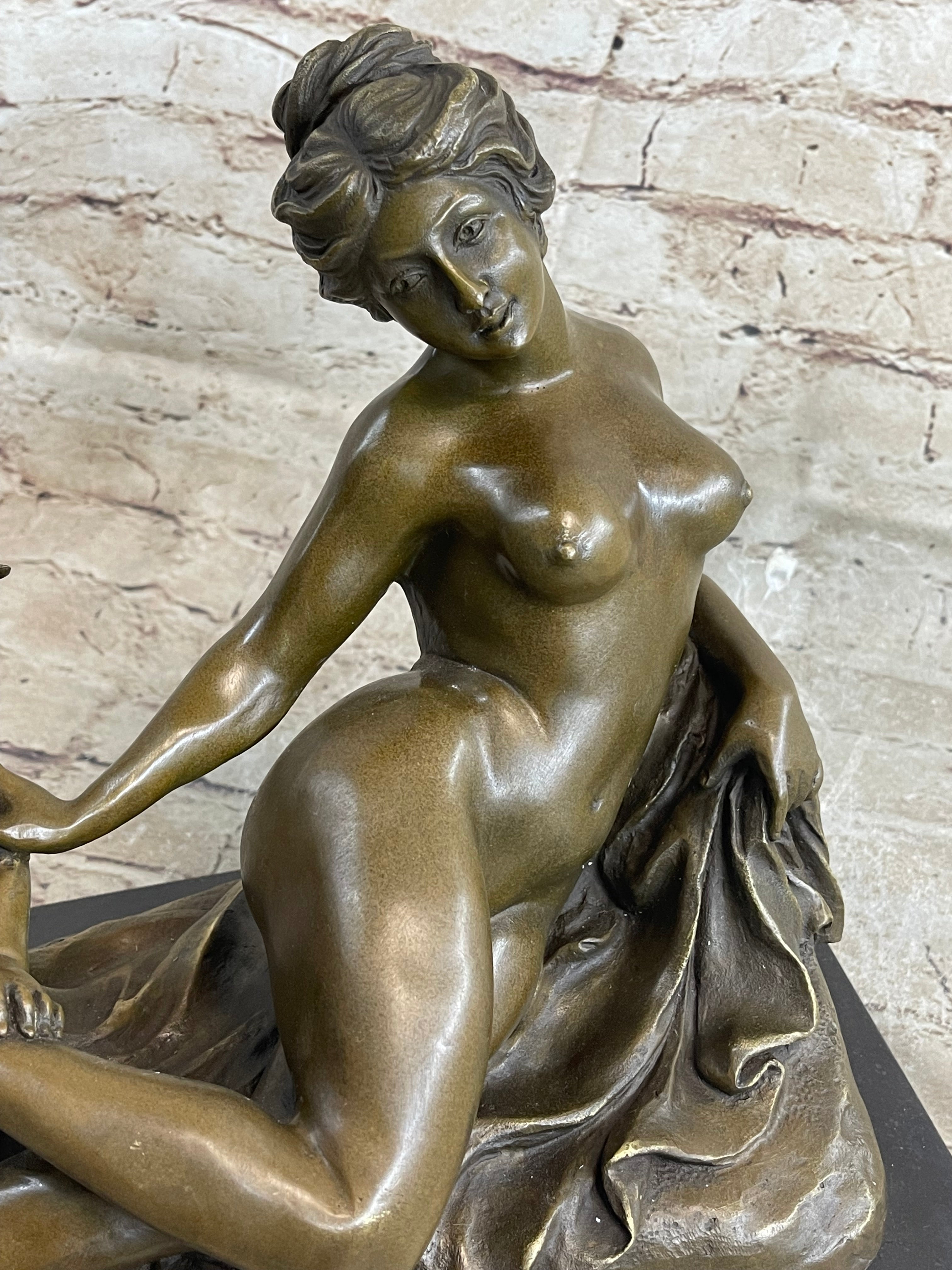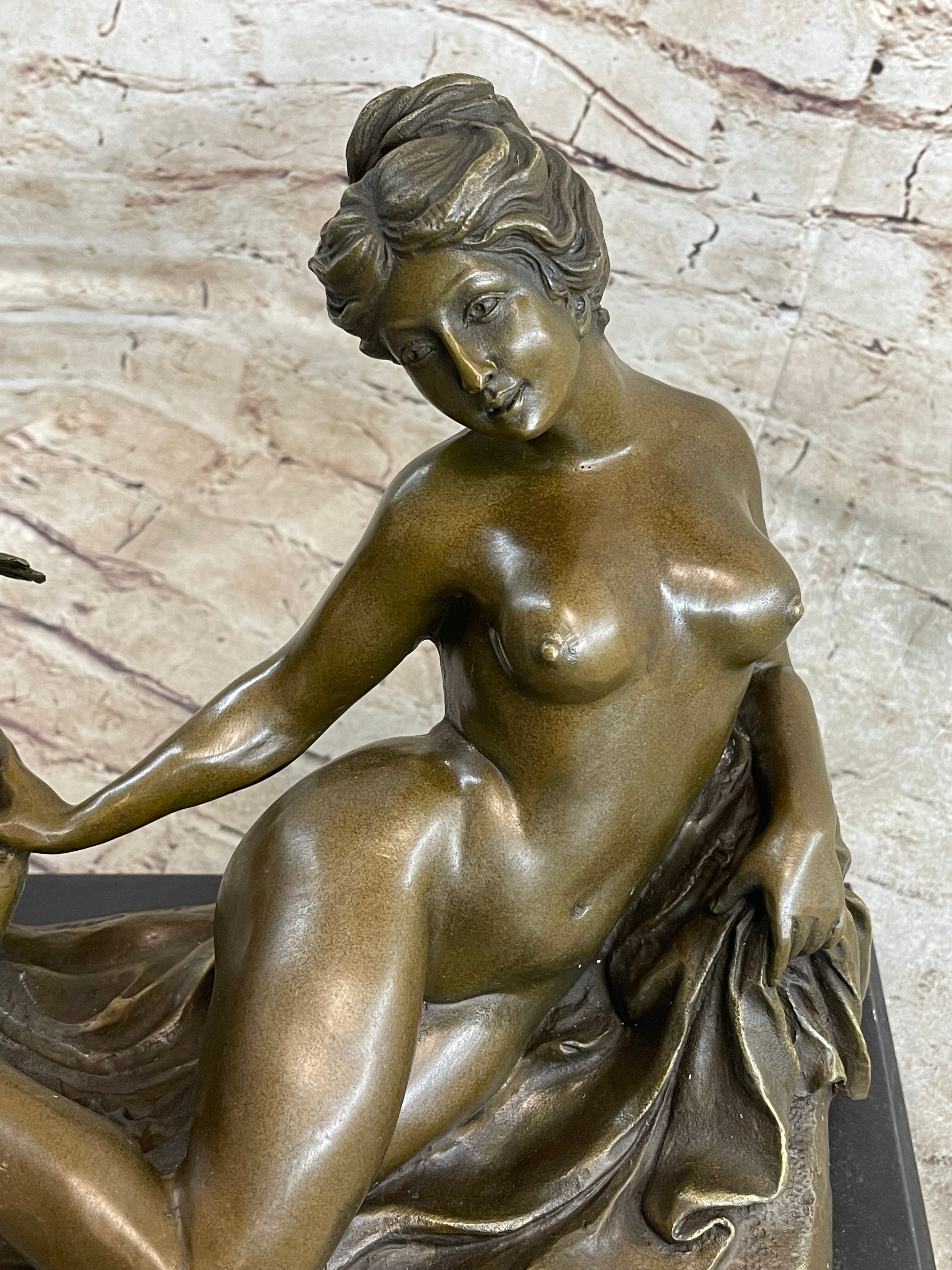 A cherub and a nude woman lay playfully on a long seat. The cherub is gazing lovingly towards the woman. Her nude body is plump and feminine displaying natural curves. The cherub has come stand by her side. This is a 100% bronze sculpture that rests on a black marble base and is signed Gossin.Bronze Dimensions with Marble Base: Height 11" x Width 12"