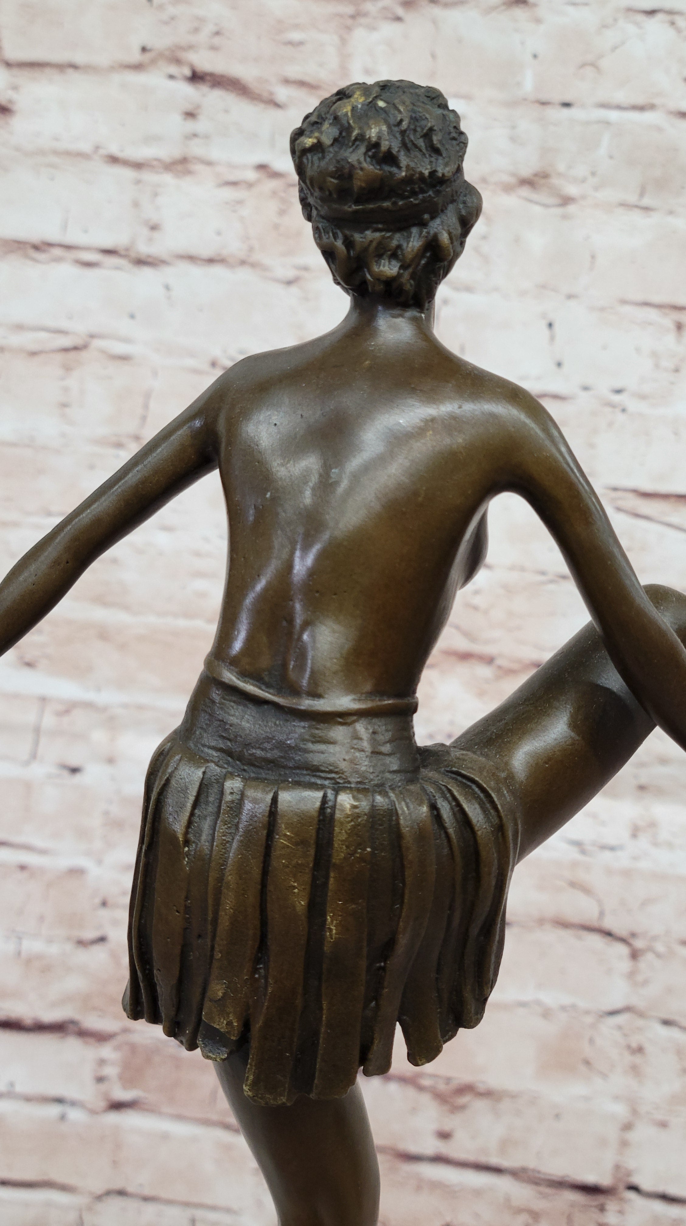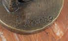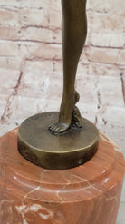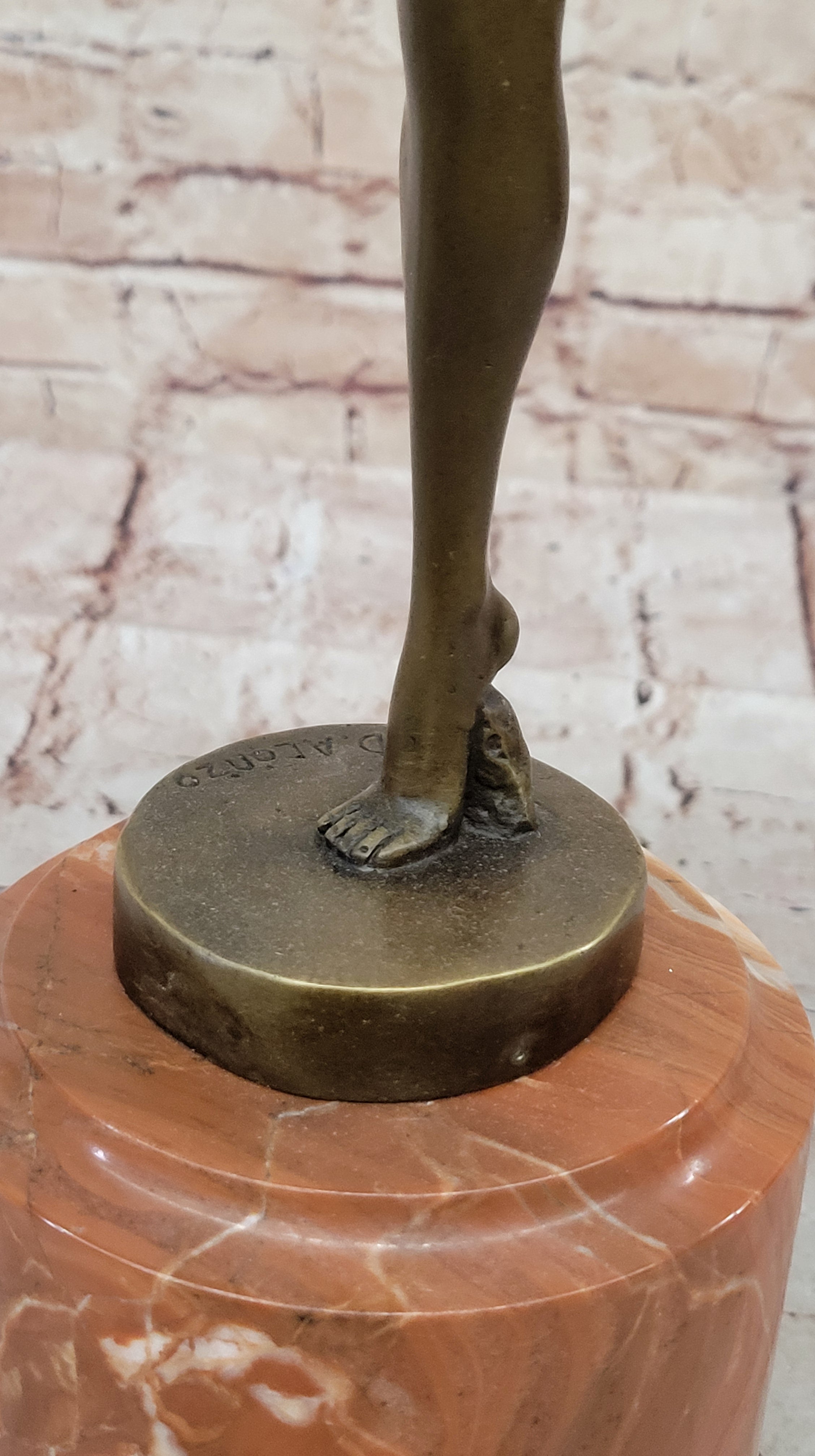 The dancer's performance exudes a sense of joy and lightness as she skillfully navigates the stage. With her head slightly slanted to the left, she lands soundlessly on her toes, creating the illusion of an erotic dance with her chest exposed. The choice of a Roman-style shirt and hat adds a touch of classical elegance to the composition. The sculpture is bathed in a brown patina, enhancing the fine details and providing warmth to the overall presentation. Mounted on a black and fire-red marble base, the artwork becomes a focal point, exuding sophistication and flair. The signature of the artist, D. Alonzo, further authenticates this 100% handmade masterpiece, crafted with precision using the "Lost Wax Method."