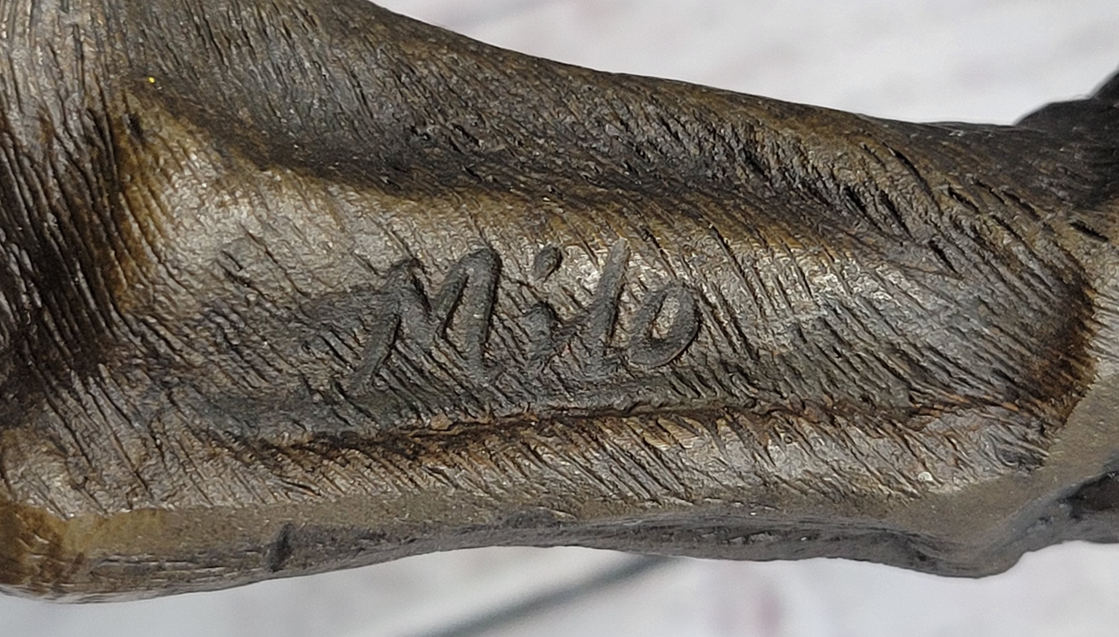 The dog's expressive eyes and proud face reveal its deep affection and dedication to its loving owner. Handcrafted using the traditional "Lost Wax Method" and signed by the renowned artist Milo, this sculpture is a true work of art. Made from 100% bronze with a rich brown patina finish, it exudes quality and artistry.