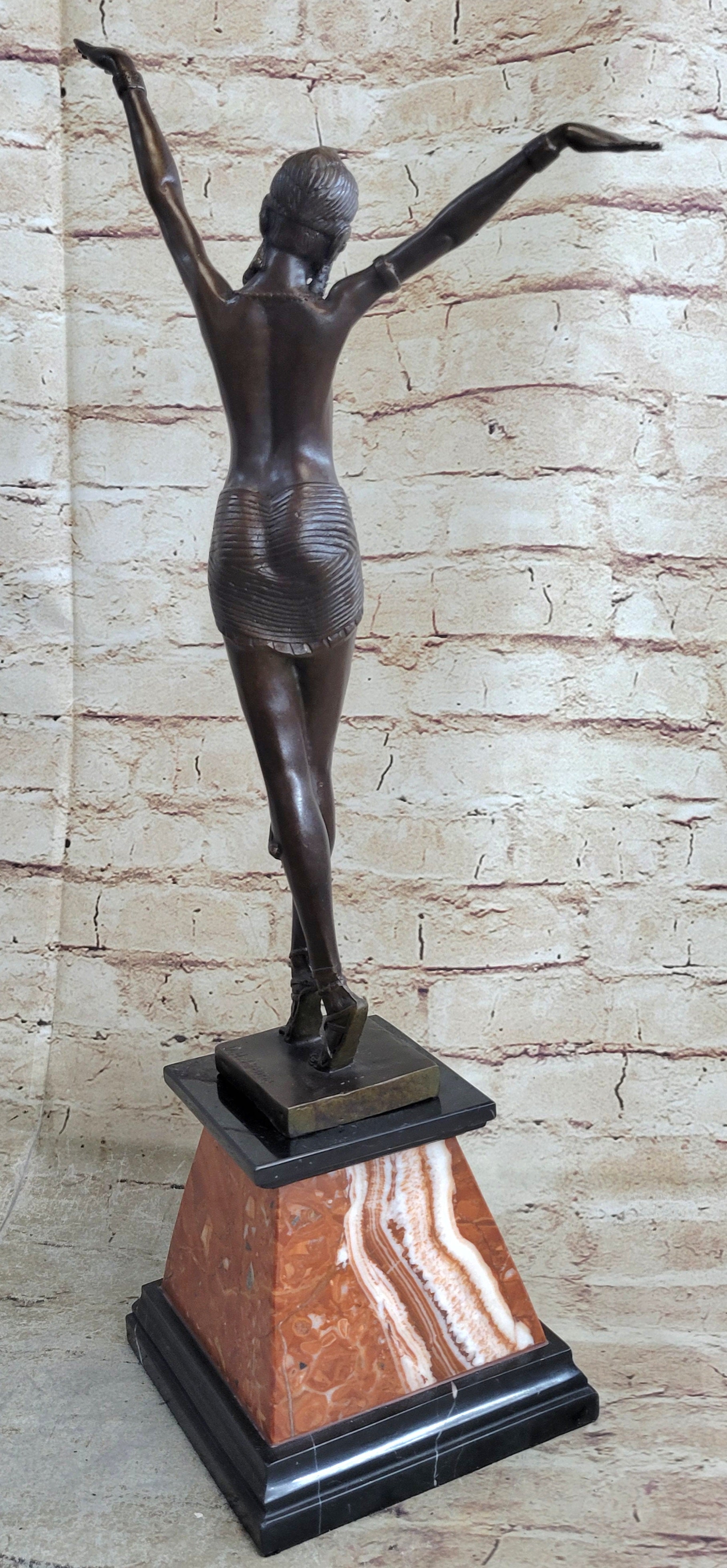 Resting atop a red Tennessee marble base, the sculpture finds a harmonious blend of materials that accentuate its visual appeal. The inclusion of the artist D.H. Chiparus's signature further underscores the sculpture's quality and artistic provenance. A captivating tribute to the art of dance and the mastery of bronze sculpting, this piece is an ideal addition to any collection that appreciates the timeless beauty of the human form in motion.Bronze Dimensions with Marble Base: Height 21" X Width 10"