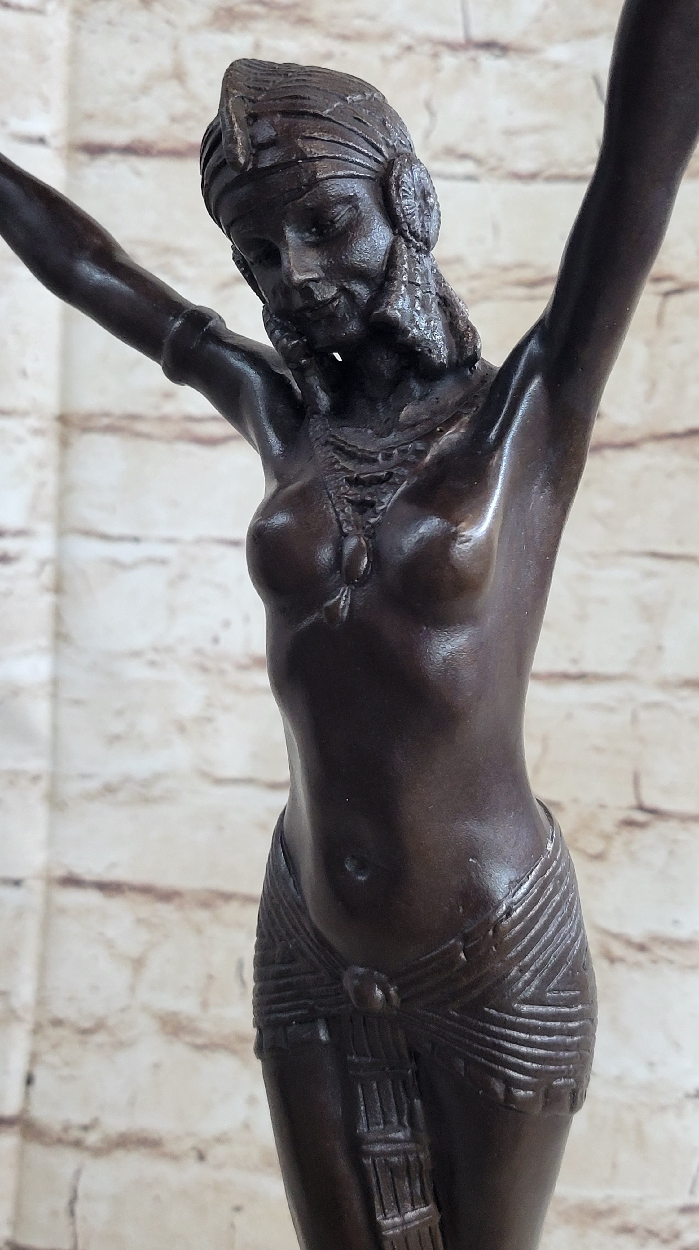 Elegance and allure converge in this captivating bronze sculpture, depicting a mesmerizing belly dancer in a spellbinding pose. With both arms gracefully extended above her head, the dancer tiptoes forward with an air of seduction, her costume adorned with delicate beads that jingle in harmony with her alluring movements. This sculpture captures the very essence of the dancer's art, evoking a sense of enchantment and mystique.