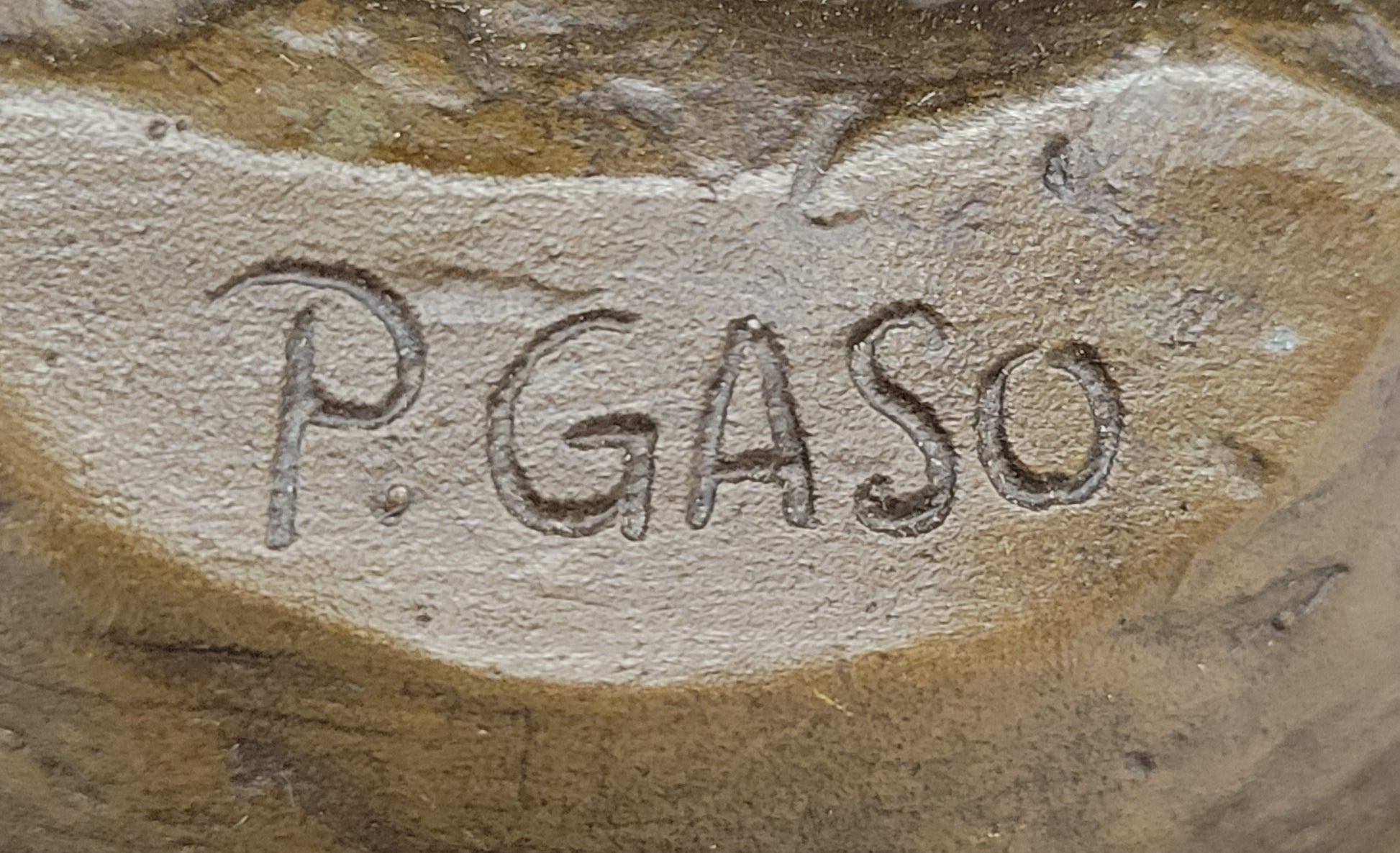 Resting proudly on a round black marble base, this sculpture becomes a focal point of elegance and sophistication. The circular foundation complements the fluidity of Diana's form, providing a harmonious balance to the overall presentation. The handcrafted nature of this piece ensures its uniqueness, with each detail meticulously sculpted to showcase the prowess of both the goddess and the artist. The inclusion of P. Gaso's signature adds a touch of quality and personal connection to this exceptional artwork.