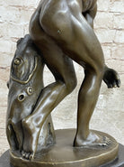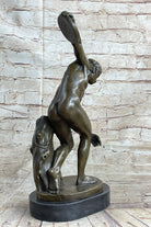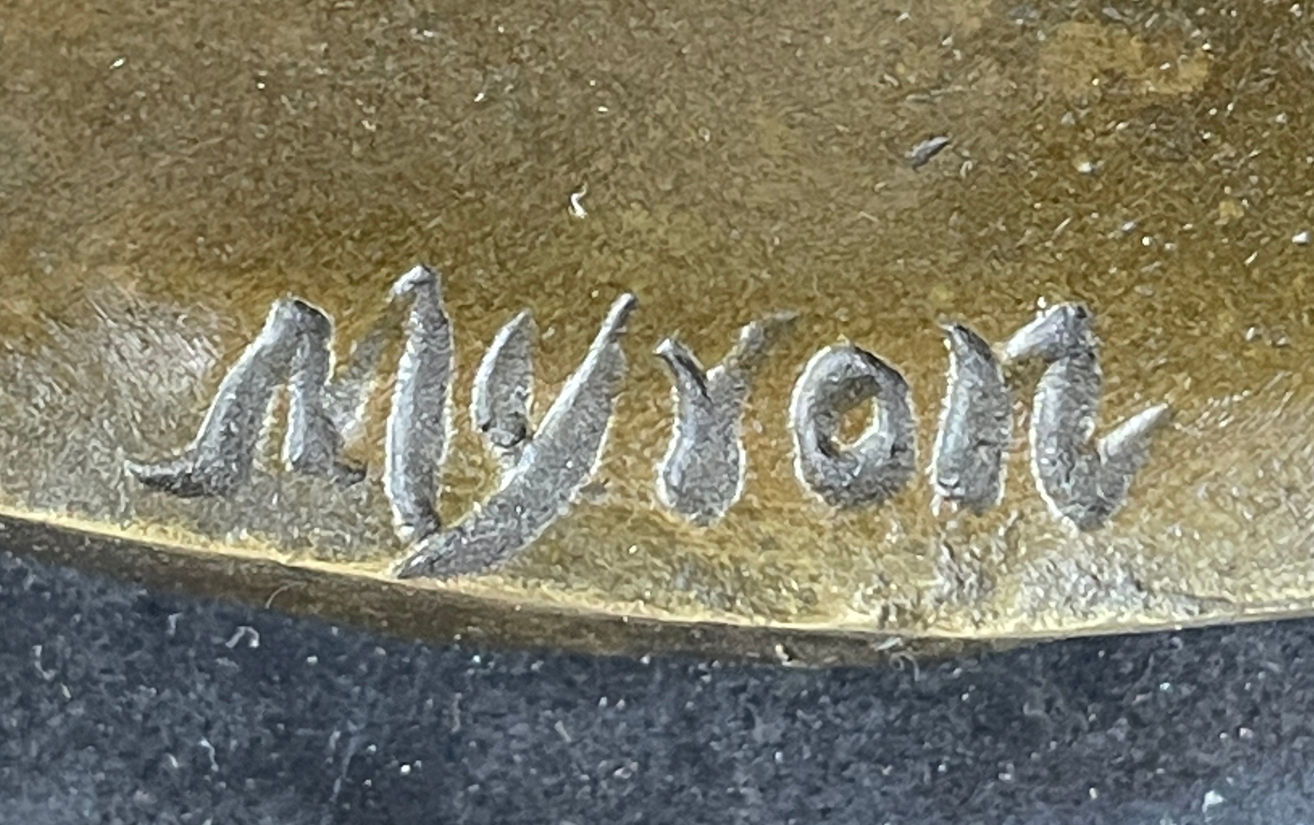 This bronze sculpture is a faithful replica of "The Discobolus of Myron," a renowned Greek masterpiece dating back to the late Severe period, around 460-450 BC. Although the original Greek bronze has been lost, its legacy endures through various Roman copies, including full-scale versions in marble. The sculpture captures a discus thrower in the moment just before releasing his throw, embodying rhythms, harmony, and balance that epitomize the athletic energy of the era. The statue's depiction reflects the Classical sculptural advancements from the Archaic period, showcasing a tightly-wound pose that freezes the potential energy right before the release. This moment of stasis is a testament to the artist Myron's skill in conveying dynamic movement and precise anatomy. Crafted using the early lost-wax casting method, the bronze replica is stained with a brown patina finish, adding to its aesthetic appeal while ensuring its preservation. The sculpture proudly stands on a black marble base bearing Myron's signature. Myron, the artist behind the original masterpiece, remains celebrated for his contributions to Classical sculpture. This replica not only pays homage to the historical and artistic significance of "The Discobolus" but also allows viewers to appreciate the enduring beauty and athleticism captured in this iconic pose.