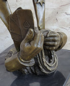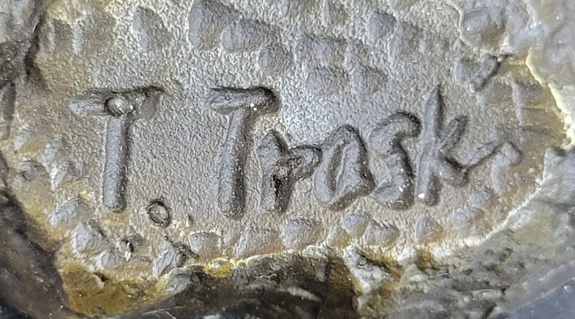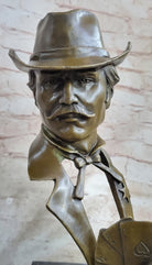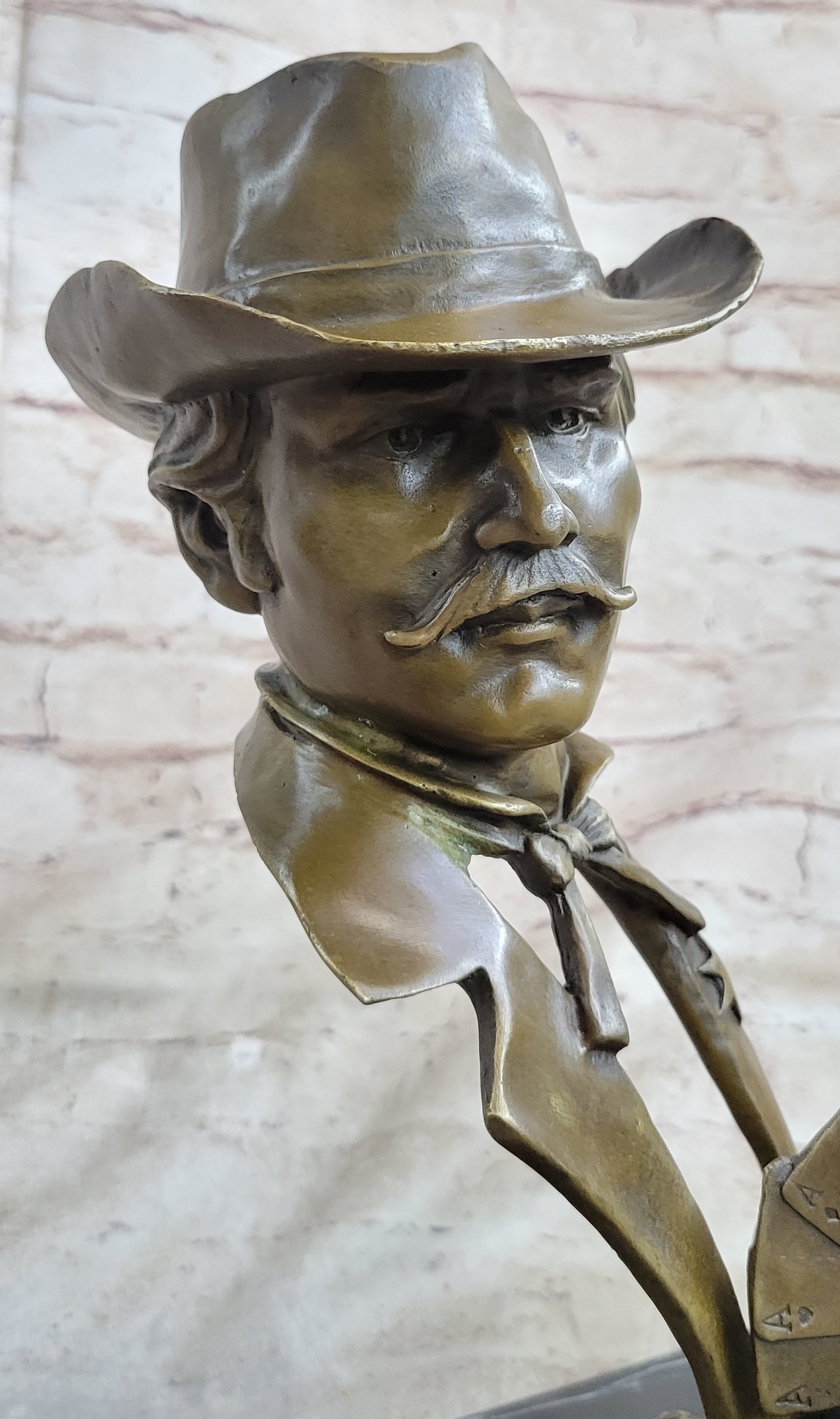 This magnificent bronze sculpture, crafted using the ancient "Lost Wax Method" and adorned with a captivating brown patina, pays homage to this Wild West narrative. Mounted on a marble base and signed by Trask, it embodies the spirit of risk-taking, camaraderie, and the indomitable legends who left an indelible mark on the rugged landscapes of the past. Own a piece of history and immerse yourself in the thrilling tales of the Wild West with this extraordinary artwork.Bronze Dimensions with Marble Base: Height 13" X Width 6"