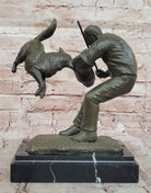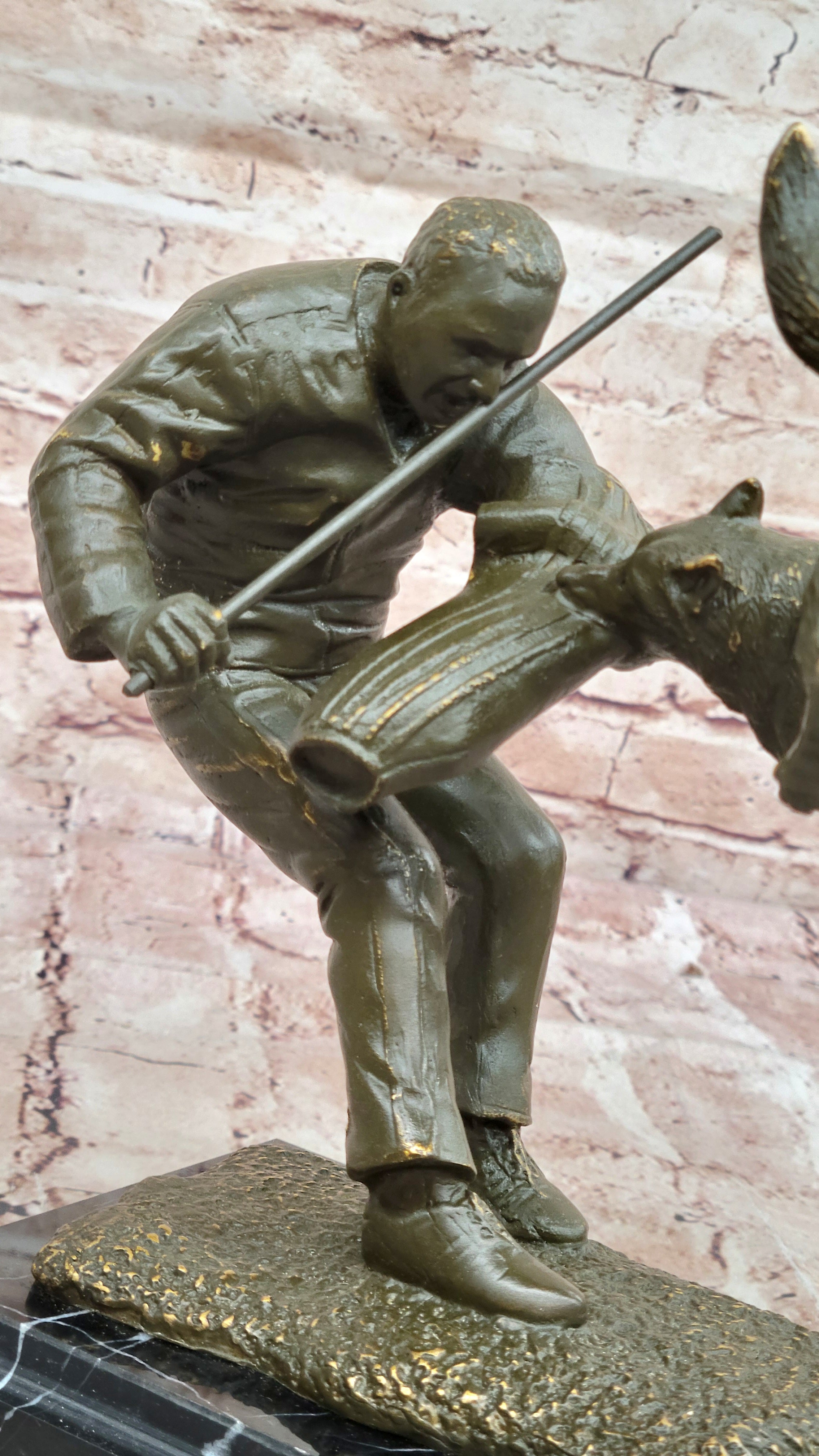 Crafted entirely by hand using the ancient lost wax method, the sculpture displays impressive craftsmanship in both form and emotion. From the folds in the trainer’s clothing to the dog’s alert ears and poised stance, every detail is rendered with care and realism. A rich brown patina enhances the lifelike textures while adding a warm, classic tone to the overall piece.