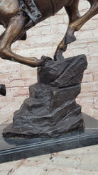 The artist's signature, "Remington," is a mark of quality and craftsmanship, underscoring the provenance of this exquisite sculpture. With its combination of intricate detailing, dynamic movement, and thoughtful presentation, this artwork becomes more than a static object—it transforms into a dynamic focal point, inviting viewers to appreciate the artistry and skill behind its creationBronze Dimensions with Marble Base: Height 26" X Width 27"