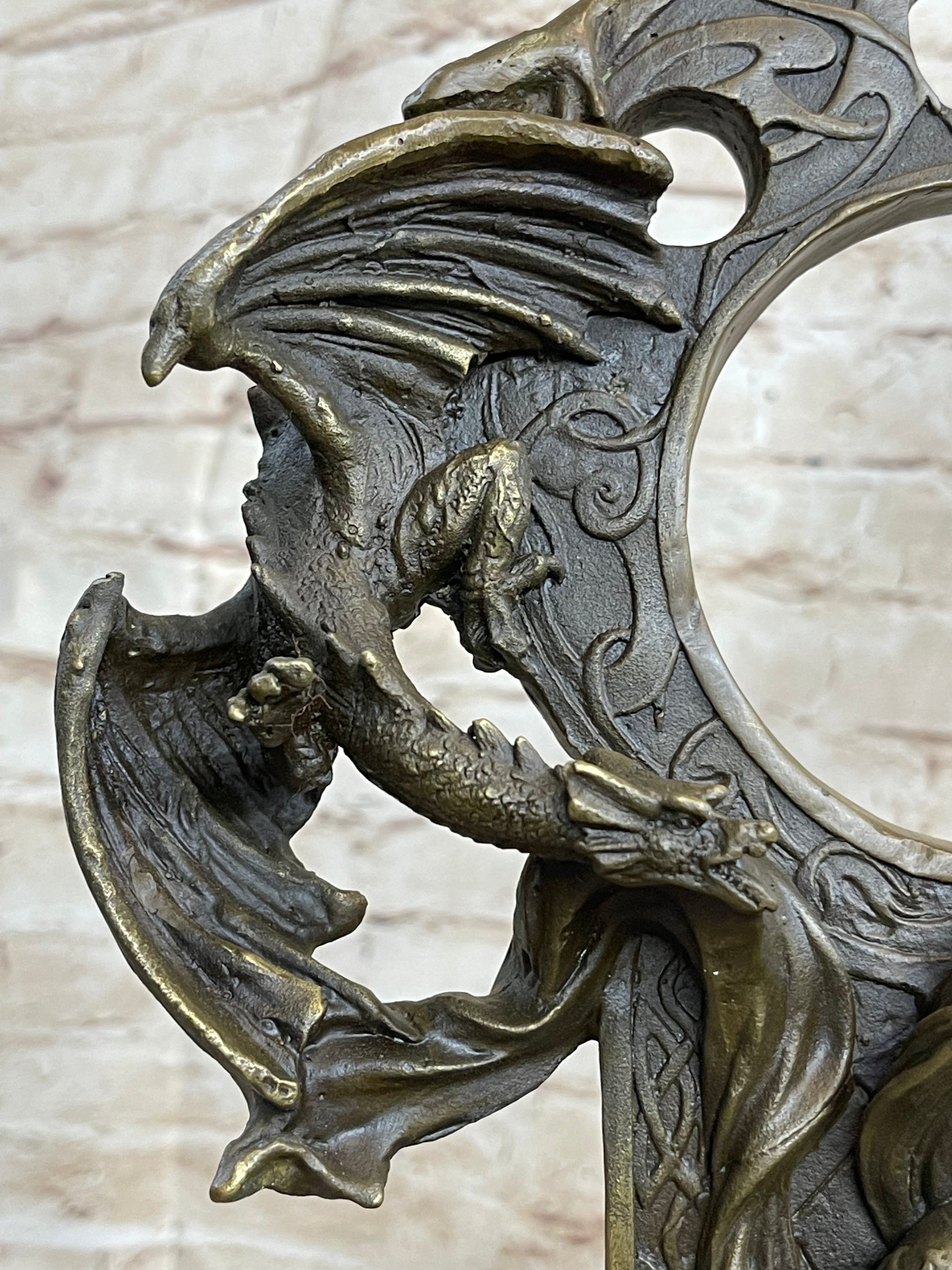 Standing behind the woman, the dragon emerges as a powerful and imposing figure, its mouth agape and fangs bared in a fierce display of protection. The dynamic interaction between the woman and her dragon pet imbues the sculpture with a sense of drama and intrigue, inviting viewers to contemplate the relationship between these two characters.