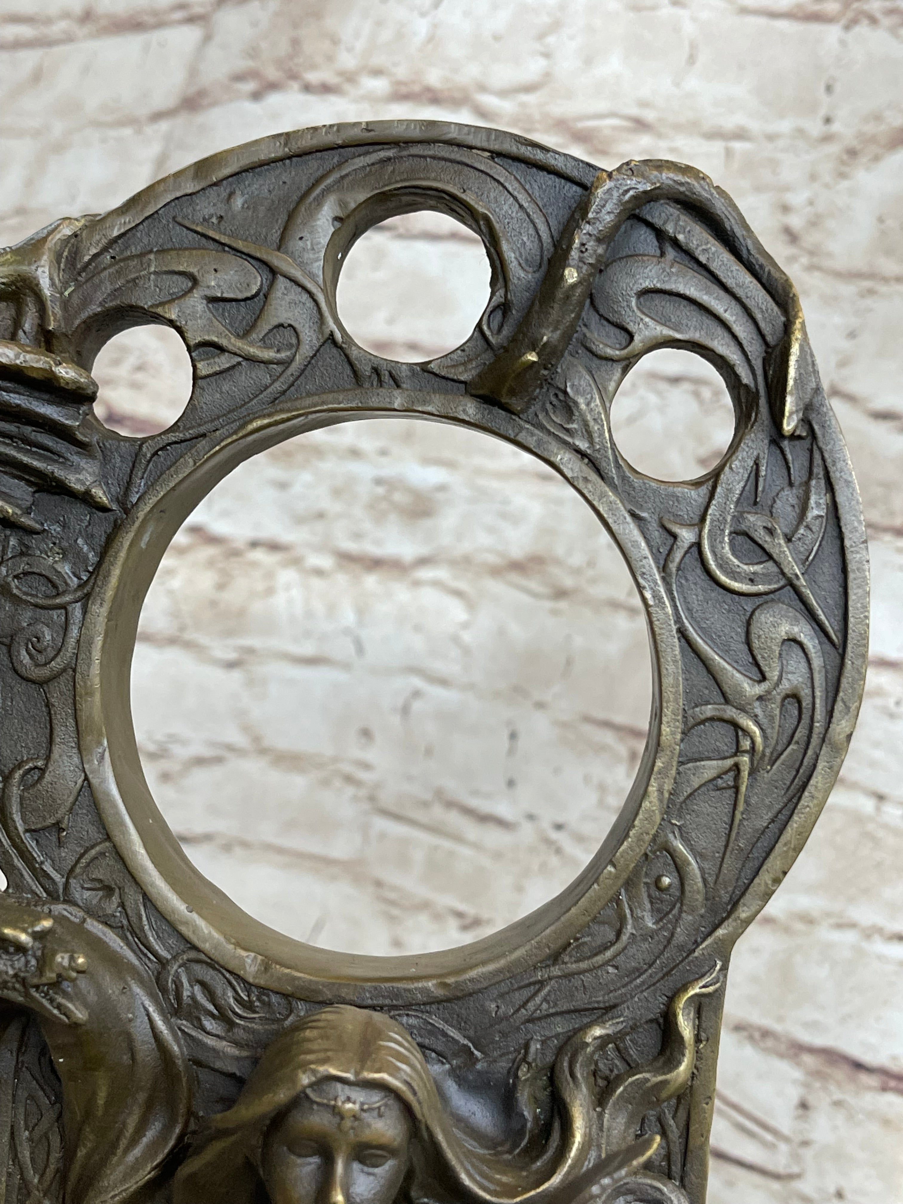This extraordinary bronze sculpture is a testament to the incredible artistry and craftsmanship of its creator, Jean Patoue. Depicting a stunning woman standing on her toes, accompanied by a magnificent dragon, the sculpture is an impressive display of detail and intricacy. The woman's mesmerizing beauty is captured with remarkable precision, from her slender figure and flat stomach to the distinctive bikini top and Indian-inspired bottom piece she wears.