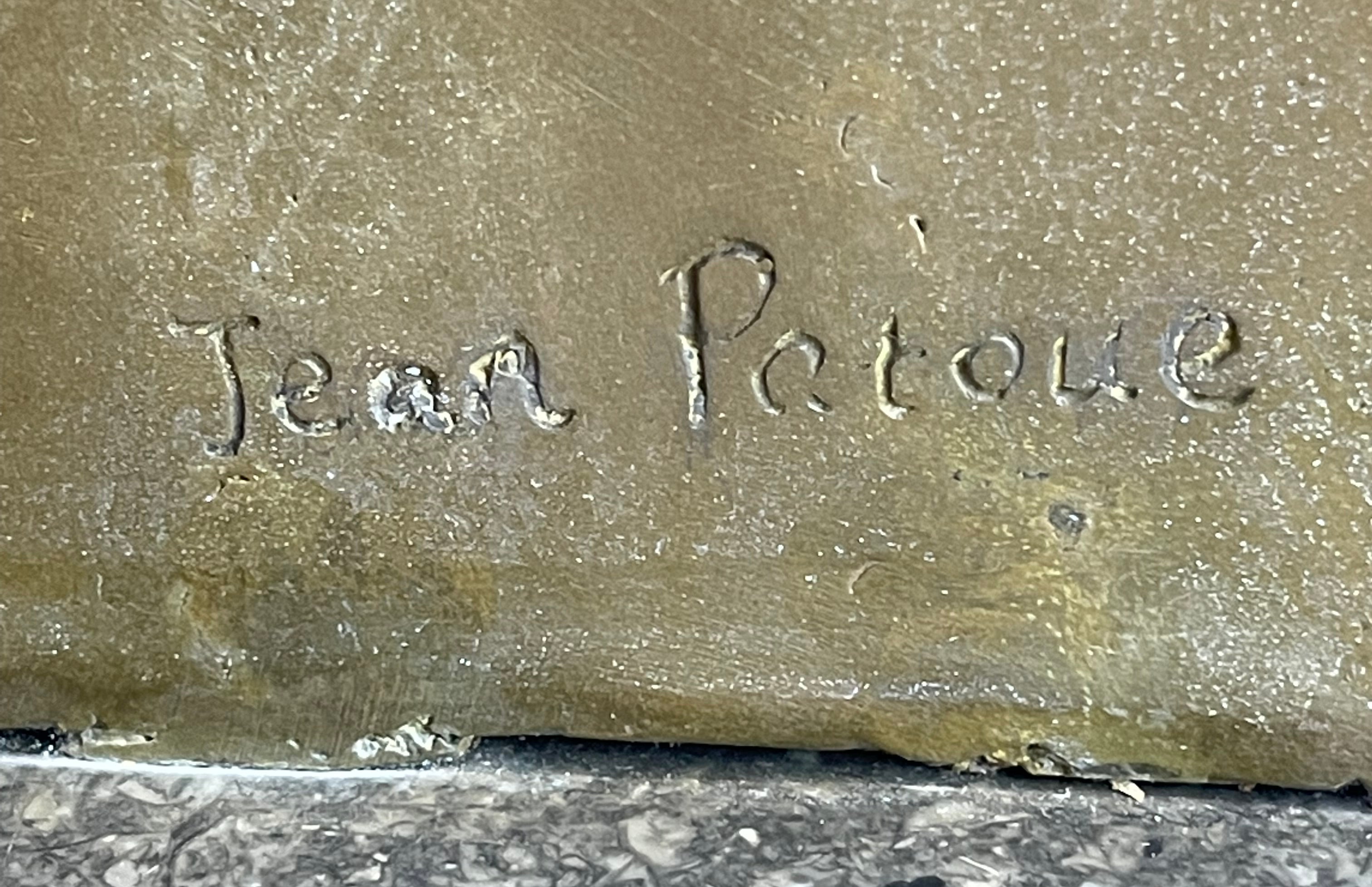 Crafted with painstaking attention to detail, this sculpture is handmade using the ancient "Lost Wax Method," ensuring that each element is rendered with exquisite accuracy. The green patina finish adds depth and dimension to the bronze, while the black marble base provides a sturdy foundation for the artwork. Signed by the artist Jean Patoue, this sculpture is a true masterpiece that will command attention and admiration in any space.Bronze Dimensions with Marble Base: Height 16" X Width 8"