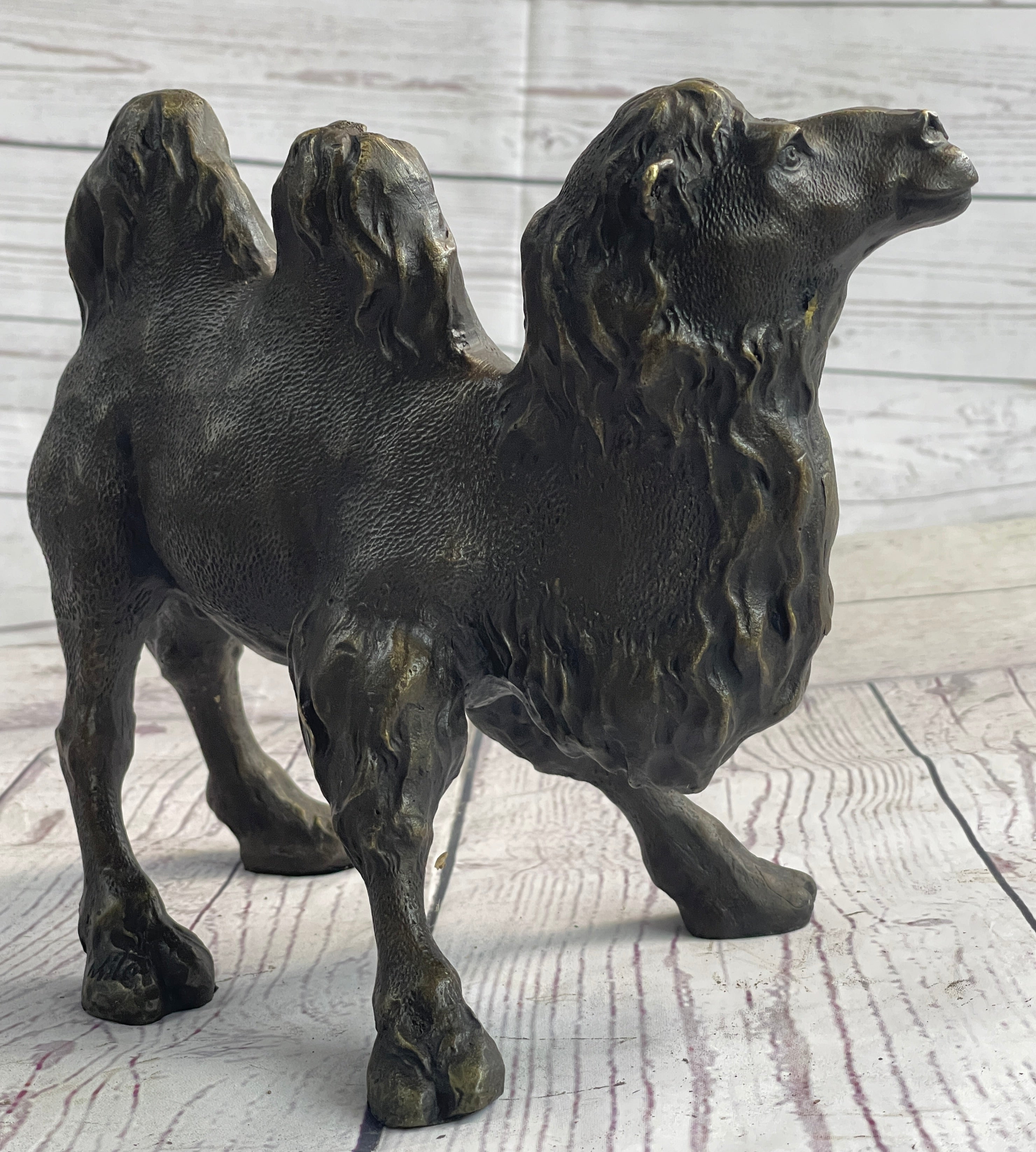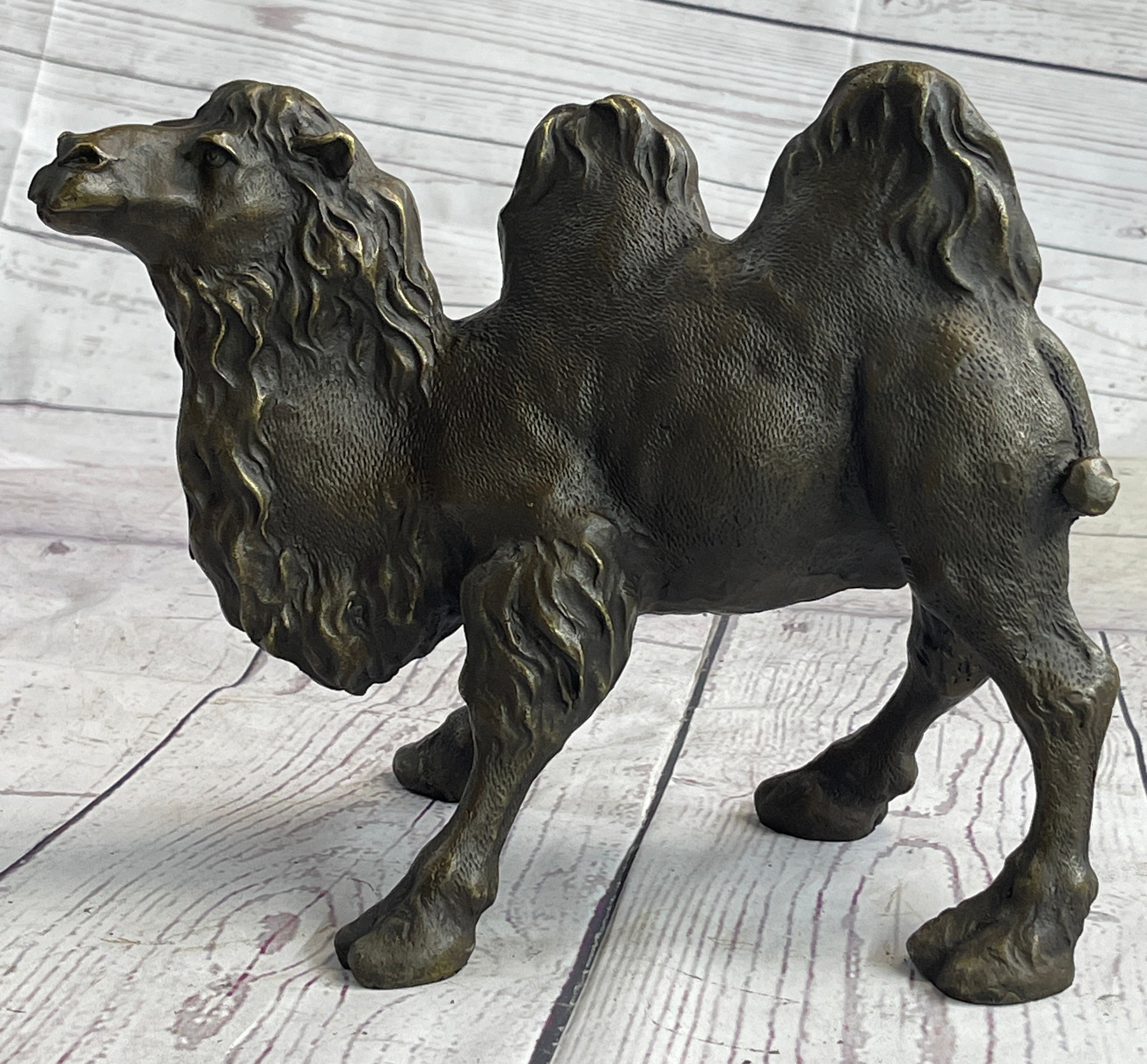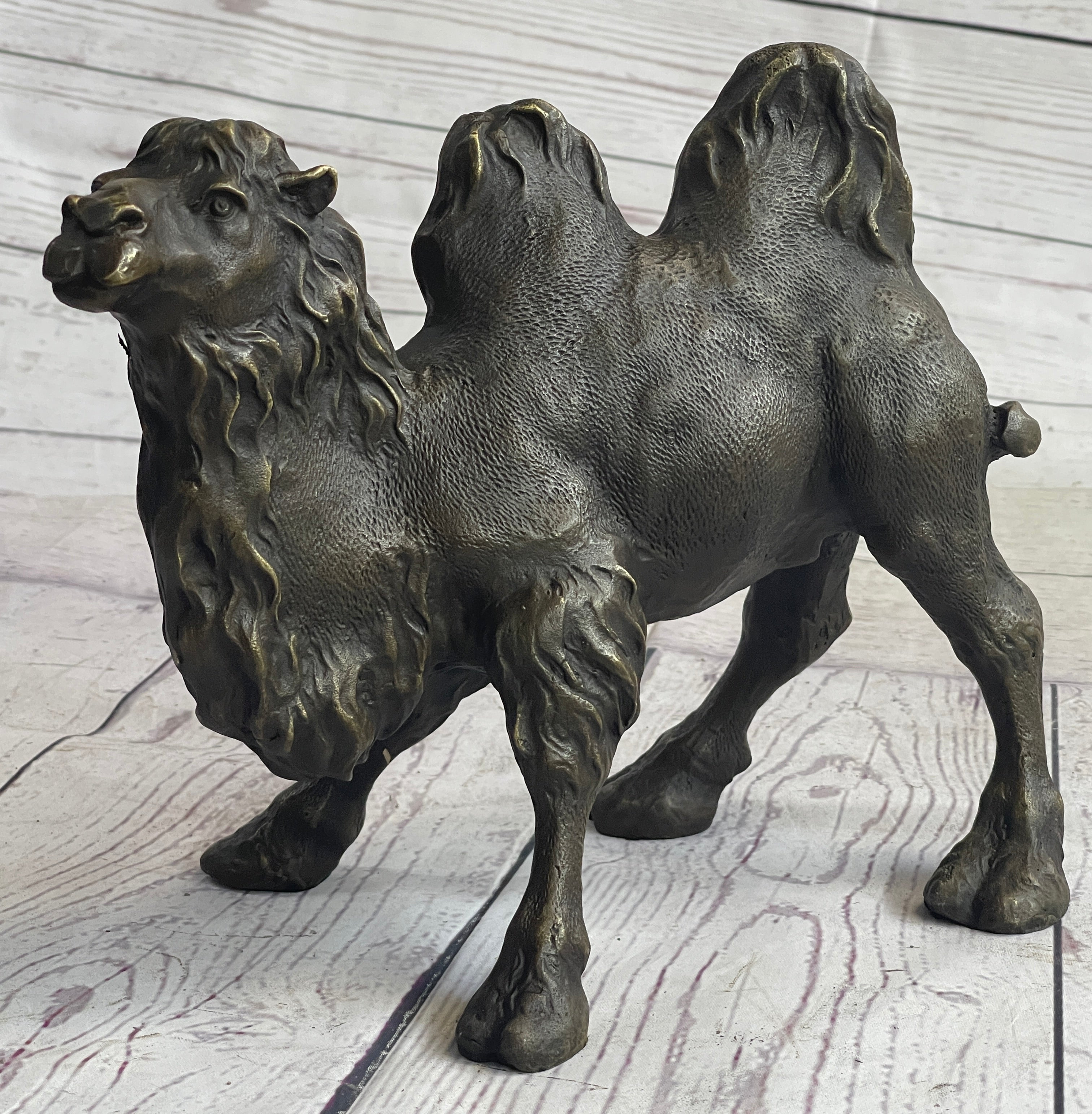 Presenting the striking "Standing Camel" sculpture, a captivating representation of the regal desert dweller. Crafted with meticulous attention to detail, this solid bronze casting by European Bronze Finery stands as a testament to both artistry and nature. The sculpture portrays the camel's commanding presence with remarkable accuracy, capturing its inherent grace and strength in every curve and contour.