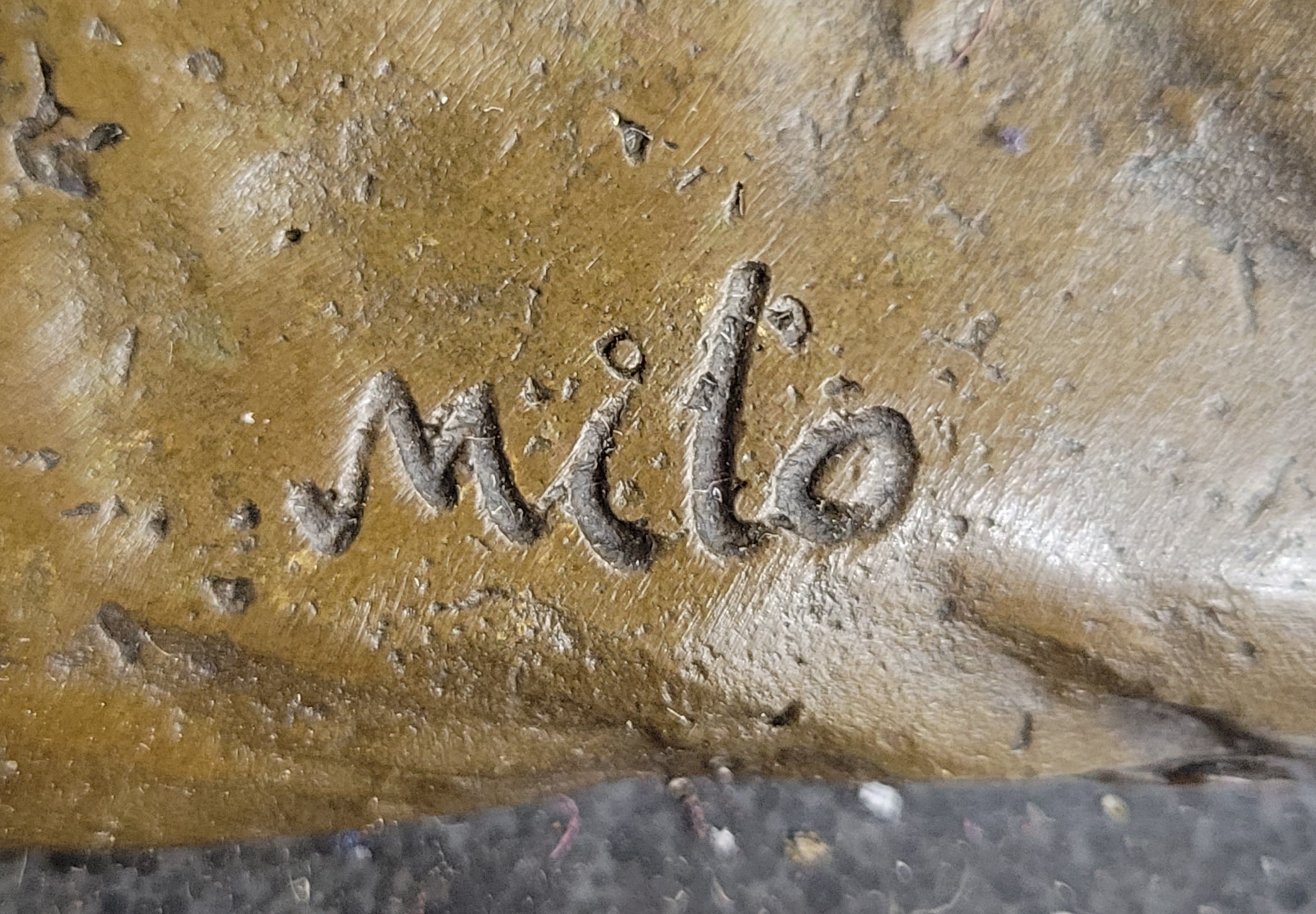 Whether displayed as a symbol of strength and resilience or as a testament to the enduring bond between humans and horses, this sculpture captivates with its artistry and craftsmanship. Signed by the renowned artist Milo, it stands as a masterpiece of equine art, inspiring admiration and appreciation for the timeless beauty of these magnificent animals.Bronze Dimensions with Marble Base: Height 14" X Width 11"