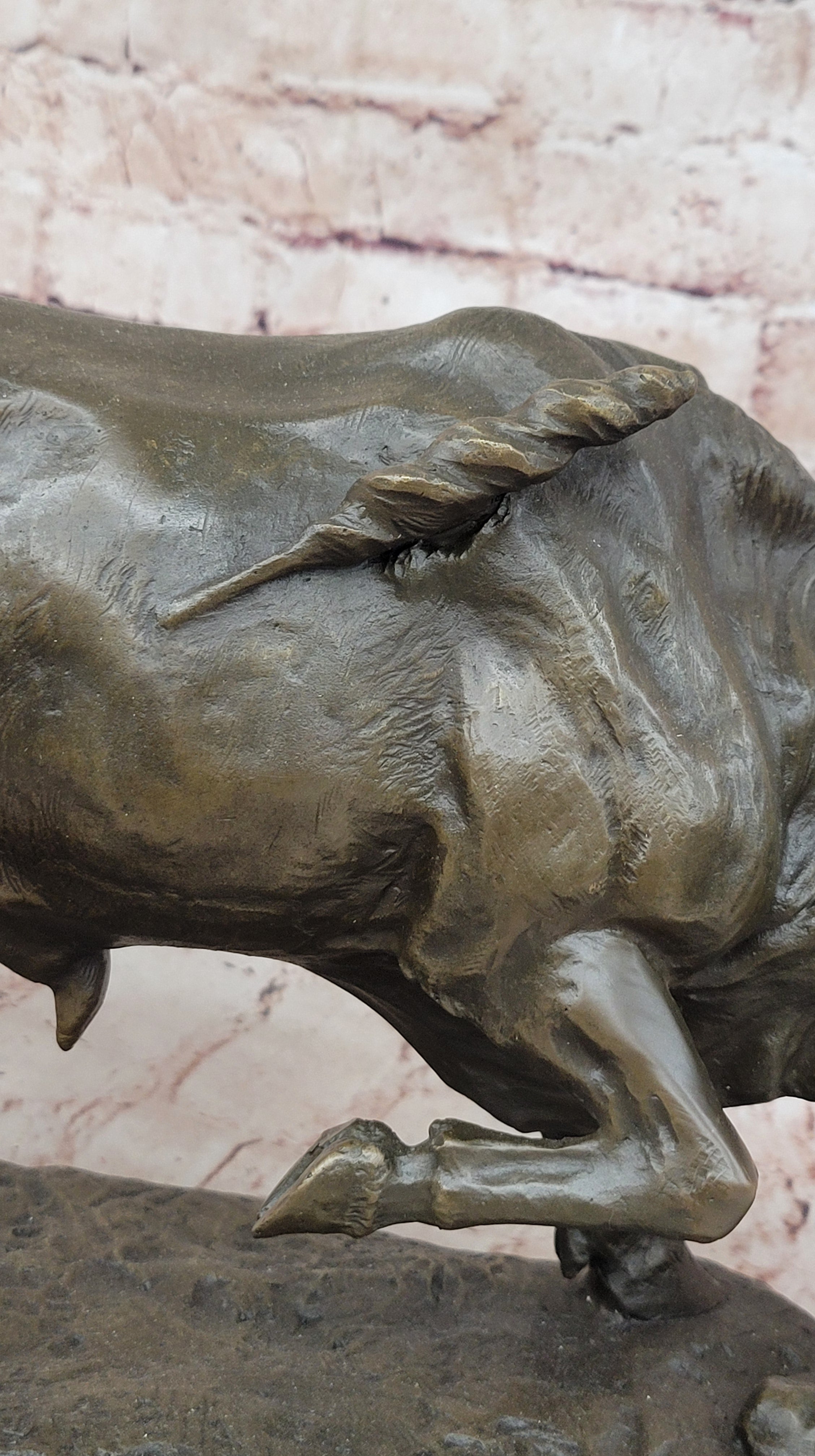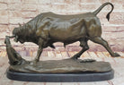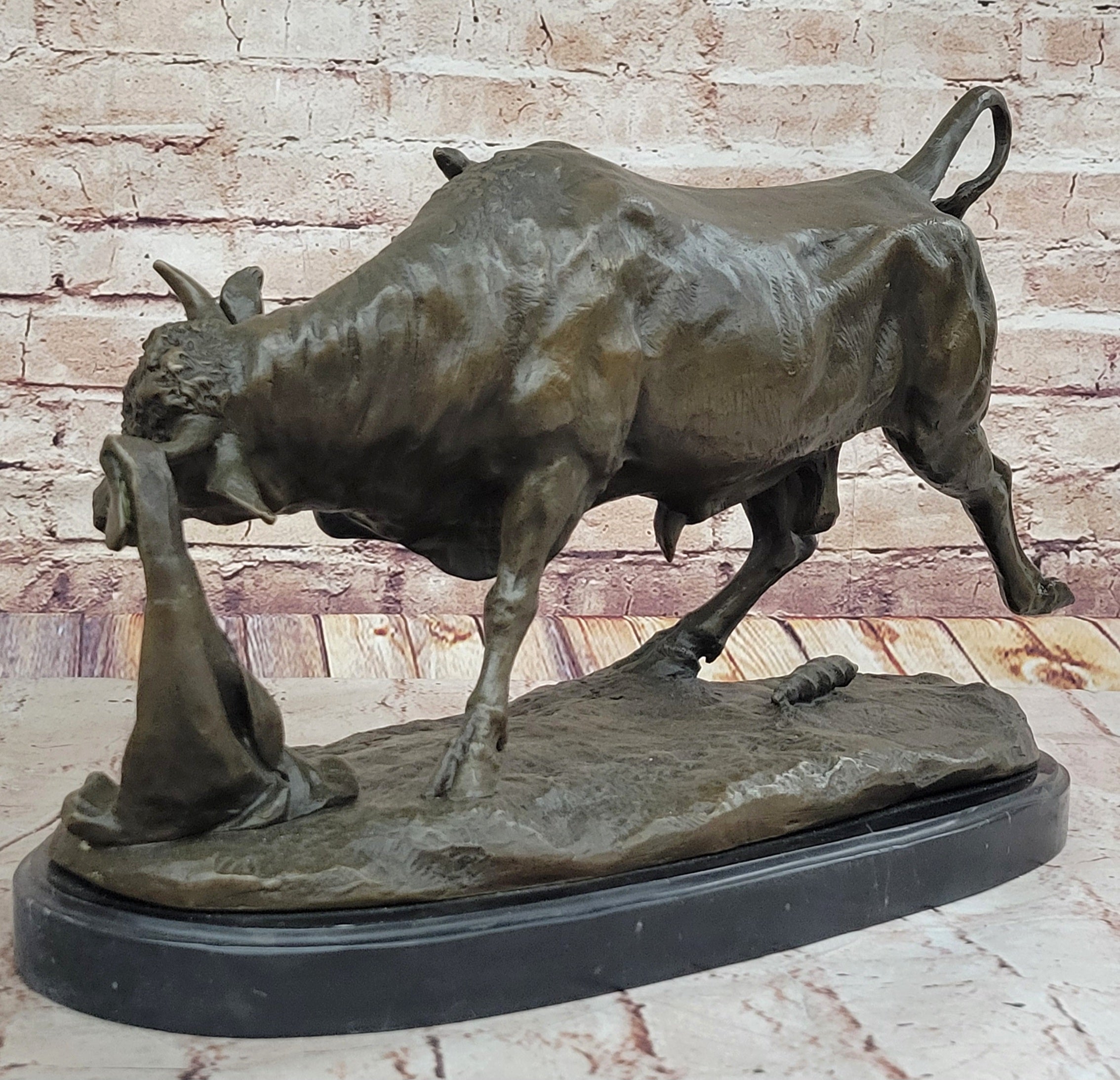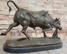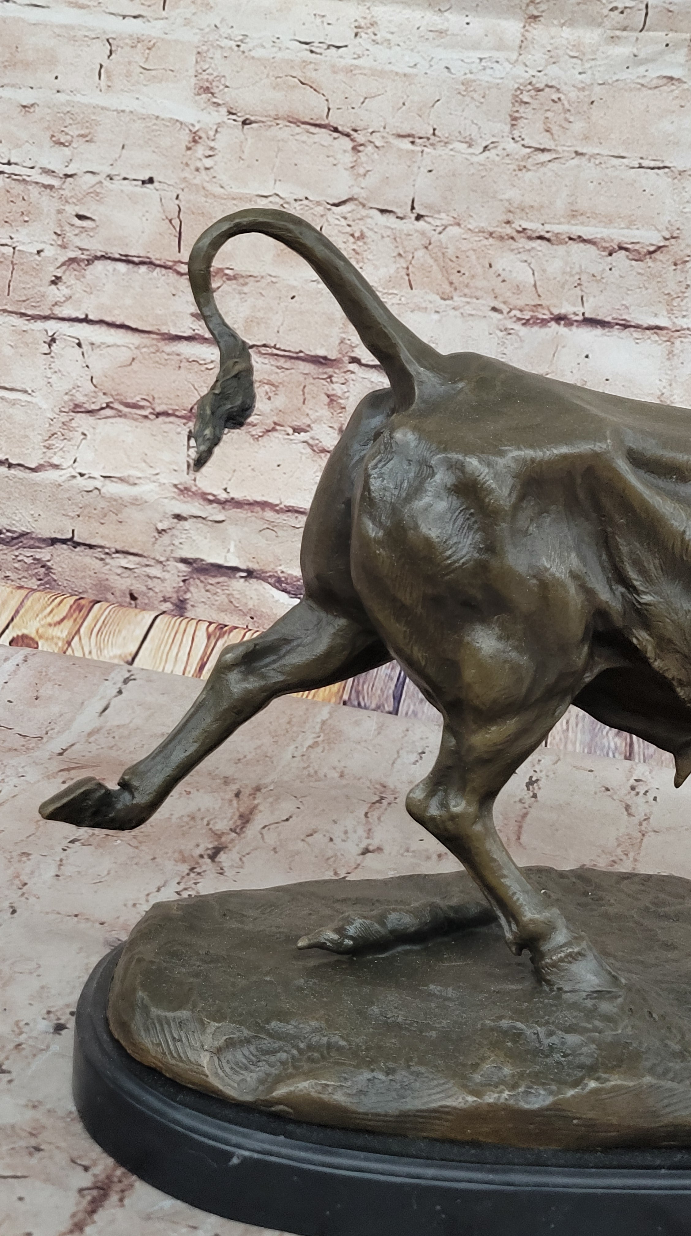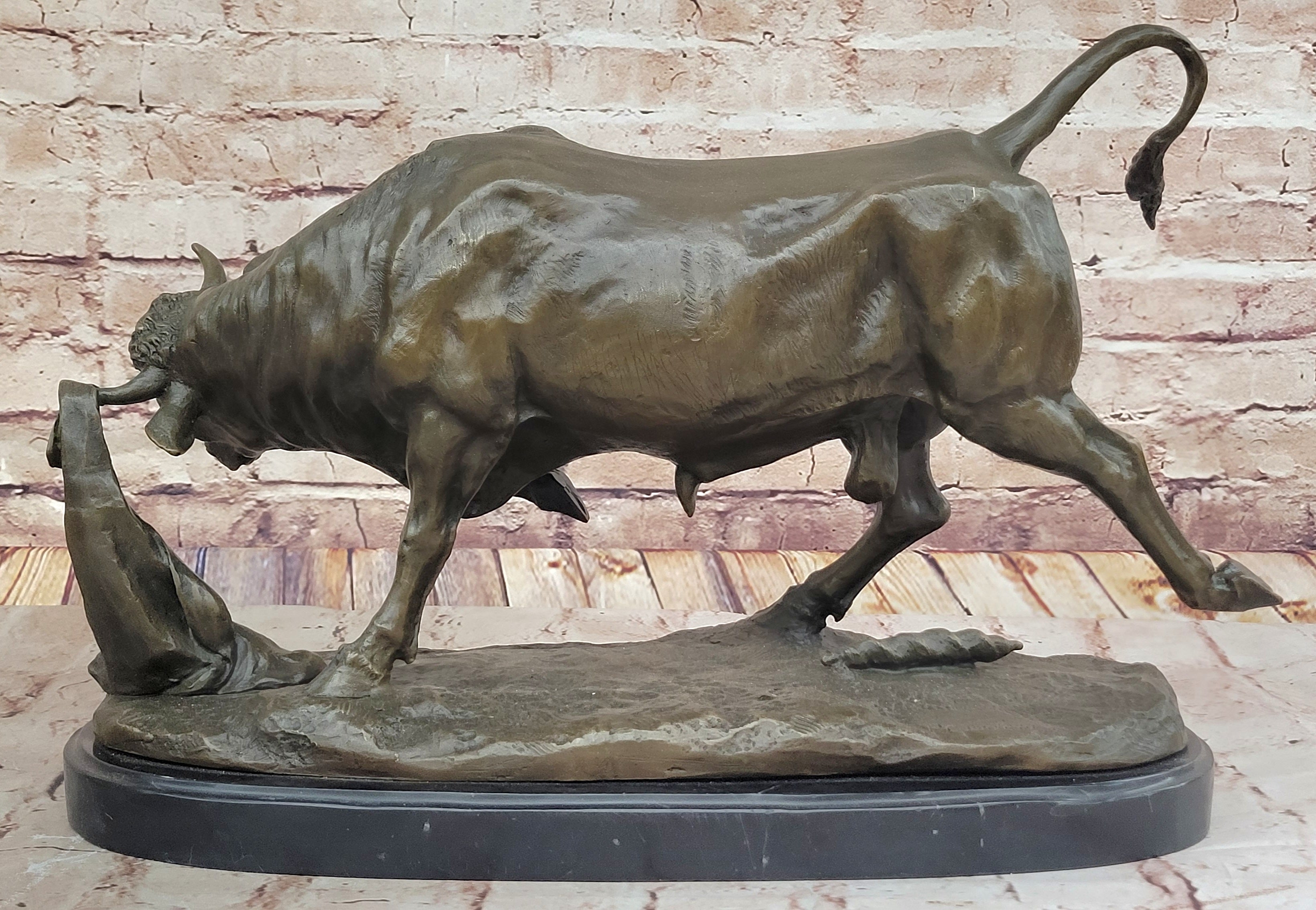 Mounted on a solid marble base, the piece is a testament to the artistry and craftsmanship involved in its creation. Made entirely of certified pure bronze, it is a remarkable example of the traditional lost wax process (Cire Perdue). This time-honored method captures even the finest details of the artist's original work, ensuring a faithful reproduction of the bull's intricate textures and dynamic form.