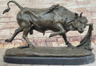 This extraordinary sculpture captures the raw power and vitality of a charging bull, an emblem of strength and determination. The bull's dynamic posture and muscular build are meticulously rendered, showcasing the animal's energy and intensity as it charges forward with majestic force. The polished patina finish further enhances the sculpture, emphasizing the physicality and spirit of this magnificent creature.