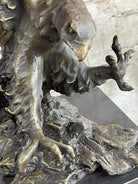 With its dynamic portrayal of the eagle's descent and its symbolic significance, this sculpture serves as a testament to the resilience and majesty of the natural world. Its portrayal of the eagle's imminent landing, coupled with the intricacy of its design, invites viewers to appreciate the beauty and power of this iconic creature, while also conveying a sense of reverence for the enduring spirit of freedom and grace.Bronze Dimensions with Marble Base: Height 19" X Width 15"