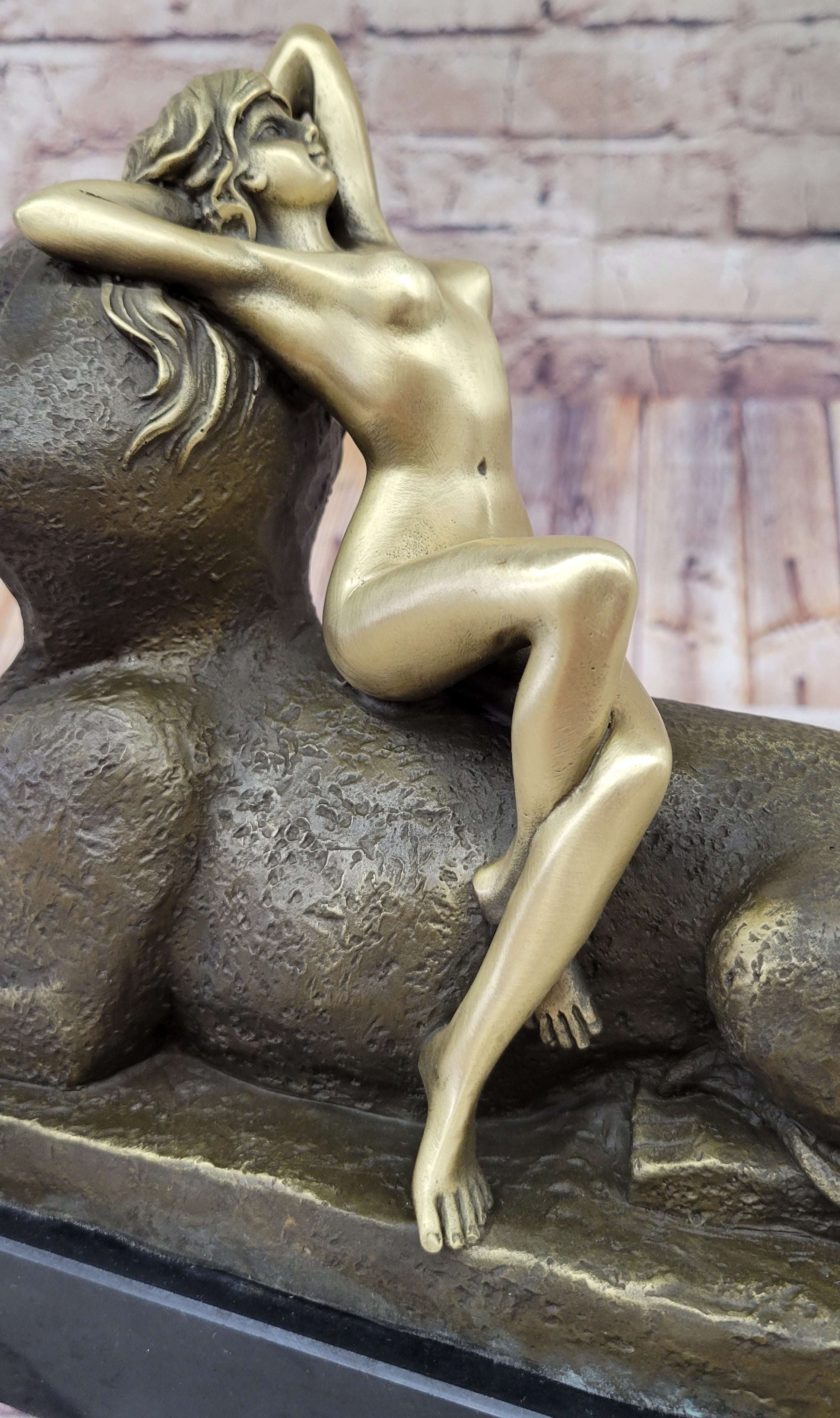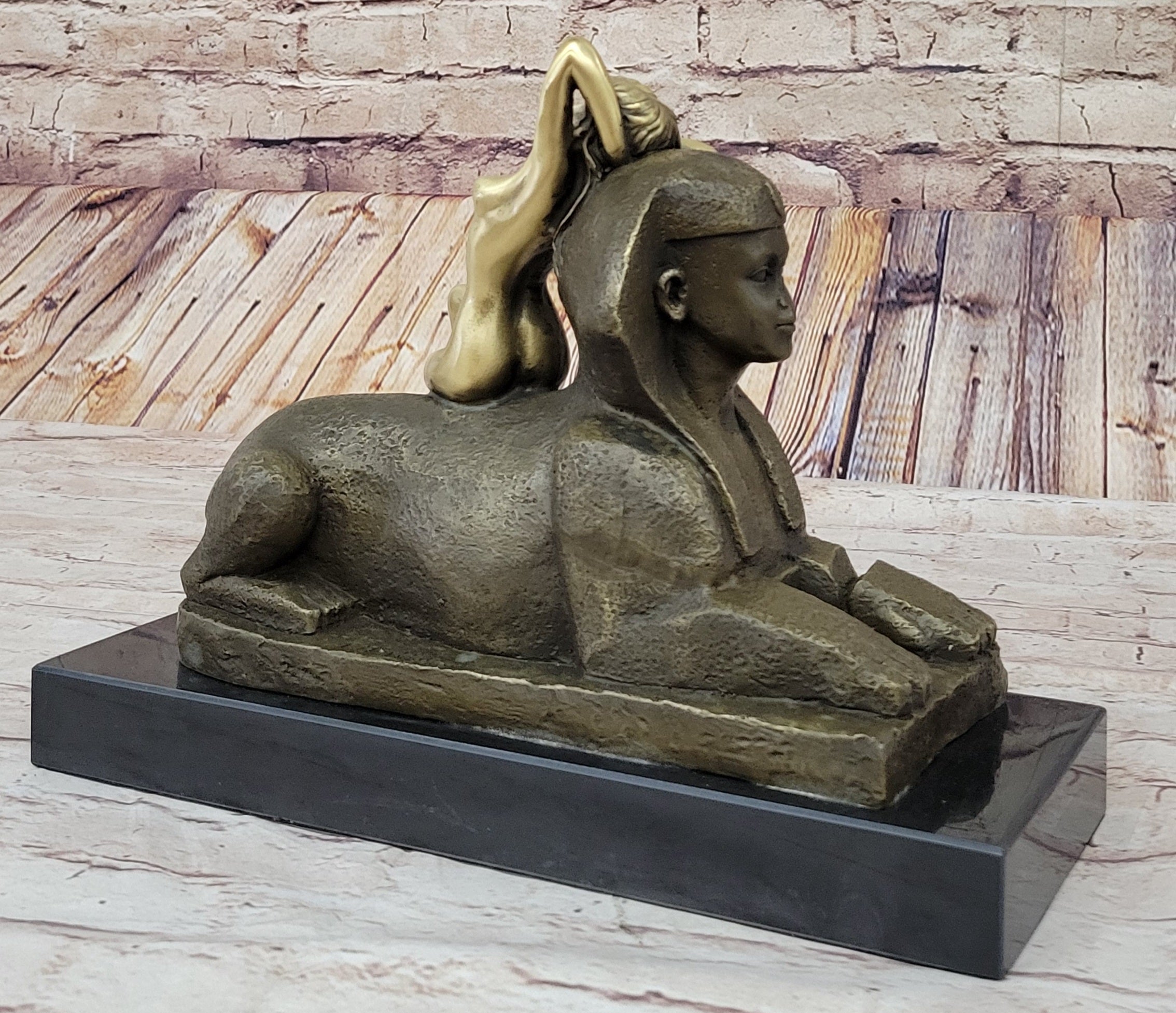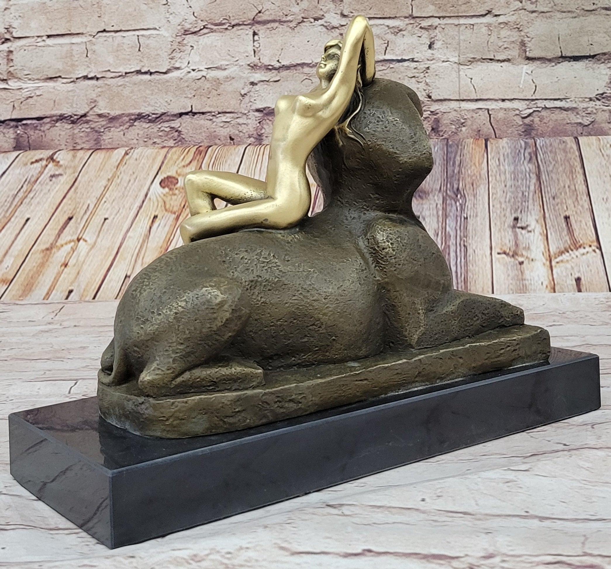 T. Herlinger (1904) Egyptian Sphinx w/ Nude Girl Art Deco Bronze Statue Sculpture 10" x 12"