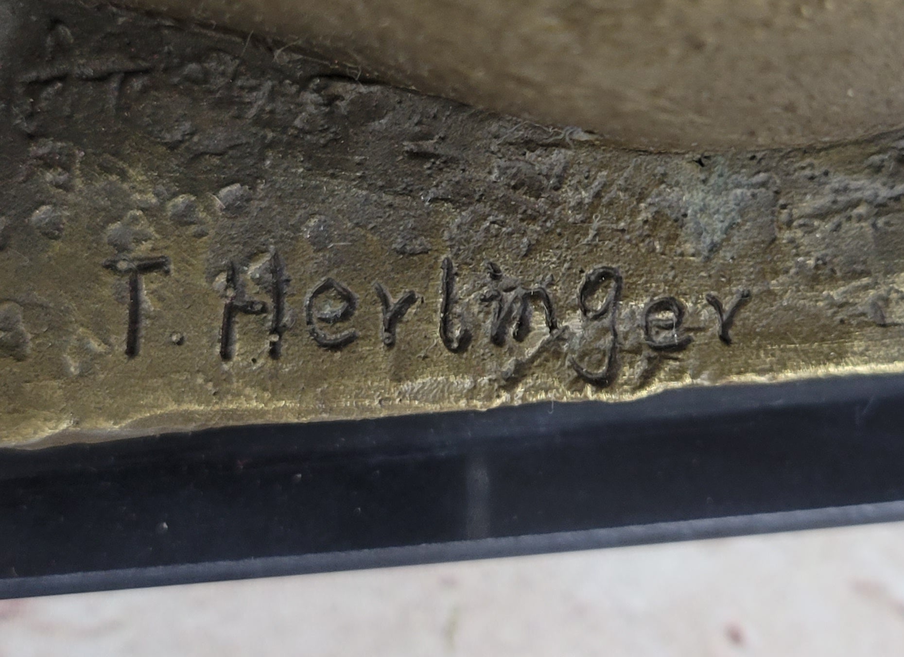 Handcrafted using the ancient lost-wax method, this stunning bronze piece is mounted on a sleek black marble base that accentuates its detailed design and timeless appeal. Signed by T. Herlinger, it stands as a remarkable testament to the enduring allure of classical artistry merged with Art Nouveau innovation—a true treasure for any discerning art enthusiast.Bronze Dimensions with Marble Base: Height 9.5" X Width 12"