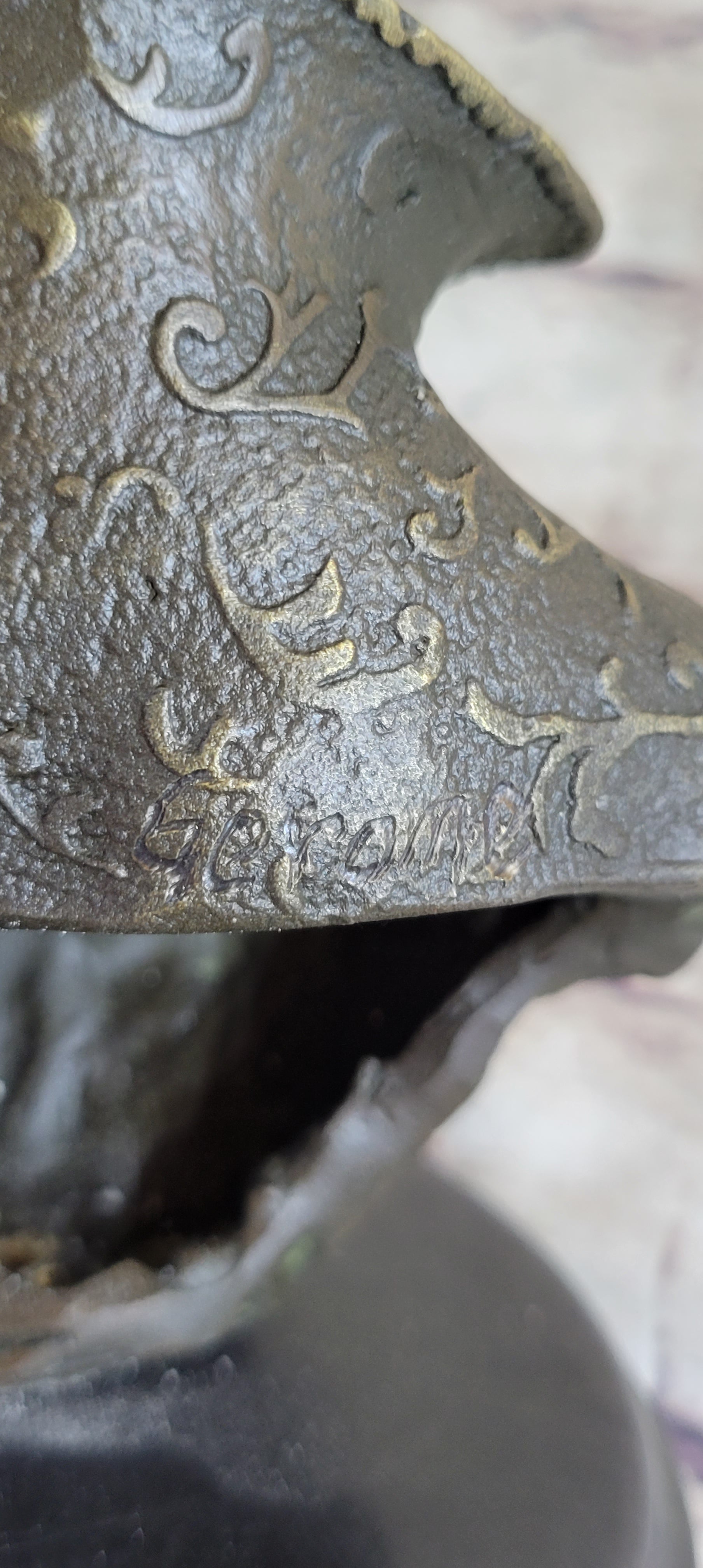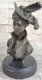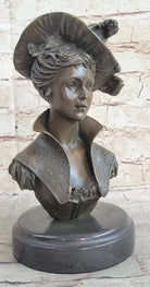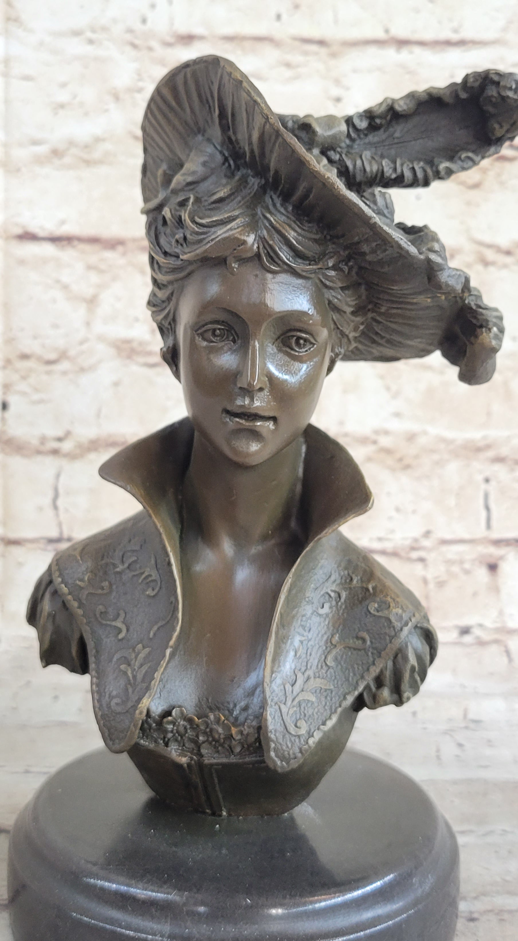 This piece stands as the embodiment of refinement, portraying the bust of an elegant girl adorned in a feathered dress hat. Clearly, she is a woman of elevated status, ready for a royal day in town. Her attire includes an intricately designed vest over what appears to be a regal gown, showcasing the craftsmanship of the sculptor. The attention to detail is striking, from the meticulously sculpted up-do to the large flower accentuating her hair, contributing to the overall elegance of the piece. The lifelike features of her face suggest the work of a highly skilled artisan, with the engraving of the signature "Noee" adding a personal touch to the sculpture. This classic piece, crafted using the lost wax method, a technique with a rich history spanning thousands of years, ensures an exquisitely detailed sculpture that radiates grace and beauty, making it a perfect addition to your business or home.