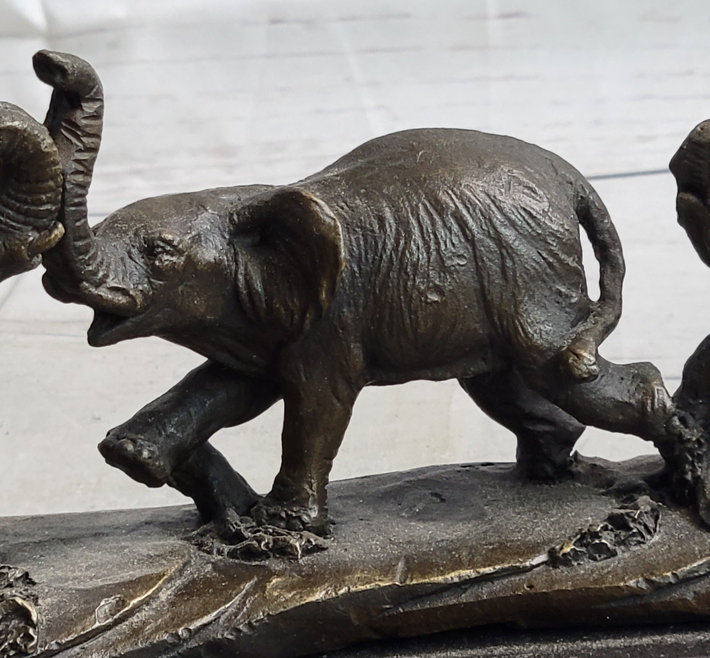 This mother and calf elephant sculpture is a moving depiction of the bonds of family and the joys of reunion. It serves as a tribute to the majestic creatures of the African savanna, making it a meaningful addition to any art collection or a remarkable gift that captures the spirit of nature's wonders.Bronze Dimensions with Marble Base: Height 5 " x Width 9 1/2"