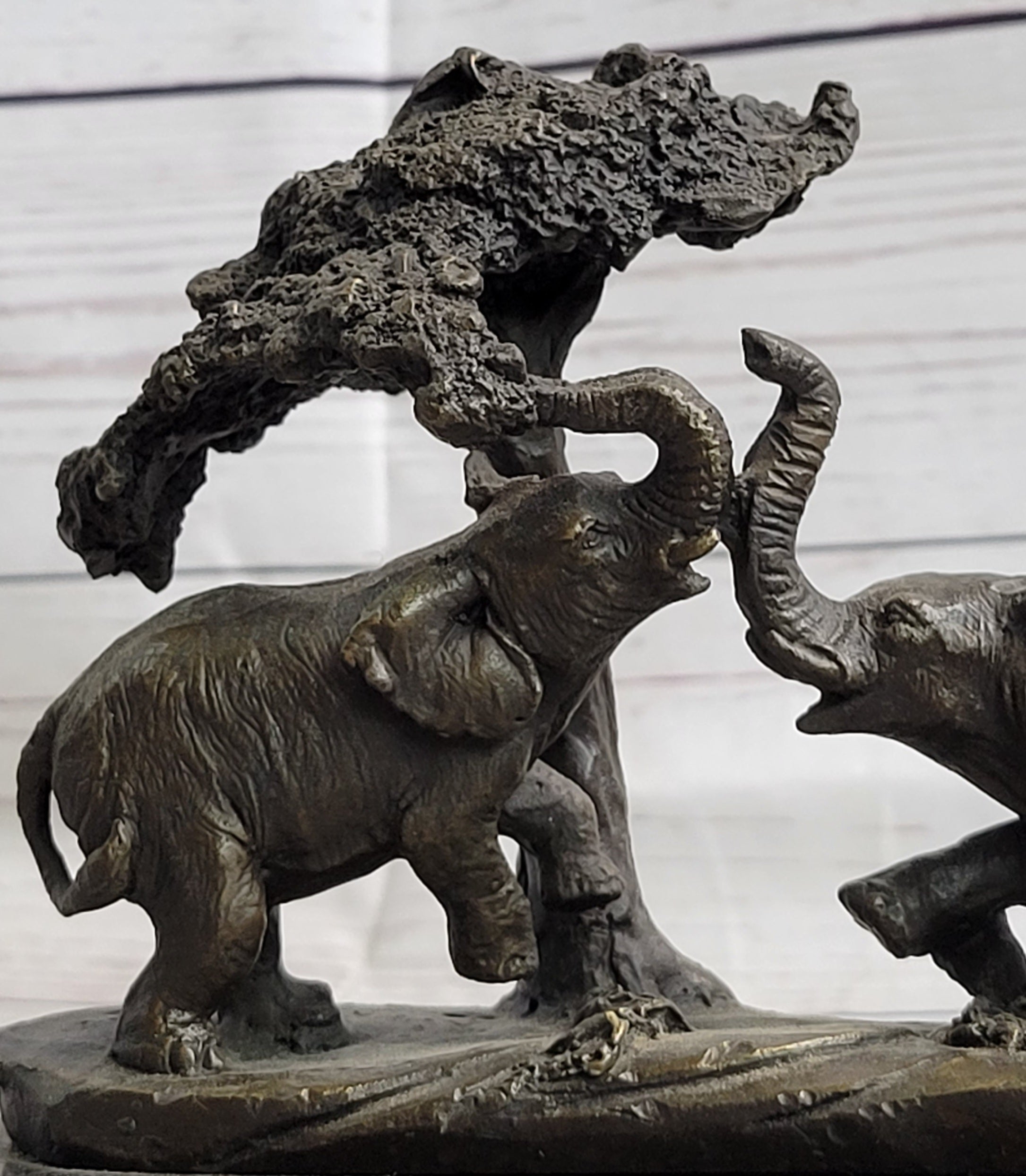 This striking bronze sculpture masterfully captures the essence of a heartwarming reunion between a mother and her calf on the vast African plains. After days of a monumental migration, their raised trunks trumpet their joyous greeting, a call that reverberates for miles. Under the welcome shade of a tree, they have found their herd once again, and this moment is beautifully immortalized in bronze.