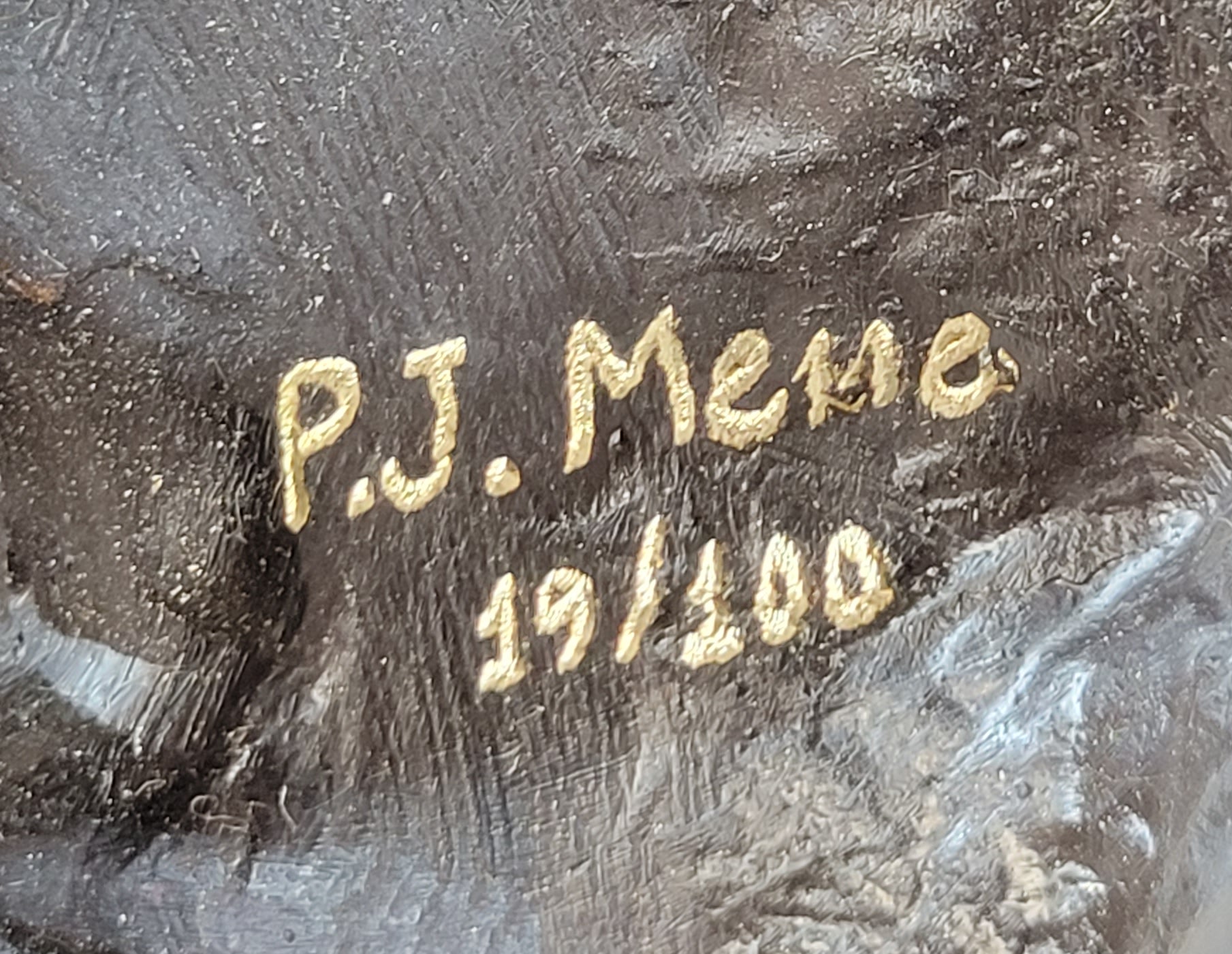 Immerse yourself in the captivating world of the hunter's prize with this remarkable bronze sculpture. Perched on a slanted hill, a majestic deer gazes out across the vast expanse of open land below. Its antlers gracefully curl upwards, mirroring the tuft of fur on its chest. The deer's piercing, cold gaze captivates the viewer, while its head turns sharply to the side, as if alerted by a distant, subtle sound. A hunter's boot snapping a twig, perhaps? This sculpture serves as the perfect gift for hunters, nature enthusiasts, and those who cherish the countryside. Meticulously crafted by hand from 100% bronze, the sculpture showcases a stunning two-toned brown patina, achieved through the time-honored "Lost Wax Method." Notably, it bears the signature of renowned sculptor P.J. Mene, a pioneer in nineteenth-century animal sculpture.