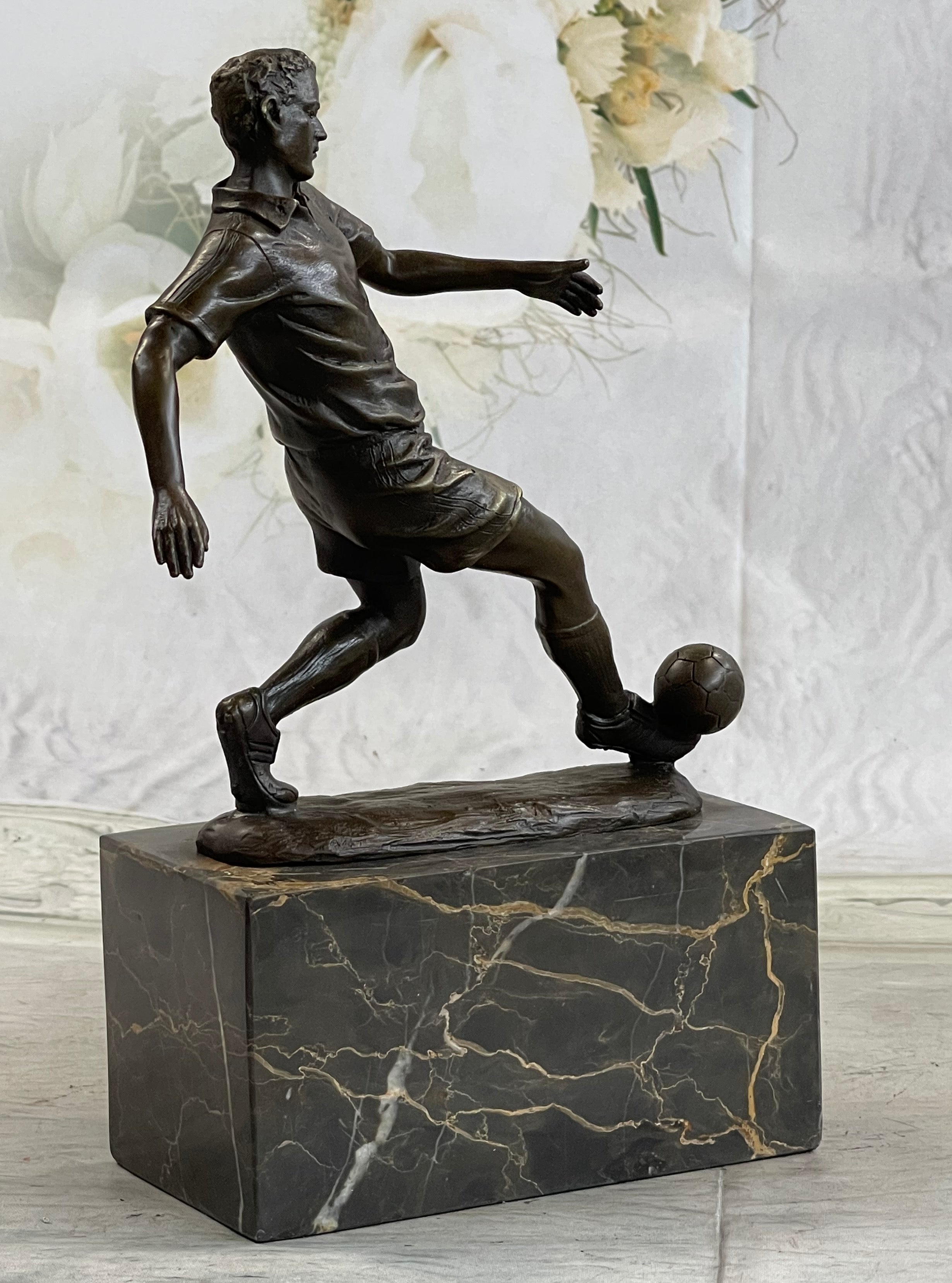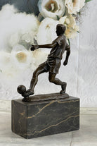 This extraordinary sculpture serves as a perfect gift for the passionate soccer or football enthusiast in your life, capturing the essence of the sport and celebrating the prowess of its players. Handcrafted with utmost care, this sculpture is composed of 100% bronze, ensuring its lasting beauty and quality. The artistic process involved the renowned "Lost Wax Method," a technique that preserves fine details and craftsmanship. It is proudly displayed on a marble base, adding an element of elegance and refinement to its presentation.