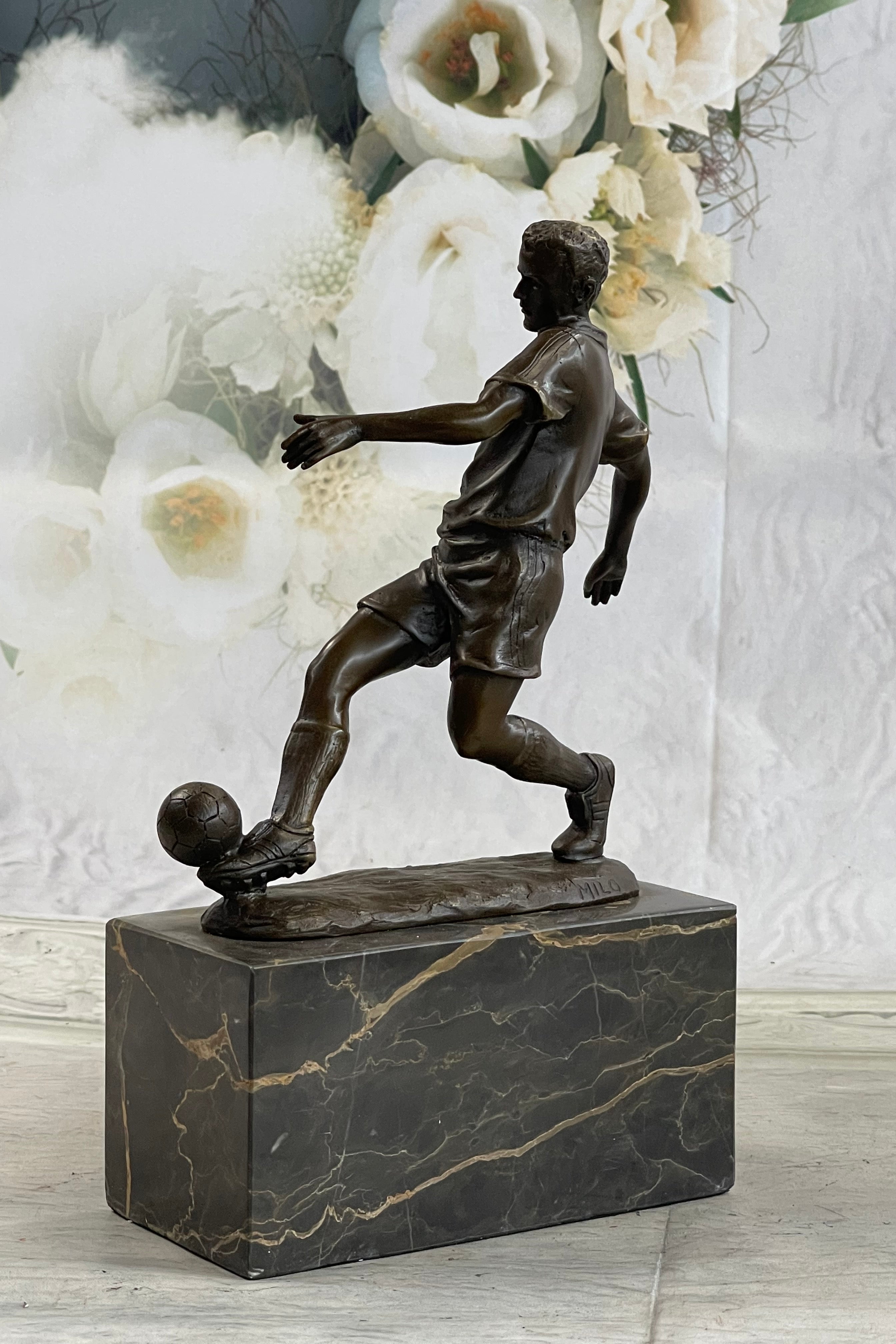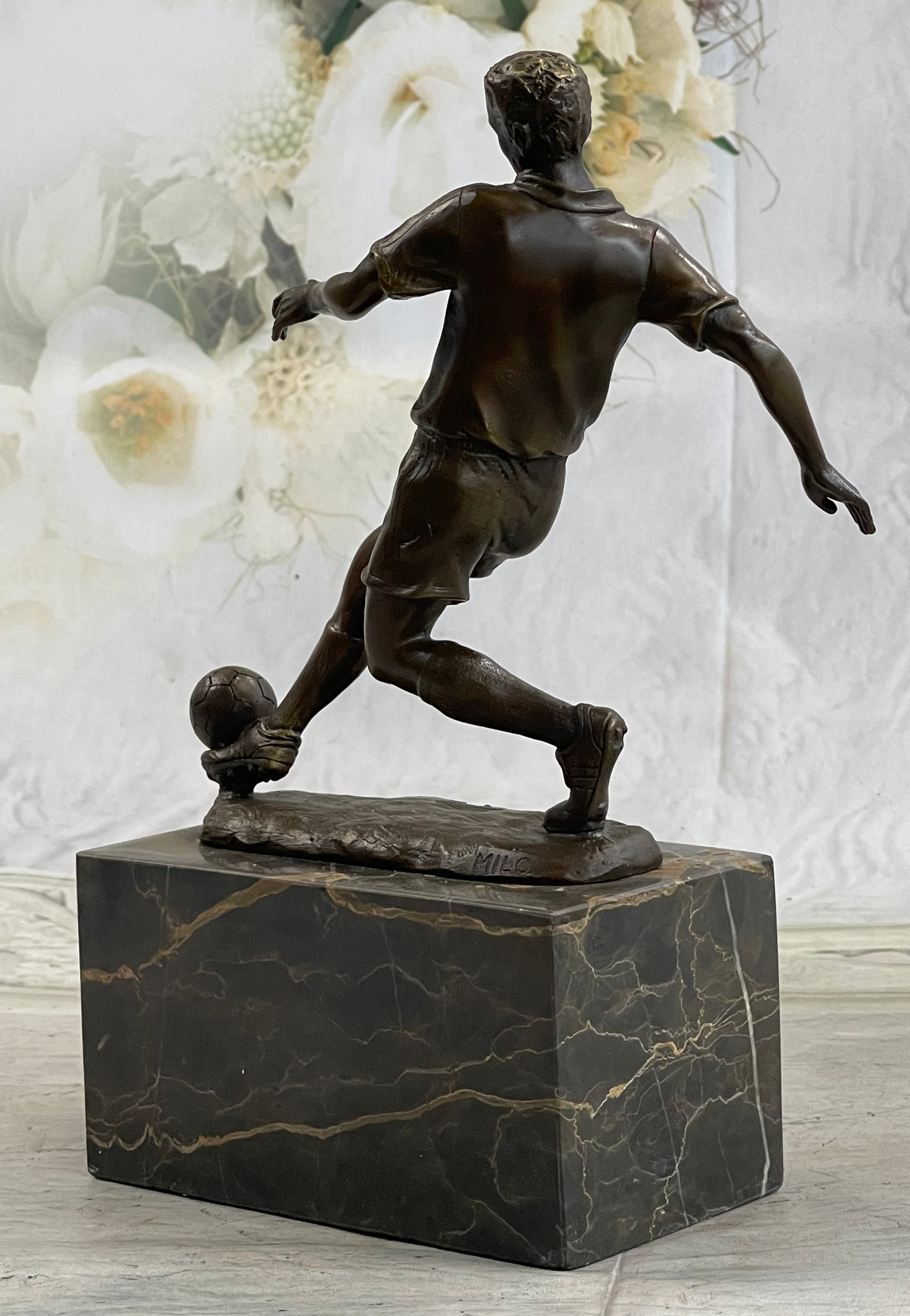 This magnificent piece is signed by the esteemed artist Milo, further authenticating its artistic value and uniqueness. Whether displayed in a sports-themed setting, a personal collection, or as a focal point in a cherished space, this bronze sculpture embodies the spirit of the game and pays homage to the remarkable skills of its players.