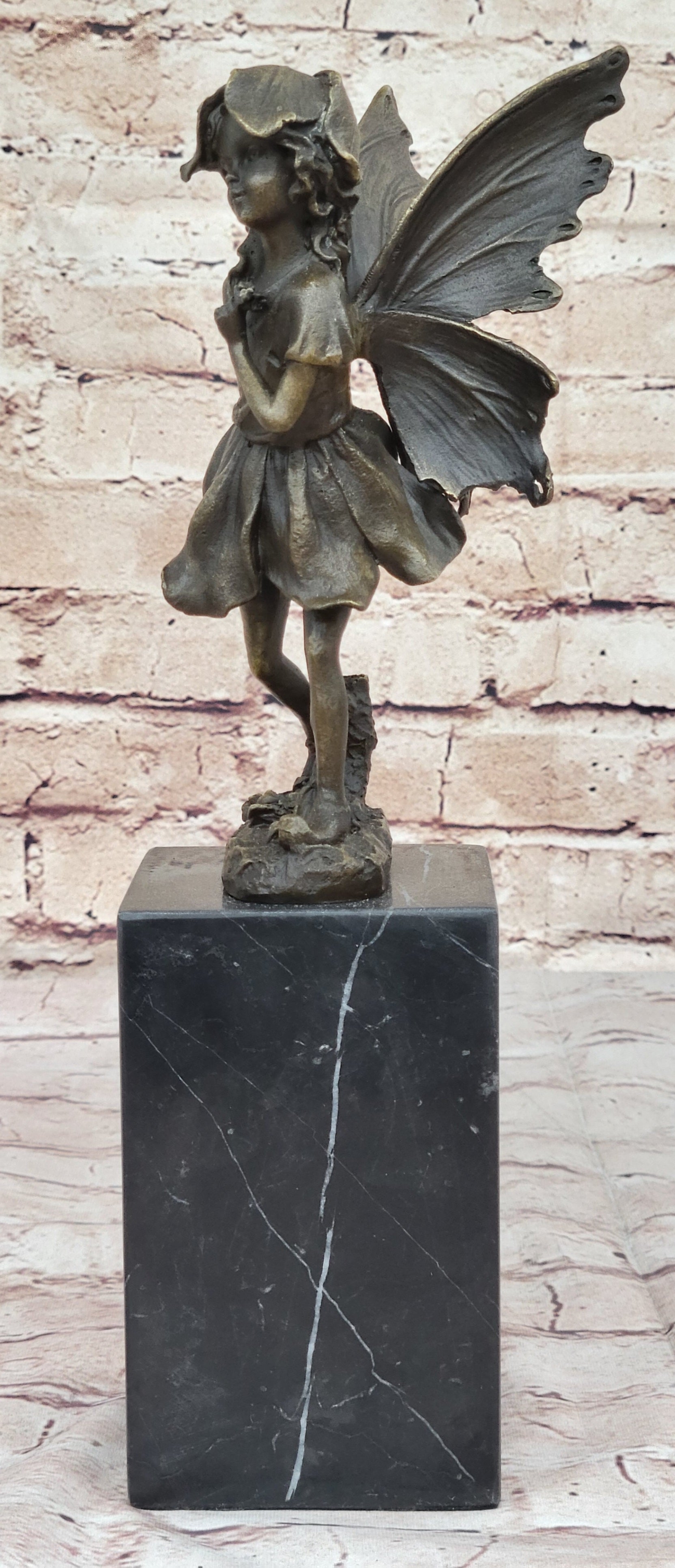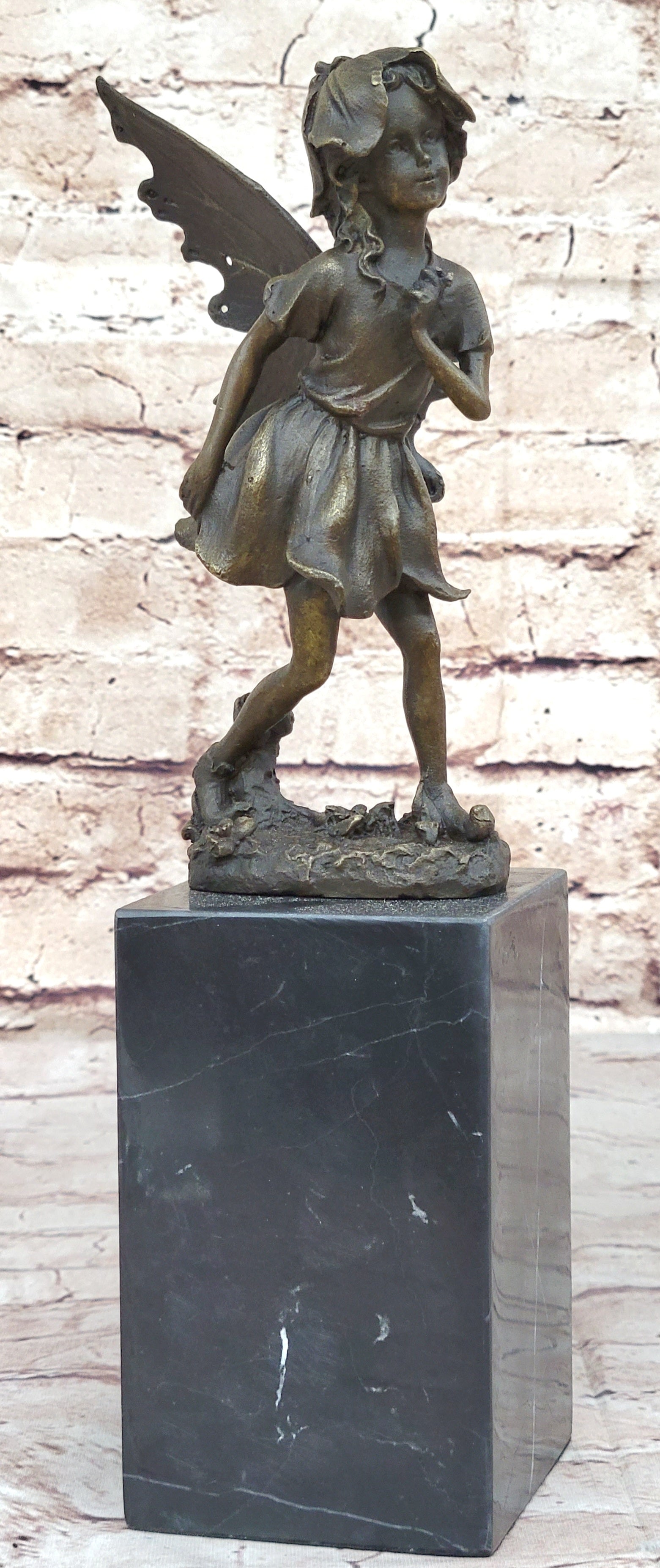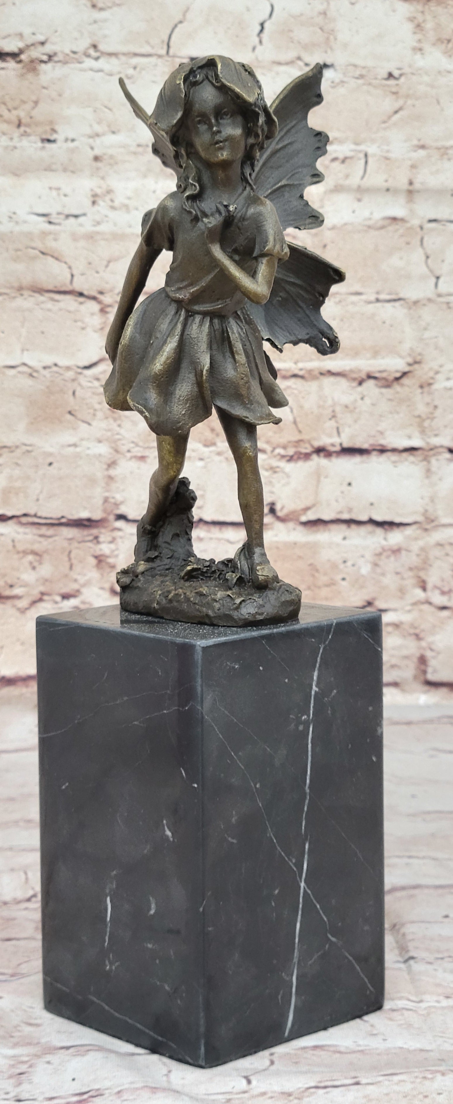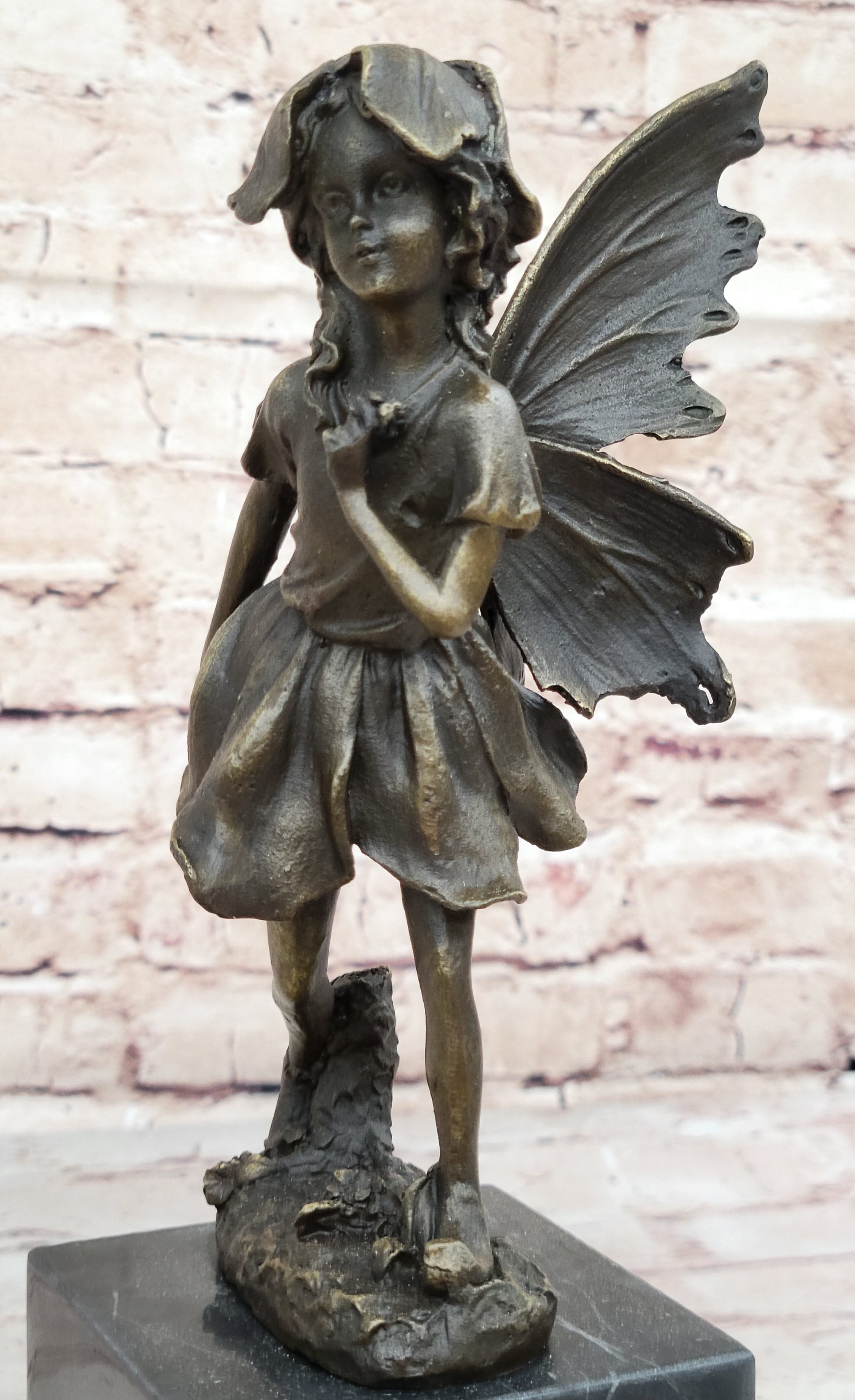 Handmade from 100% bronze, this sculpture was cast using the ancient "Lost Wax Method," ensuring exceptional detail and quality. It is mounted on a polished marble base, providing a sturdy and elegant foundation for the fairy's delicate form. Signed by the artist Milo, this piece is not only a beautiful decoration but also a testament to fine craftsmanship and artistic vision. This delightful fairy sculpture is sure to captivate hearts and spark the imagination, making it a treasured addition to any collection.Bronze Dimensions with Marble Base: Height 13" X Width 3"