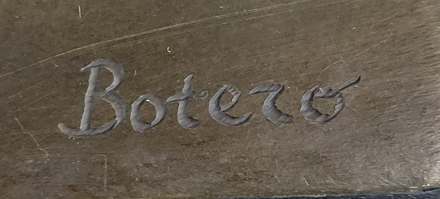 Discover an intriguing blend of modern art and animal representation in this captivating bronze sculpture by the esteemed Colombian artist, Botero. This exquisite piece portrays a robust cat seated upon a petite bronze base. Botero's masterful touch is evident as he simplifies the feline form into distinct geometric shapes, crafting a playful yet unmistakable tribute to the cat's essence. The plump bronze figure exudes a charm reminiscent of a ninepin, engaging viewers with its whimsical character. Crafted entirely from bronze, this sculpture bears the signature of its creator, Botero, a mark of authenticity and artistic excellence.