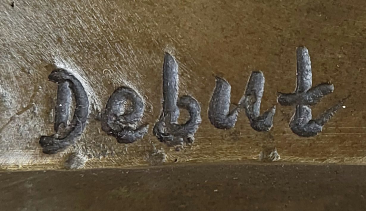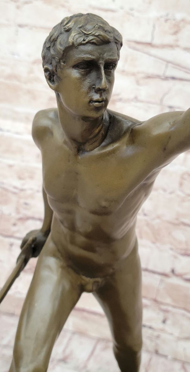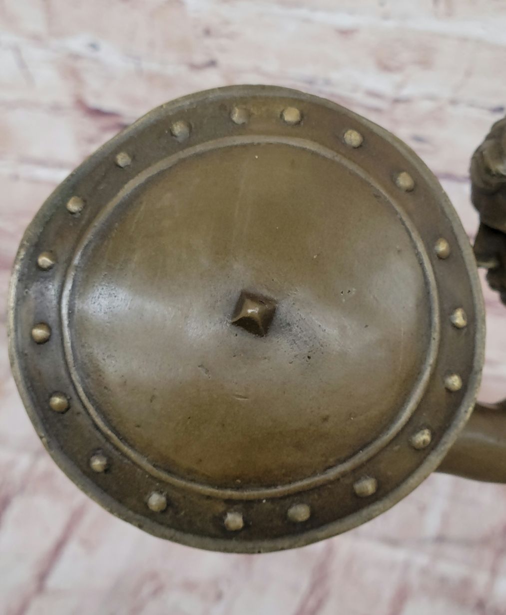 Perched upon a sophisticated Beige marble base, this sculpture stands as a symbol of its authenticity. The artist Debut's signature signifies its unique origin, attesting to the artistry and craftsmanship that went into its creation. As a collector's item or a focal point in any space, this sculpture offers a captivating glimpse into the ancient world of training, discipline, and the enduring spirit of the gladiator.Bronze Dimensions with Marble Base: Height 17" X Width 21"