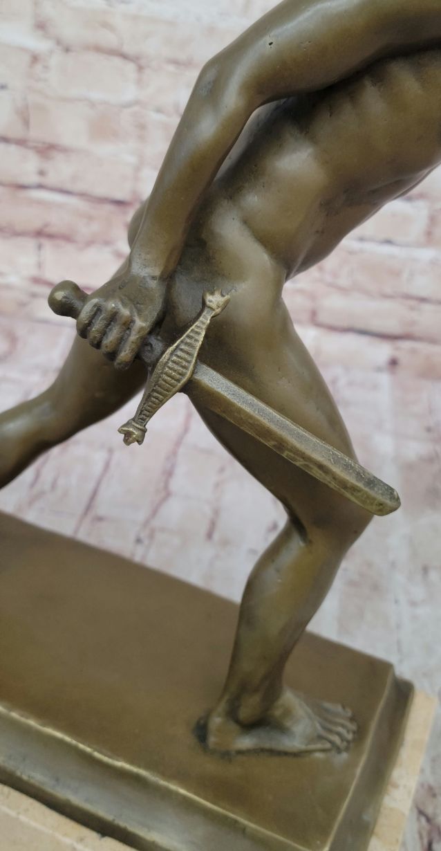 Step into the past with this mesmerizing bronze sculpture that transports you to a training courtyard of ancient times. Here, a nude gladiator undergoes rigorous preparation under the guidance of his seasoned instructor, often a retired gladiator himself. In this intense setting, the novice learns the art of defense and attack, skills vital for survival in the arena. The sculpture captures the essence of the gladiator's unwavering commitment, even extending to readiness for a stoic and unyielding fate in the face of danger.
