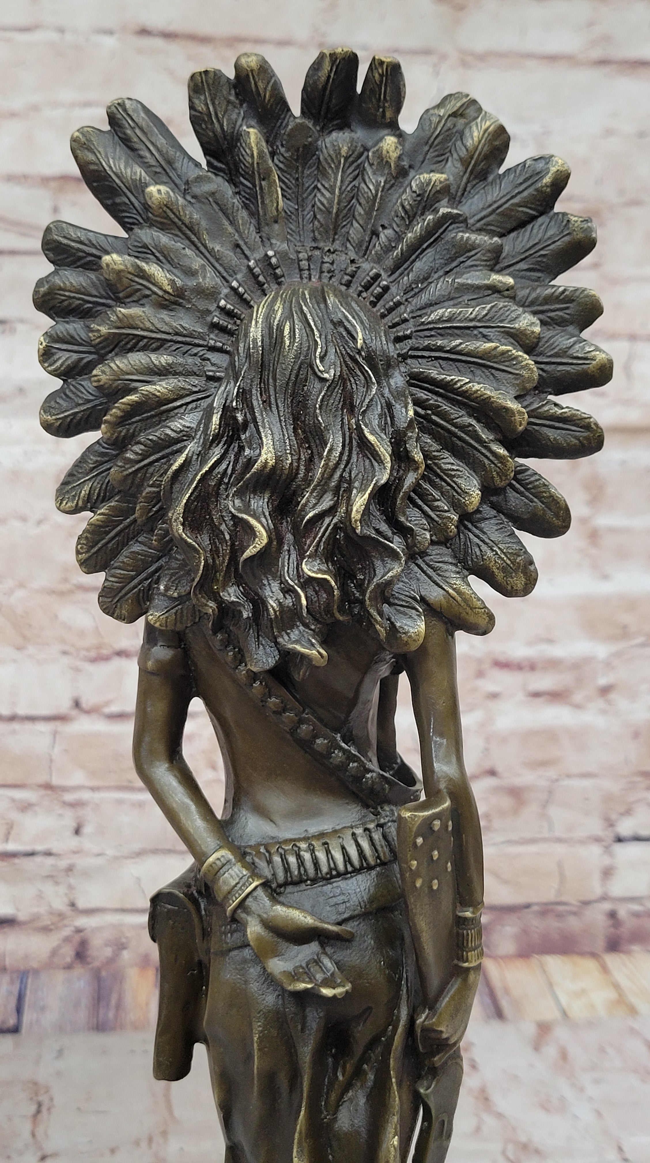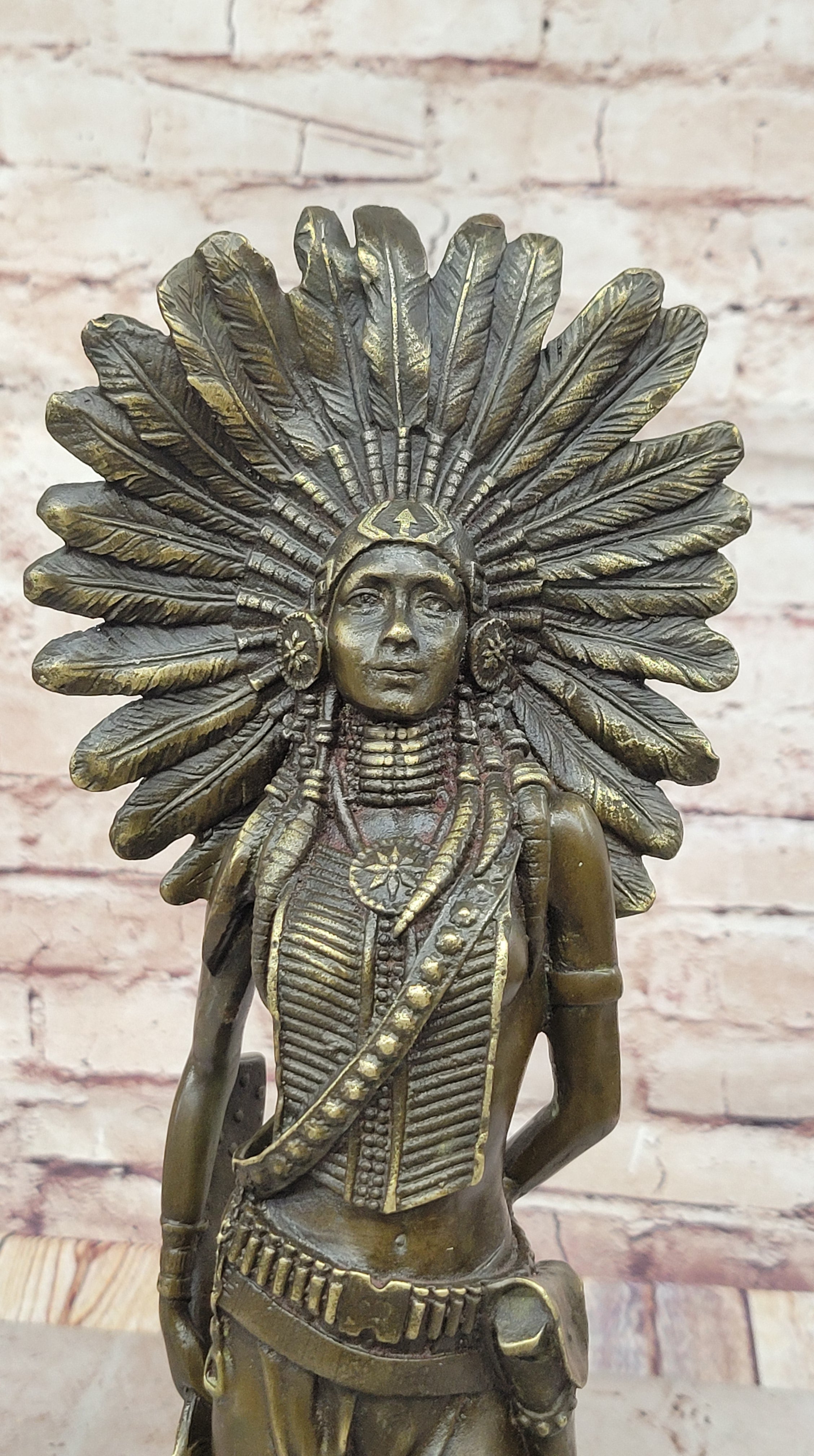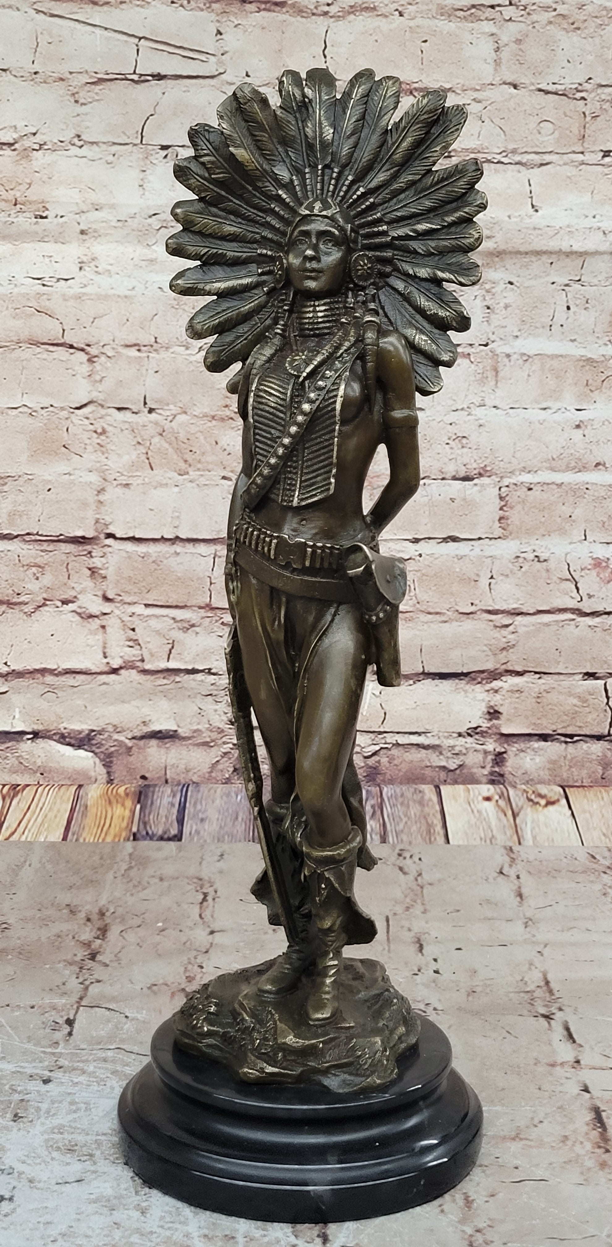 Female Native American Indian Warrior in Feathered Headdress Bronze Statue Sculpture Figure