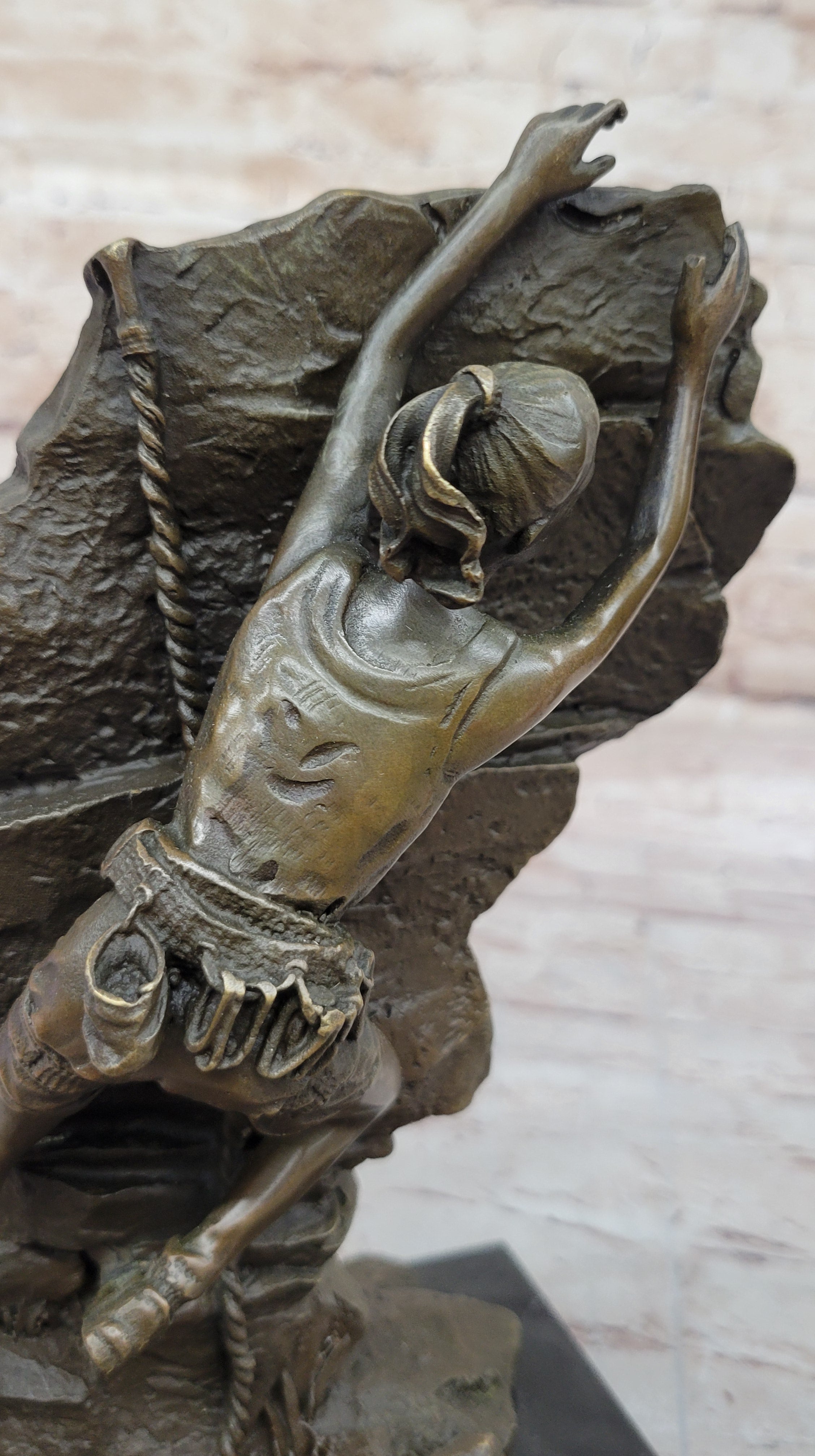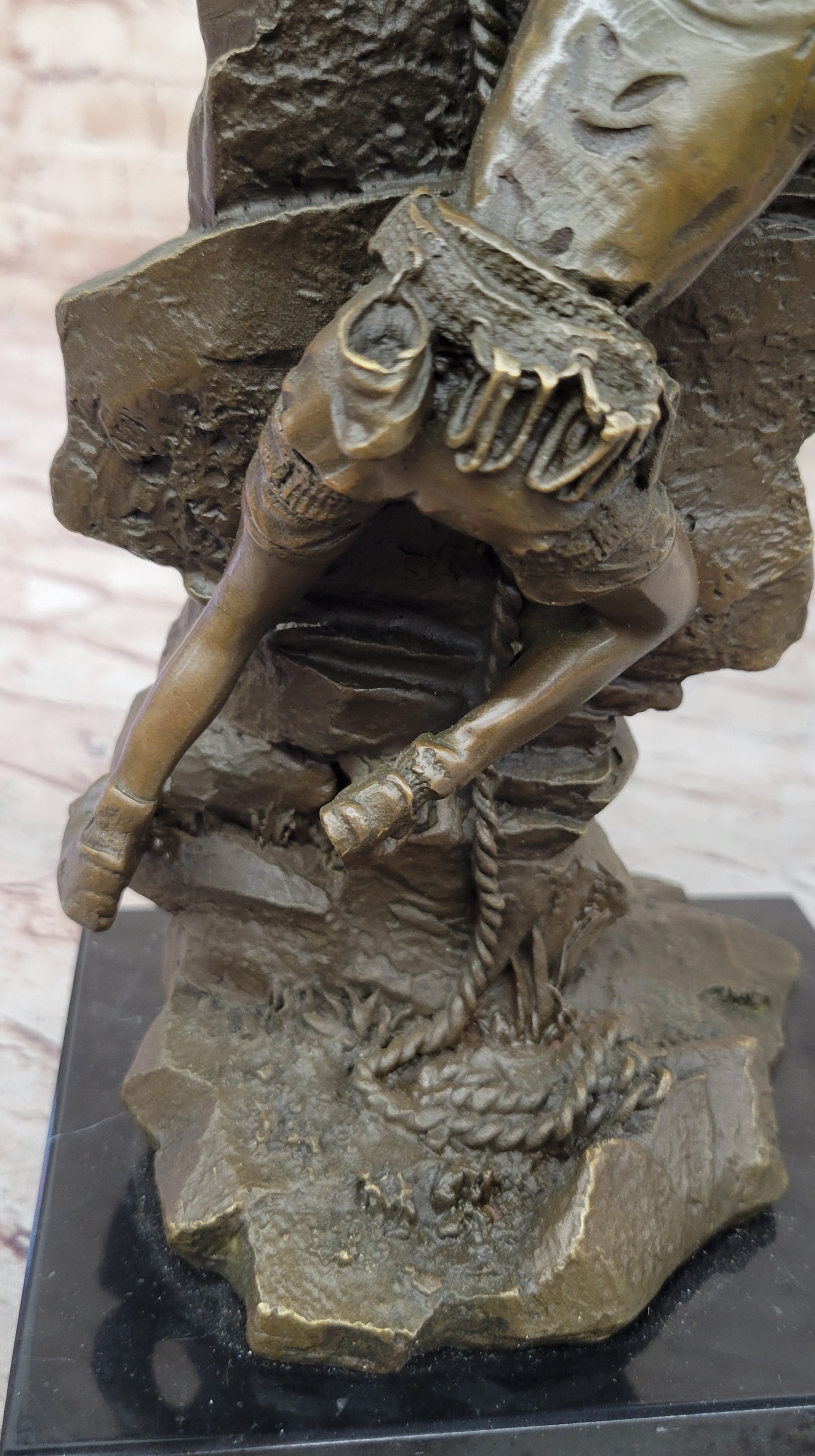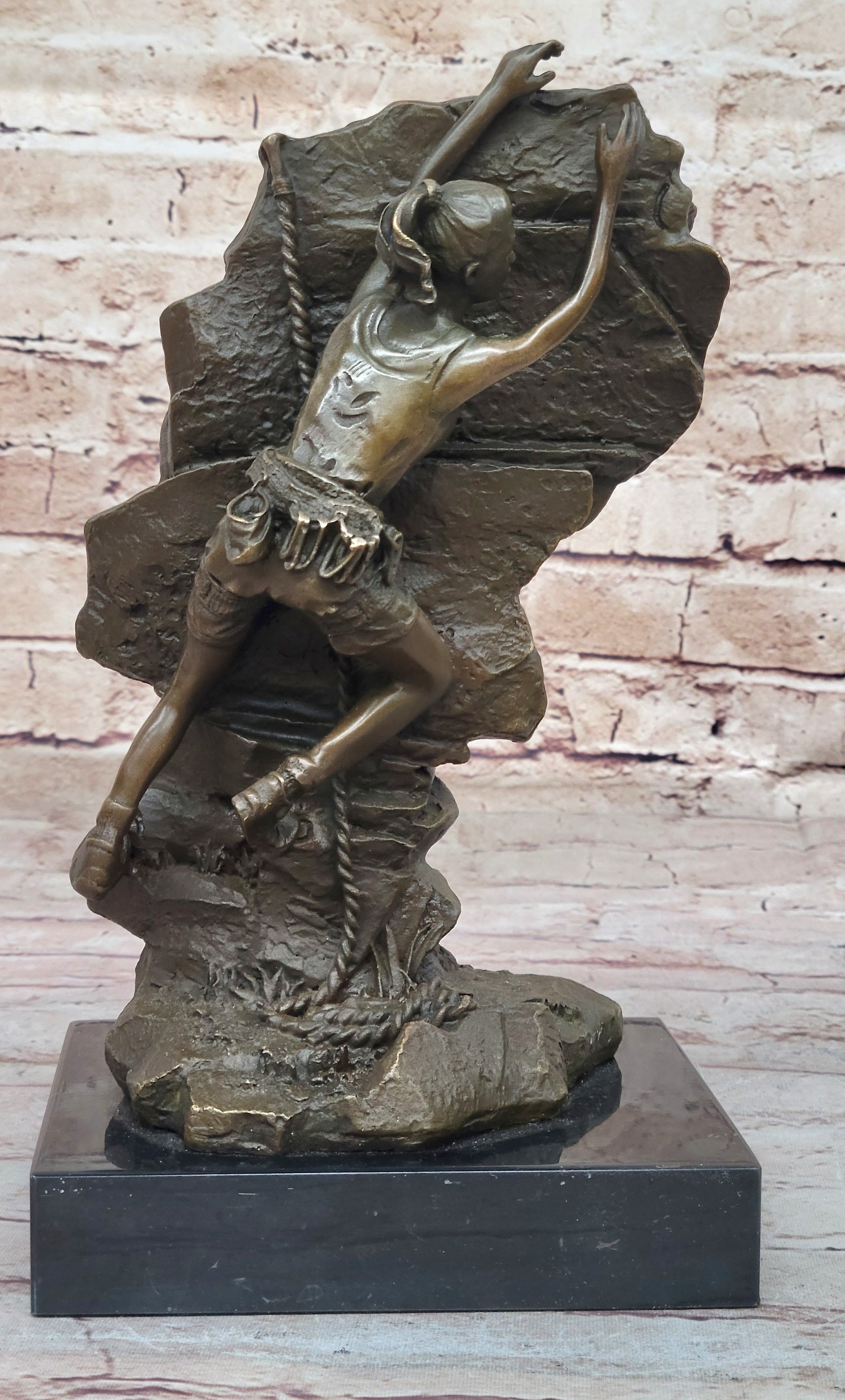 Set on a black marble base and finished with a rich brown patina, this sculpture not only showcases the beauty of the female form but also pays homage to the adventurous spirit of rock climbing. Mario Nick's expertise shines through in this stunning piece, making it a standout addition to any art collection.