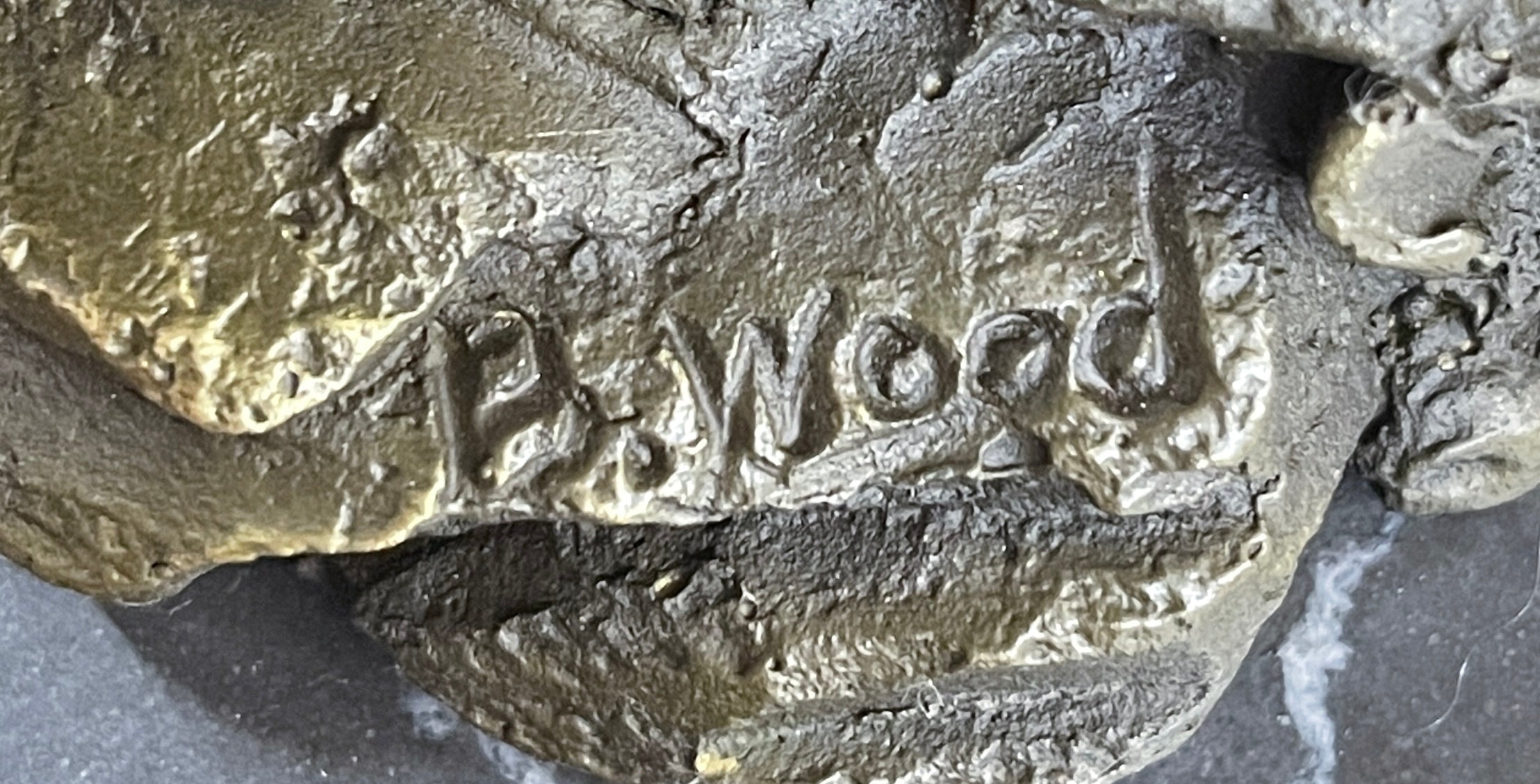 The sculpture is mounted on a round black marble base, providing a solid foundation that accentuates its visual impact. To authenticate its origin and artistic value, it proudly bears the signature of the acclaimed artist, B. Wood.