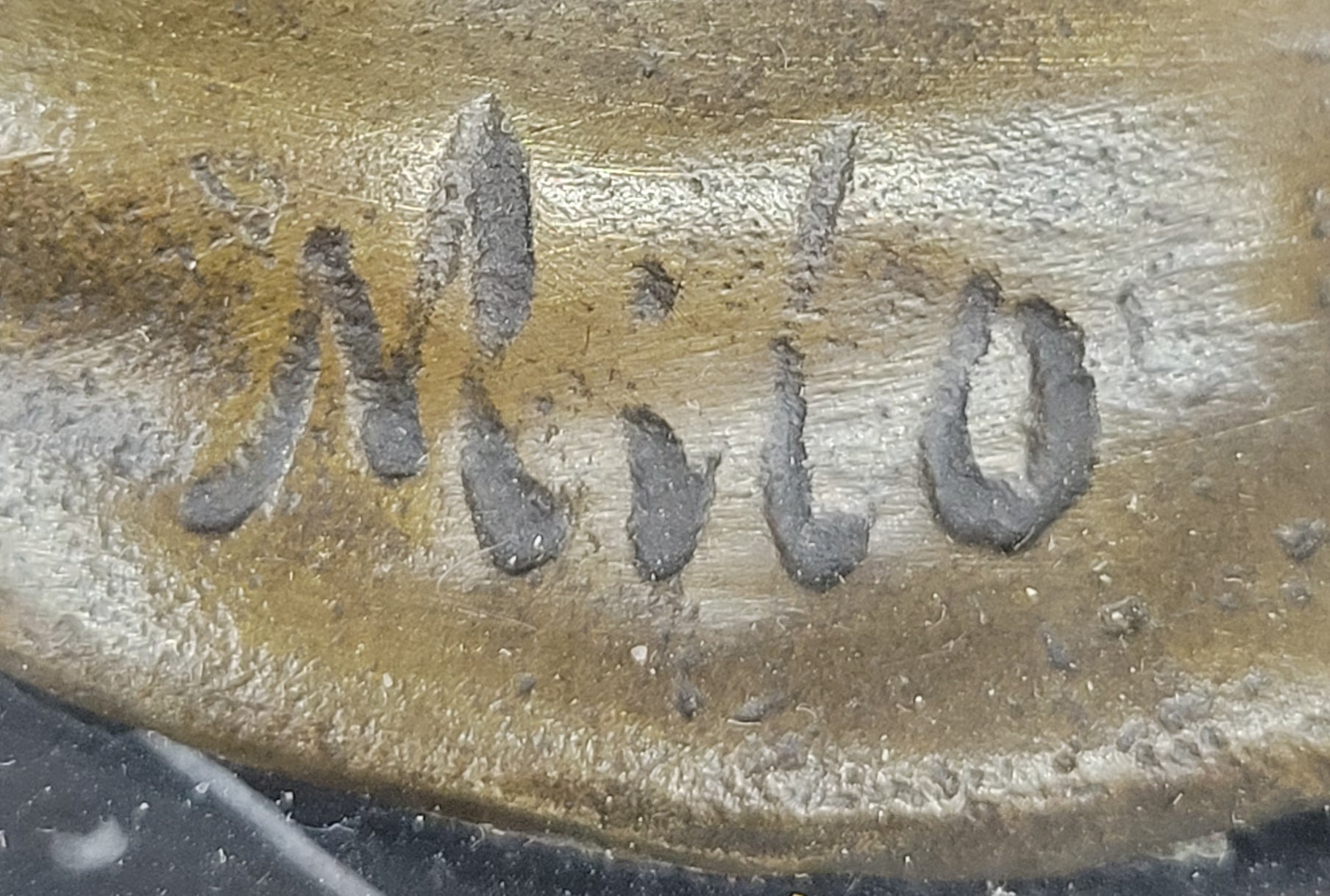 Mounted on a smooth black round marble base, this figural candlestick serves as both a functional and decorative artwork. Signed by the renowned Portuguese artist Miguel Lopez, also known as Milo, it stands as a stunning example of fine craftsmanship and elegant design — perfect for collectors and lovers of classical bronze art.Bronze Dimensions with Marble Base: Height 13" X Width 6"