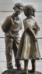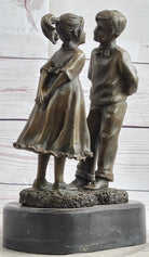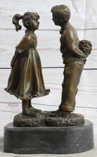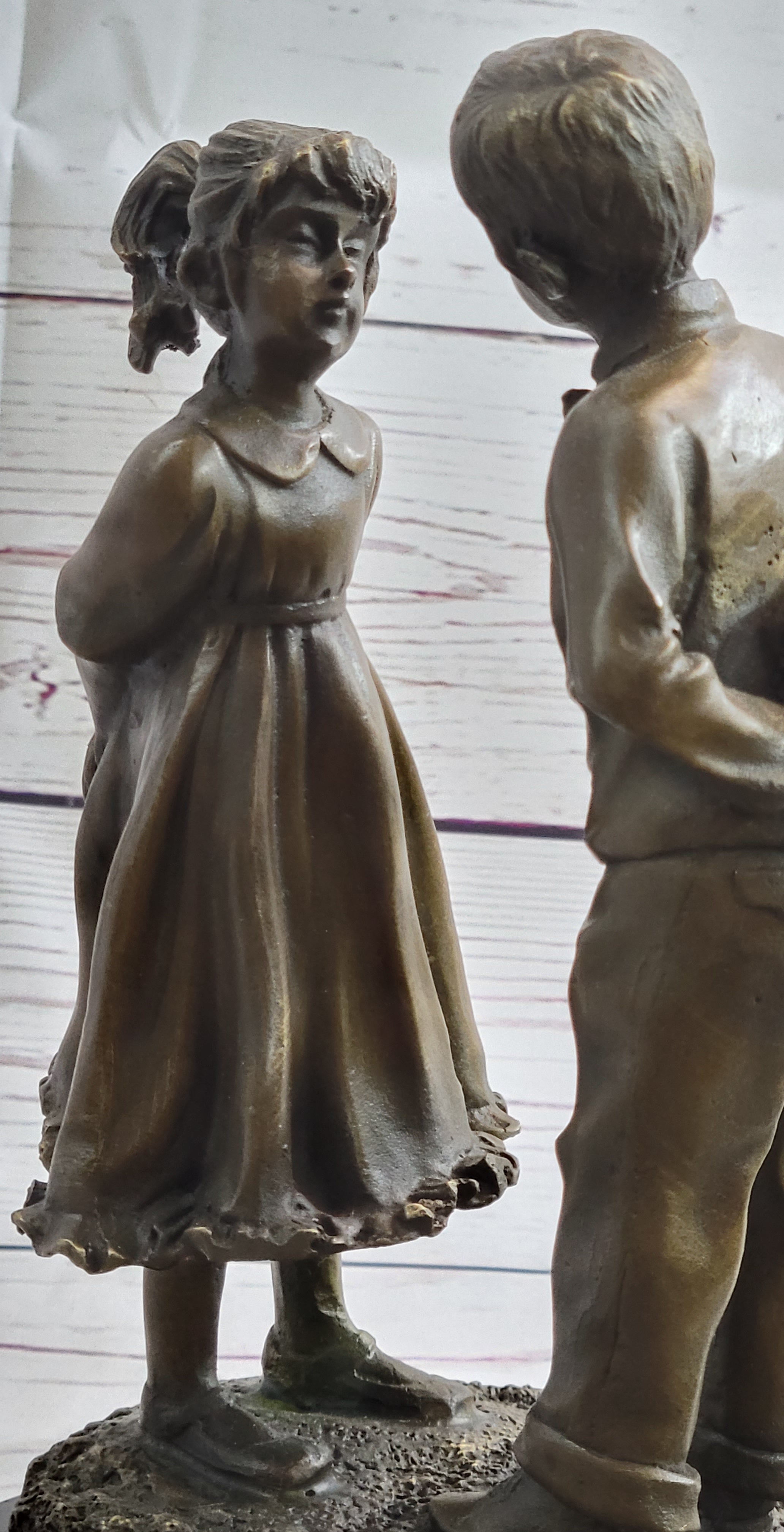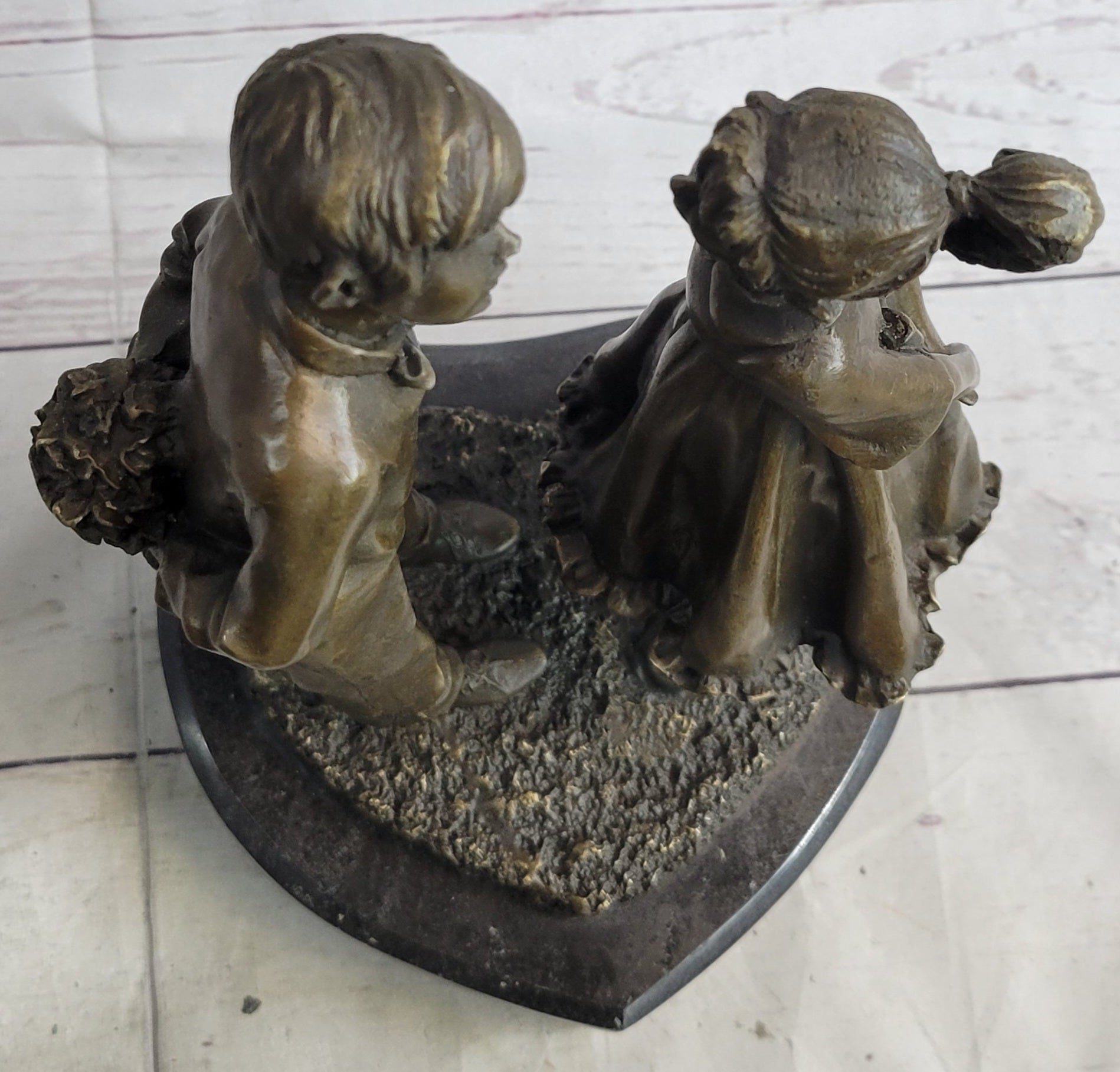 First Kiss Love Romance Children Bronze Sculpture Figure on Heart Shaped Marble Base
