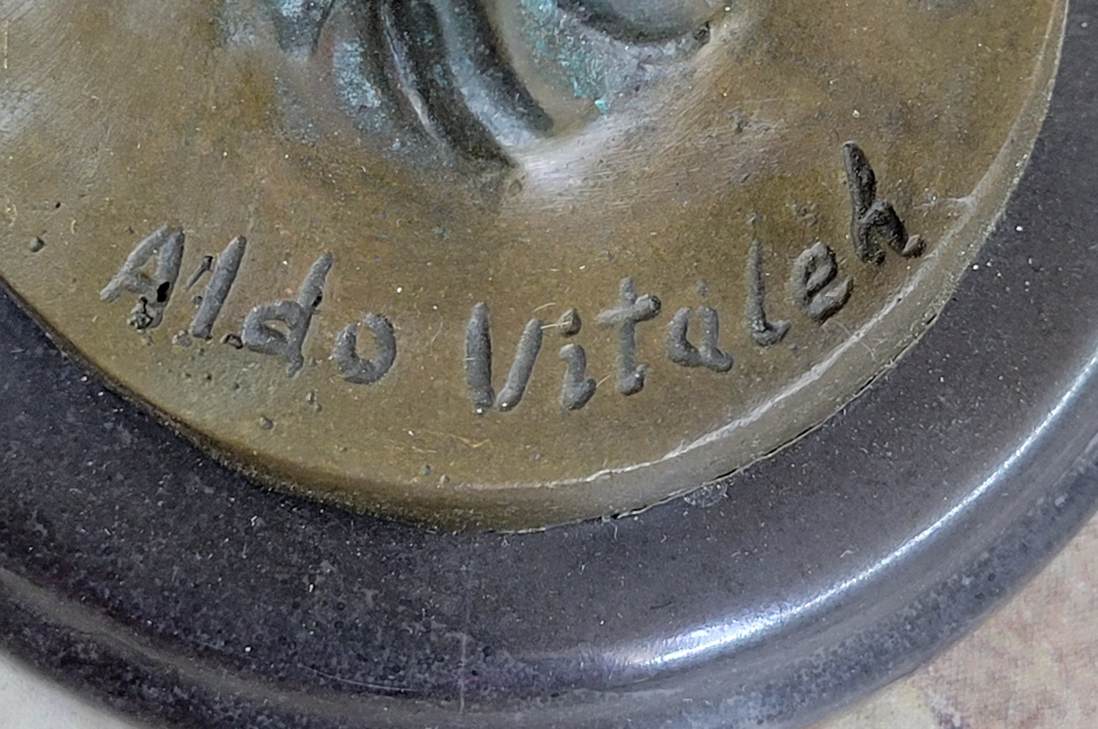 Using the time-honored technique of lost wax casting, the artist has meticulously crafted the sculpture, infusing it with a rich brown patina finish that beautifully enhances the natural tones of the figure's skin. Poised on a sleek black marble base and adorned with the distinctive signature of Aldo Vitaleh, this extraordinary piece embodies the seamless fusion of artistic expression and the timeless elegance of the human spirit, serving as a testament to the enduring beauty and vitality inherent in the art of sculpture.Bronze Dimensions with Marble Base: Height 18 1/2" X Width11"