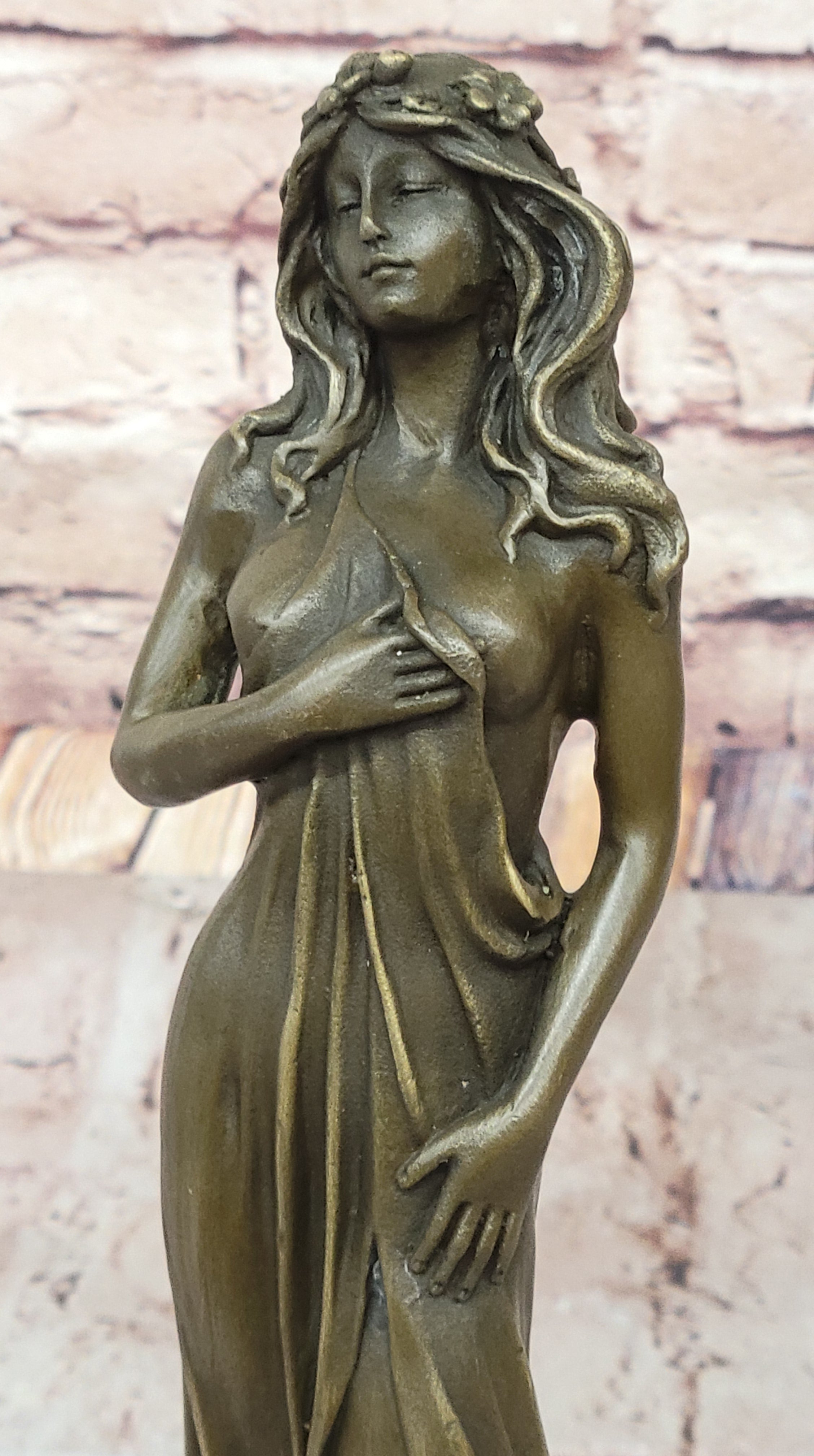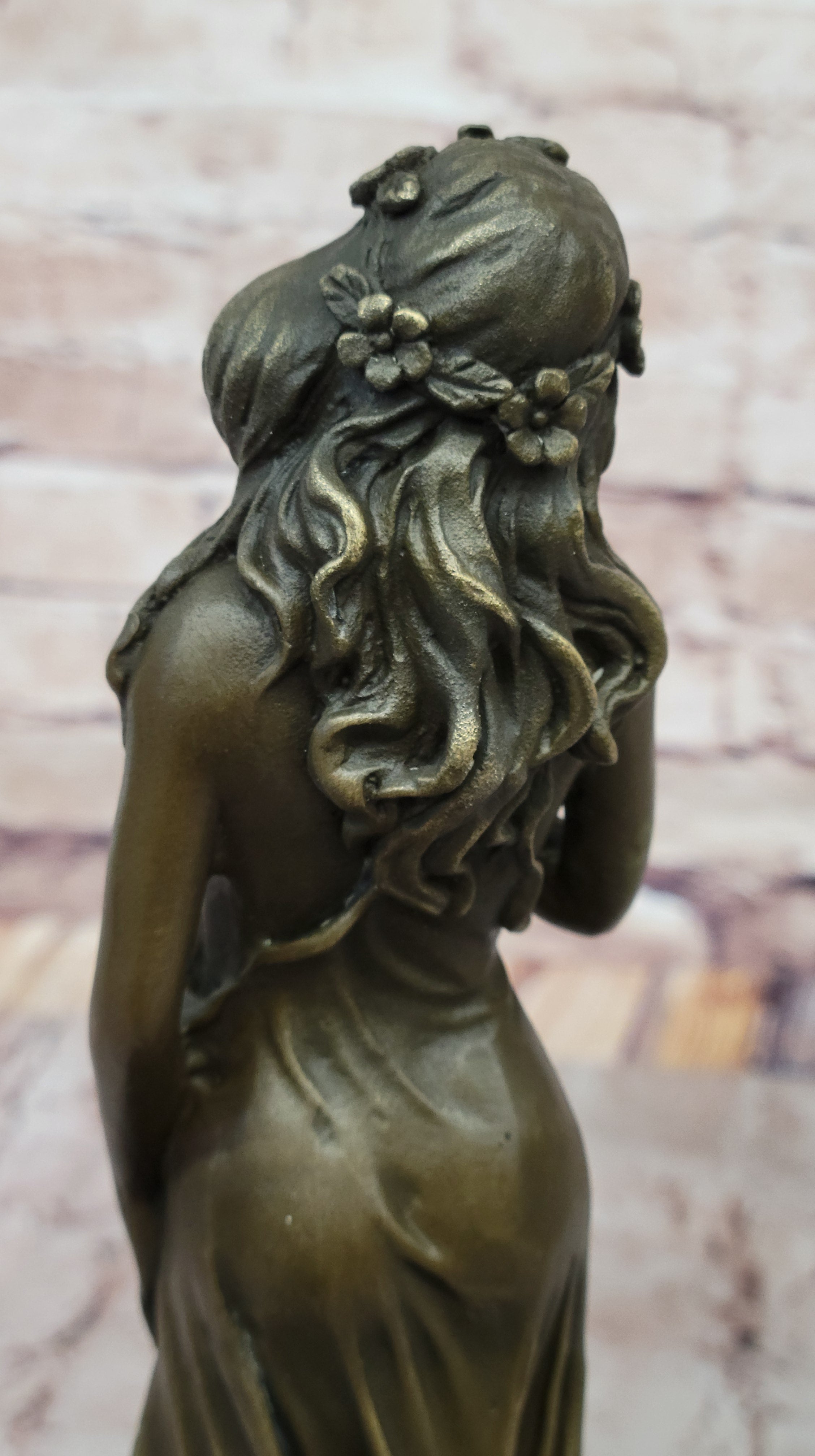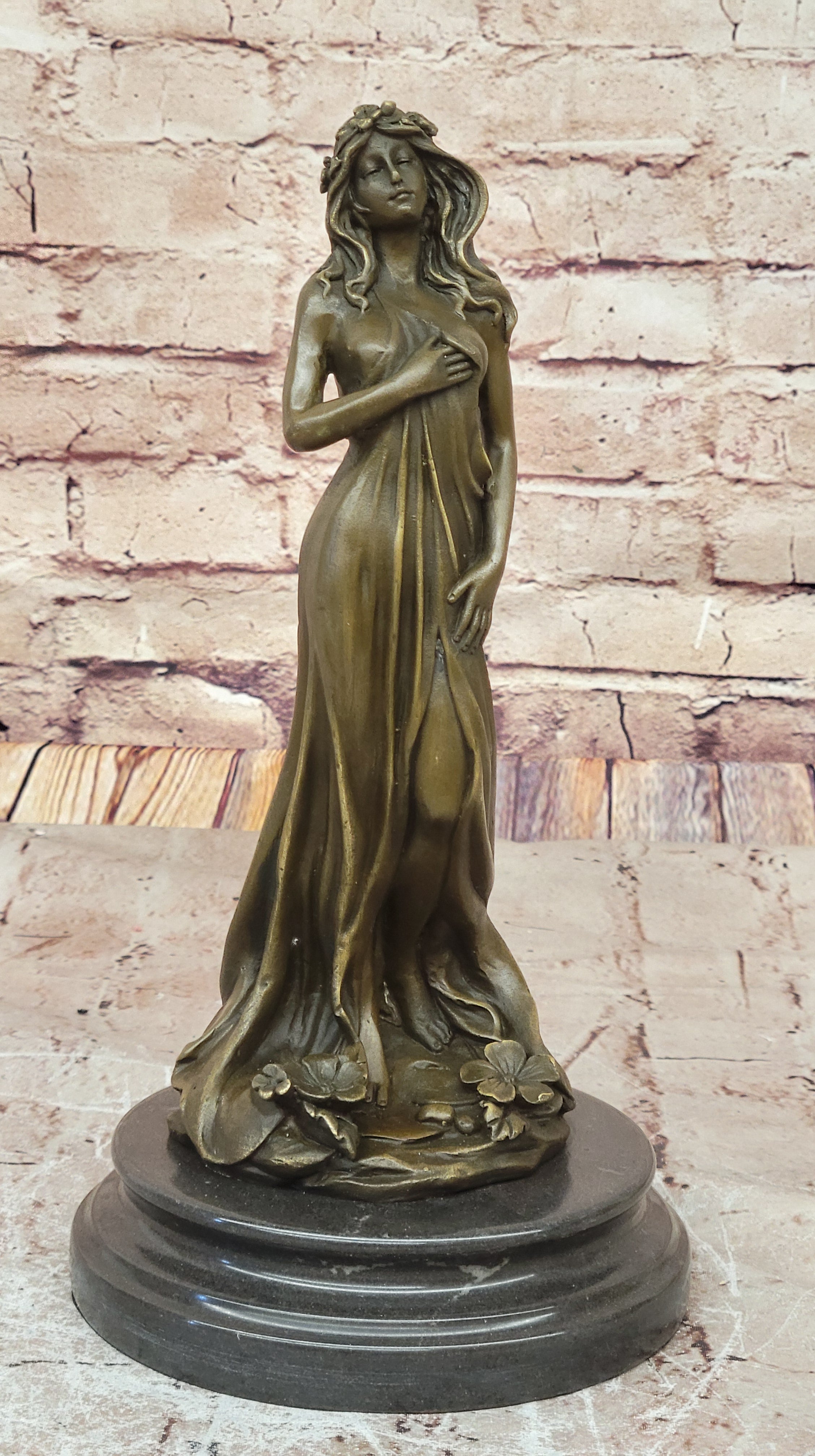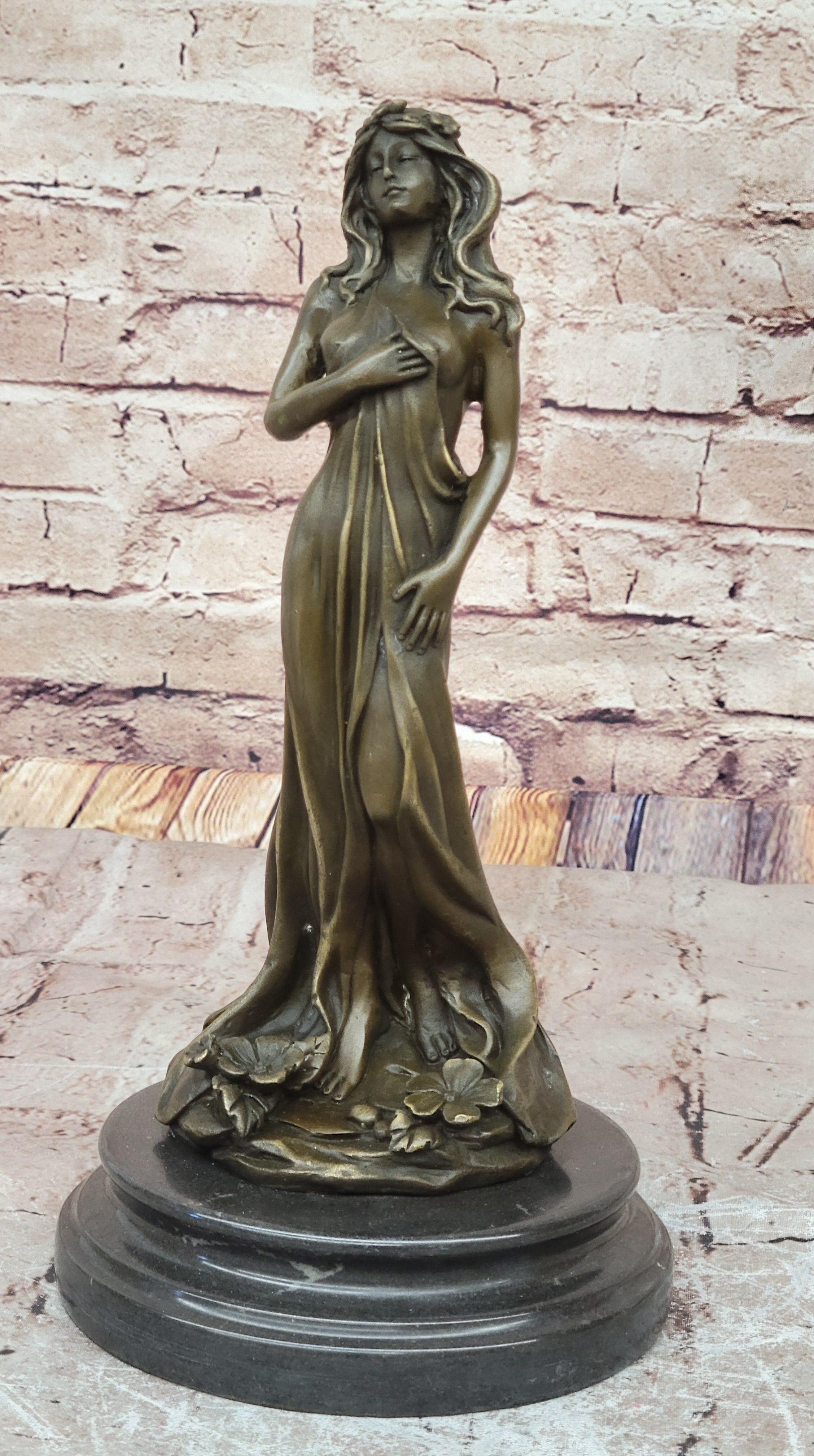This captivating sculpture, meticulously crafted in brown patina, embodies the ancient artistry of lost-wax casting. Every detail, from the intricate folds of her dress to the blossoms adorning her hips, is brought to life with impeccable precision.