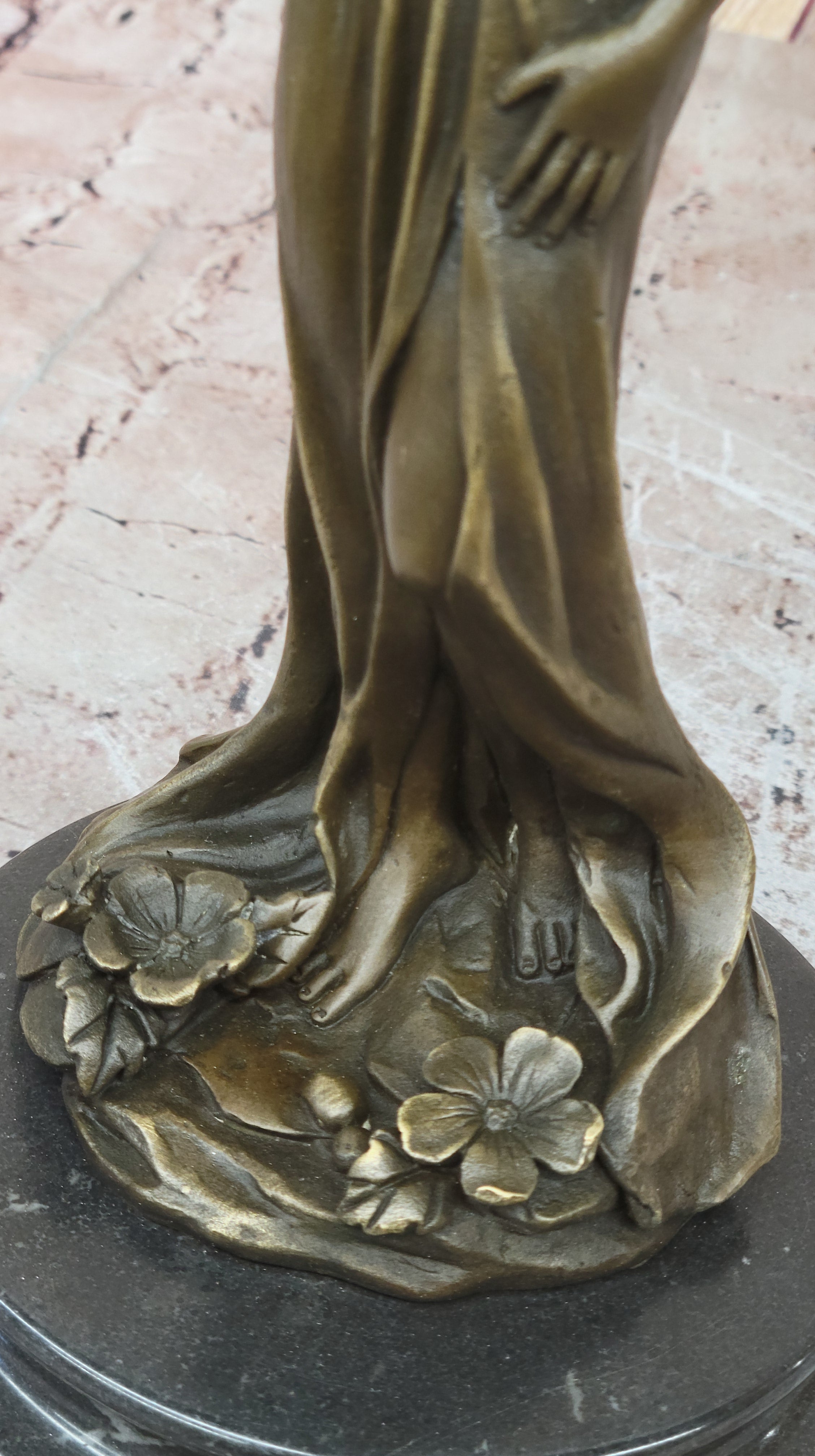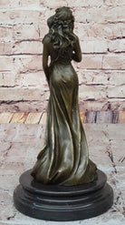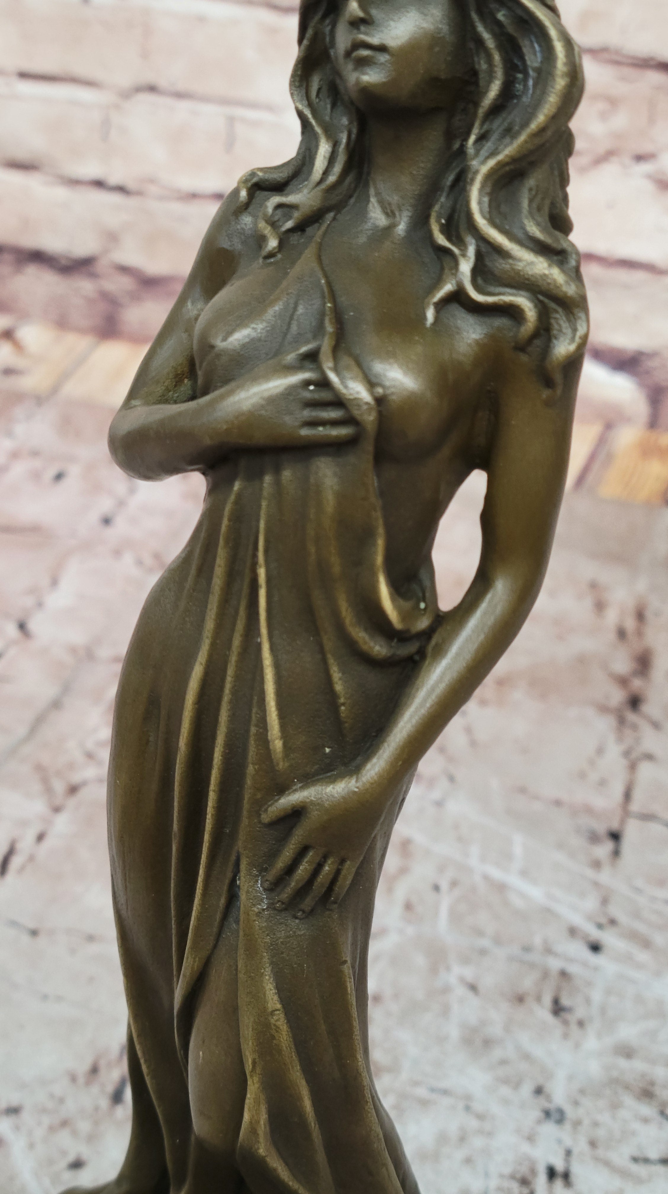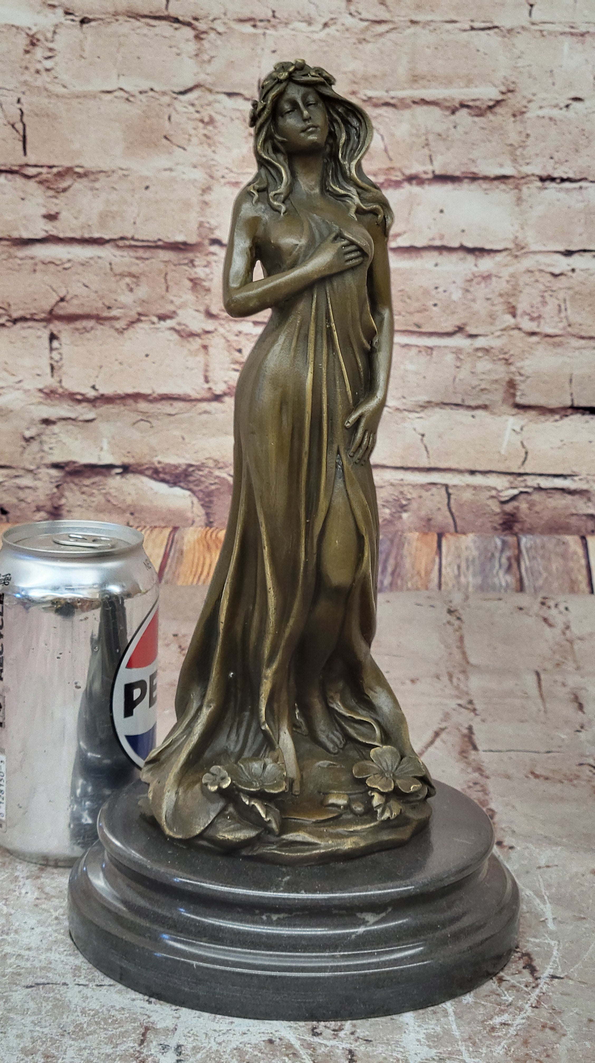 This captivating sculpture, meticulously crafted in brown patina, embodies the ancient artistry of lost-wax casting. Every detail, from the intricate folds of her dress to the blossoms adorning her hips, is brought to life with impeccable precision.
