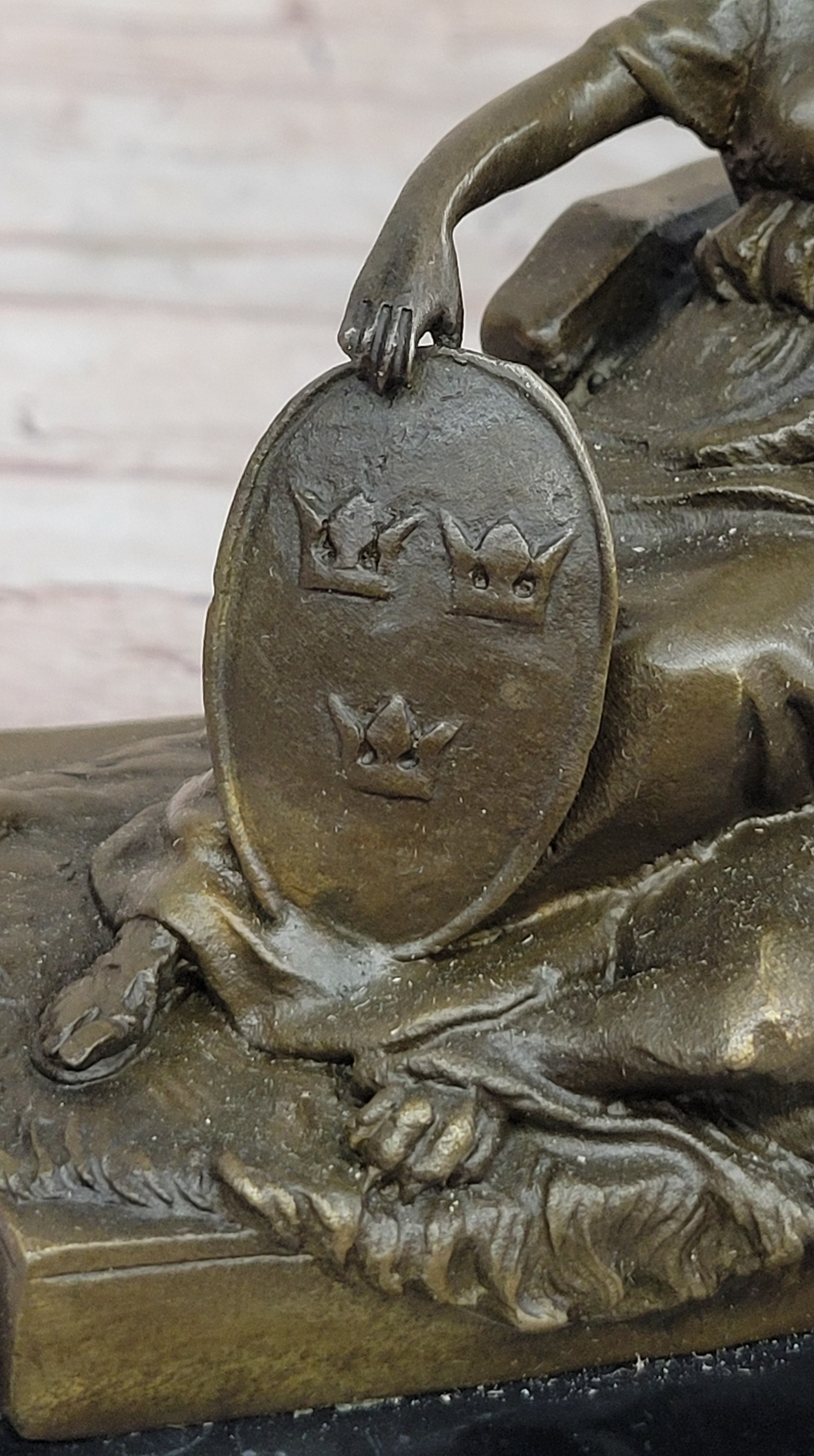 In this stunning bronze sculpture, the noble maiden exudes regal grace as she sits in a chair, holding a shield and a cornucopia. Her gaze, fixed in a portrait-worthy pose, is accompanied by the majestic presence of a lion at her feet, creating a combined air of majesty. The intricate details of the sculpture showcase the artist Milo's exceptional skill, capturing the essence of nobility and strength.
