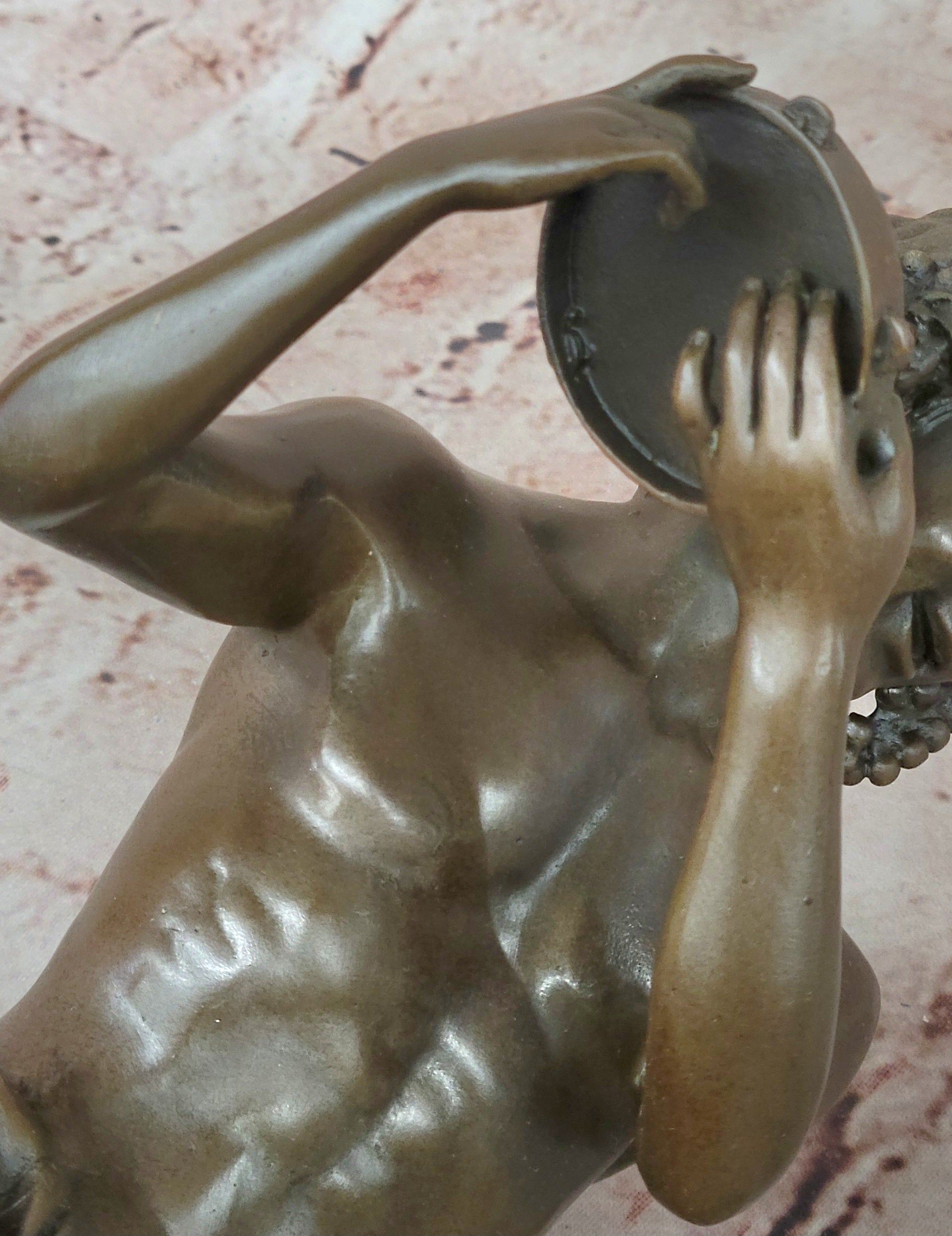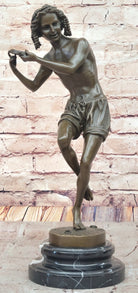 This exquisite bronze sculpture was created using the time-honored "Lost Wax Method" and finished with a two-tone brown patina that enhances its intricate details. Mounted on a raised beveled black marble base, this 100% bronze piece is handmade and signed by the artist F. Duret, making it a timeless addition to any art collection.Bronze Dimensions with Marble Base: Height 16" x Width 6"