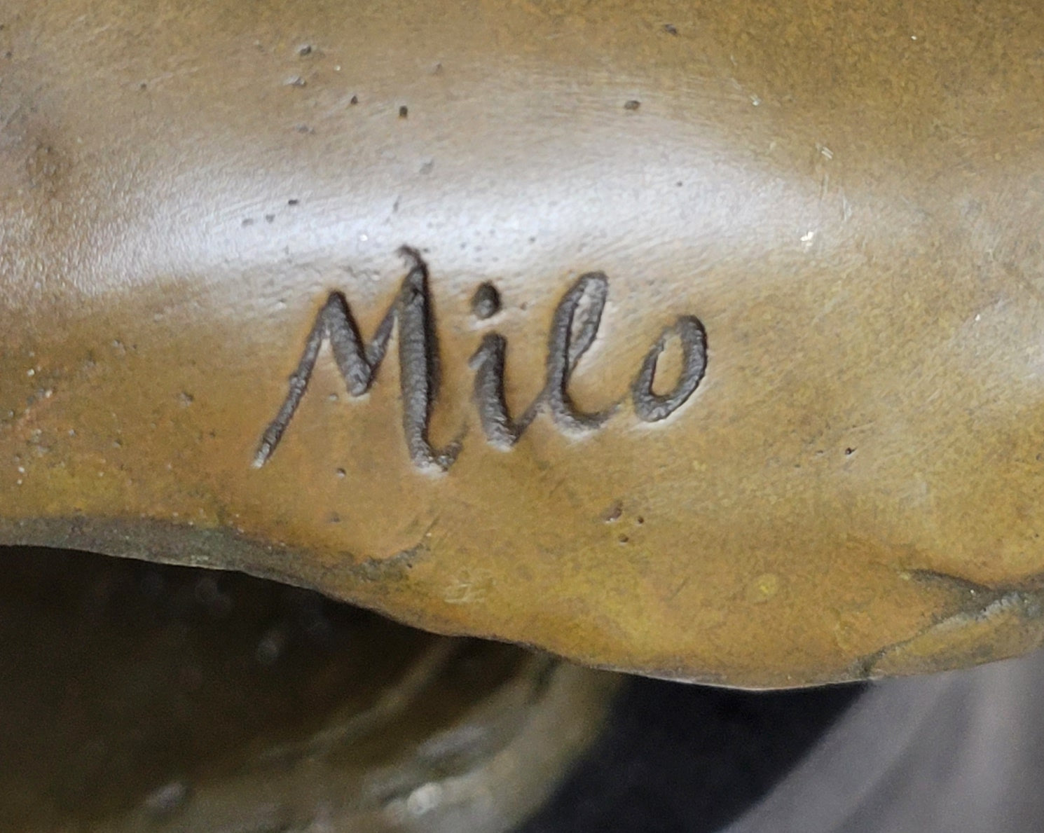 Whether showcased indoors or gracing an outdoor space, this timeless sculpture leaves an indelible impression. Resting atop a sleek black marble base, it exudes elegance and is adorned with the signature of the esteemed artist, Milo, ensuring its authenticity and enduring value.