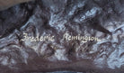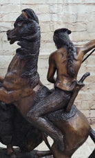 Experience the captivating narrative of the Native American Hunter immortalized in this stunning bronze sculpture, capturing a powerful moment as he bravely engages a charging buffalo on his trusted steed. Poised with remarkable dexterity, the hunter, adorned in a striking headband embellished with feathers, a tooth necklace, intricately embroidered pants, and sturdy moccasins, exudes an aura of strength and reverence for nature. His resolute gaze reflects an unwavering confidence, underscoring his expertise in both hunting and the art of war. With his horse rearing up in response to the buffalo's charge, the hunter seizes the opportune moment, brandishing a skillfully crafted spear and poised to deliver a swift and precise strike that will secure sustenance for his people. Meticulously handcrafted in 100% bronze and forged using the time-honored "Lost Wax Method," this sculpture boasts an exquisite two-tone brown patina, adding depth and dimension to its intricate detailing and lifelike portrayal. The artist's signature, C.M. Russell, serves as a testament to the sculpture's impeccable craftsmanship and homage to the legacy of the American West.